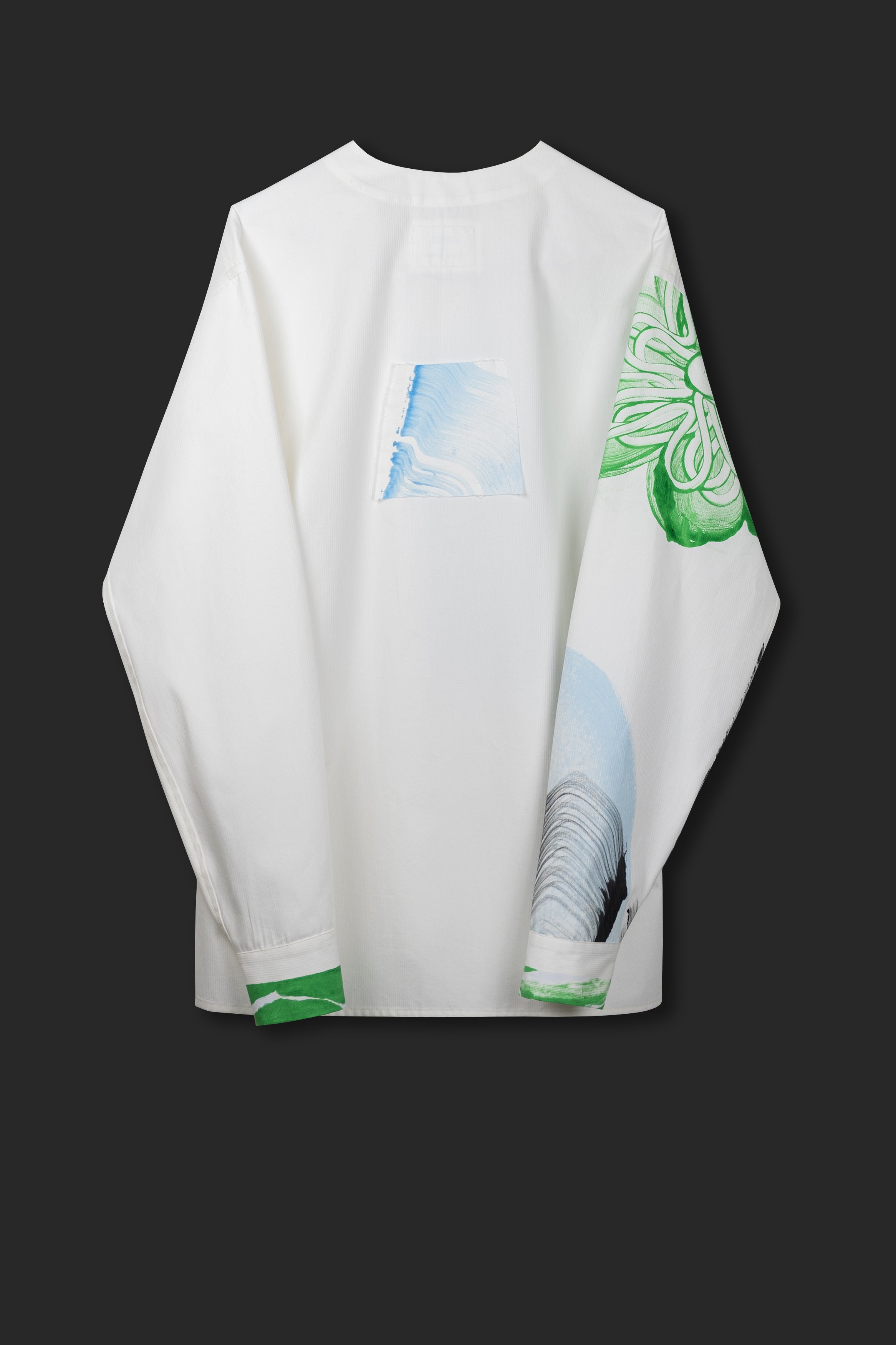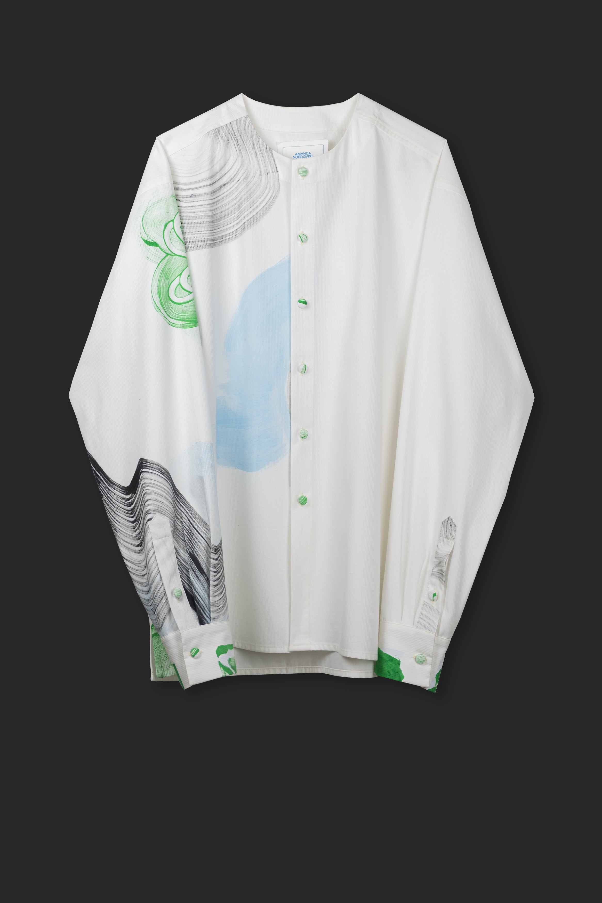 The shirt has been made from a semi-weight textured woven cotton. From Athens to Stockholm, the fabric travelled with us during our pop-up days there. Talented artist and friend Amanda Nordqvist perceived the fabric as a canvas, with the intention to create an artwork and not a clothing pattern. Afterwards, we brought it back to Athens and worked on this process for more than months in order to shape 16 one-of-a-kind shirts. We cut, sewed and finished them as if they were an abstract puzzle. Also, we created fabric buttons from the fabric scraps, all of them different from each other as such all the shirts are. Each and every garment is one-off and has its own drawings and lines. You can read more about Amanda here