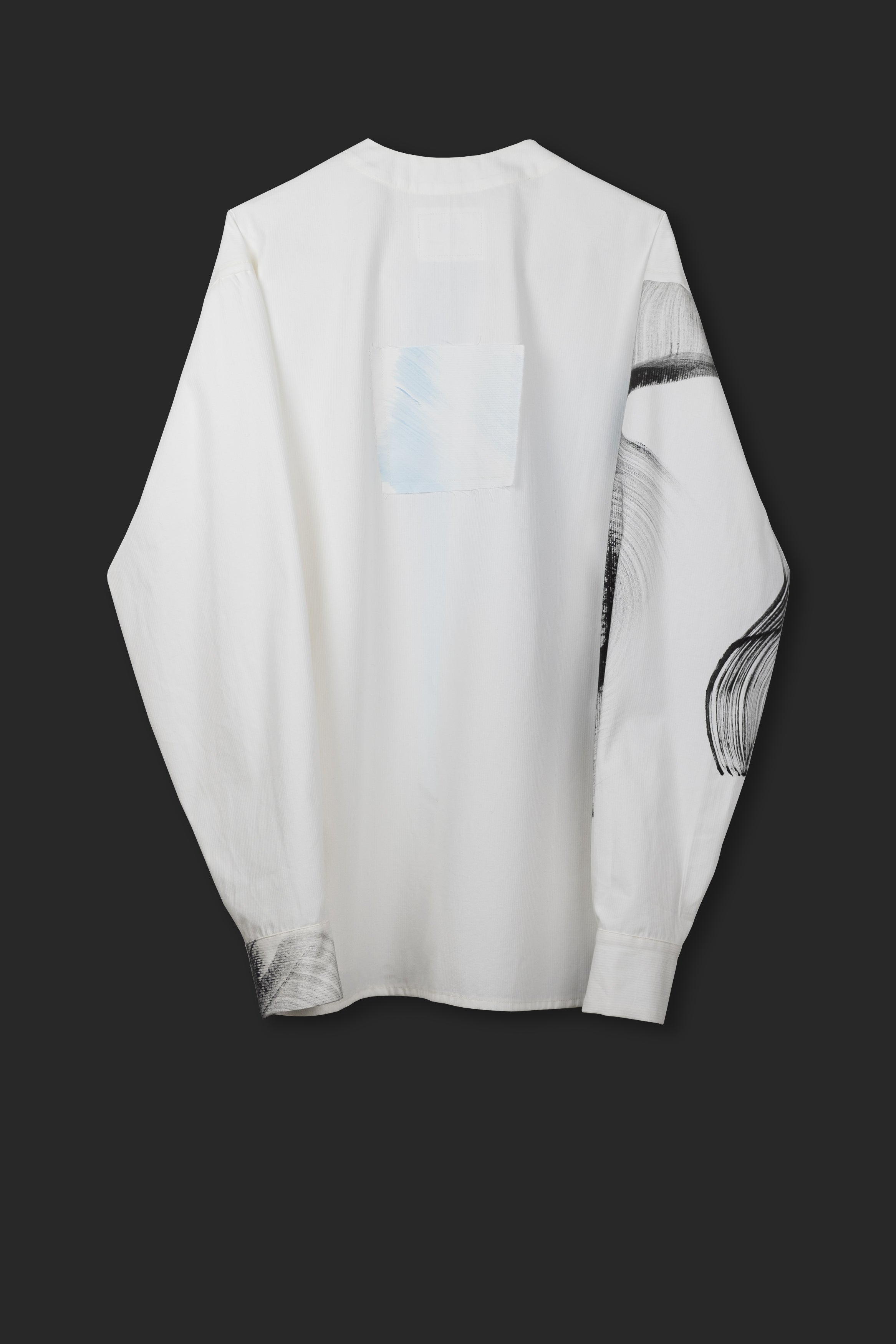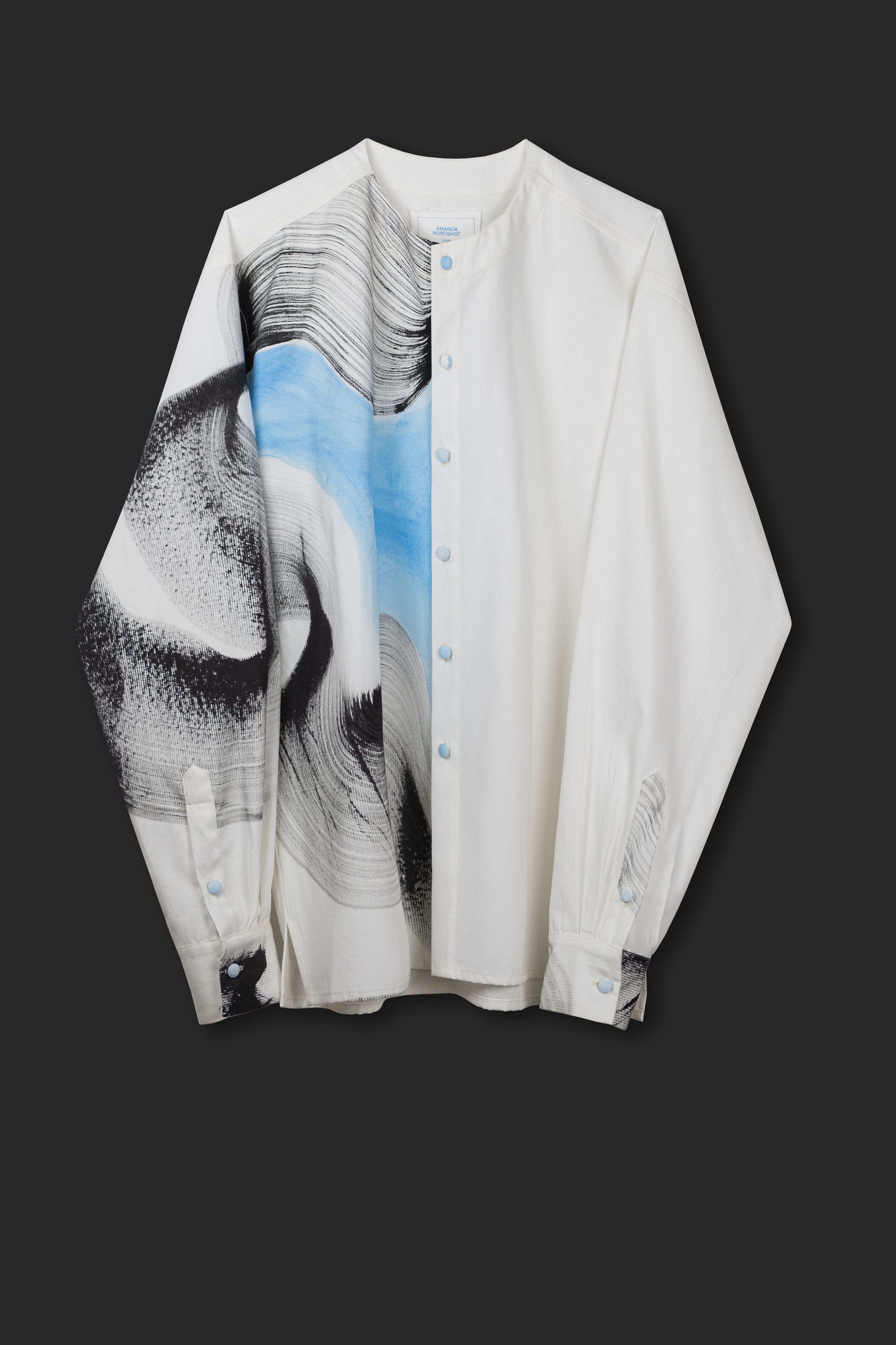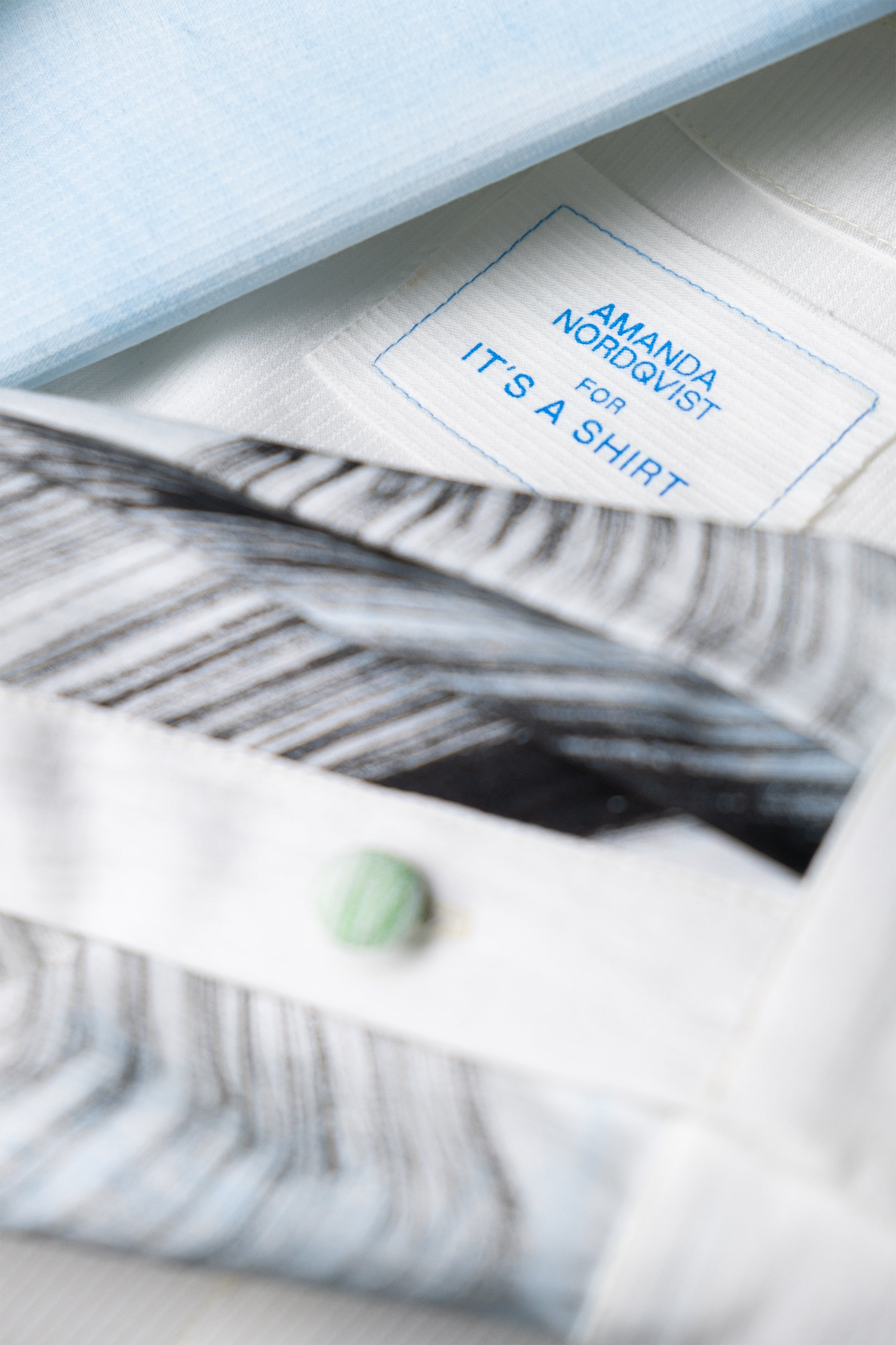 The shirt has been made from a semi-weight textured woven cotton. From Athens to Stockholm, the fabric travelled with us during our pop-up days there. Talented artist and friend Amanda Nordqvist perceived the fabric as a canvas, with the intention to create an artwork and not a clothing pattern. Afterwards, we brought it back to Athens and worked on this process for more than months in order to shape 16 one-of-a-kind shirts. We cut, sewed and finished them as if they were an abstract puzzle. Also, we created fabric buttons from the fabric scraps, all of them different from each other as such all the shirts are. Each and every garment is one-off and has its own drawings and lines. You can read more about Amanda here