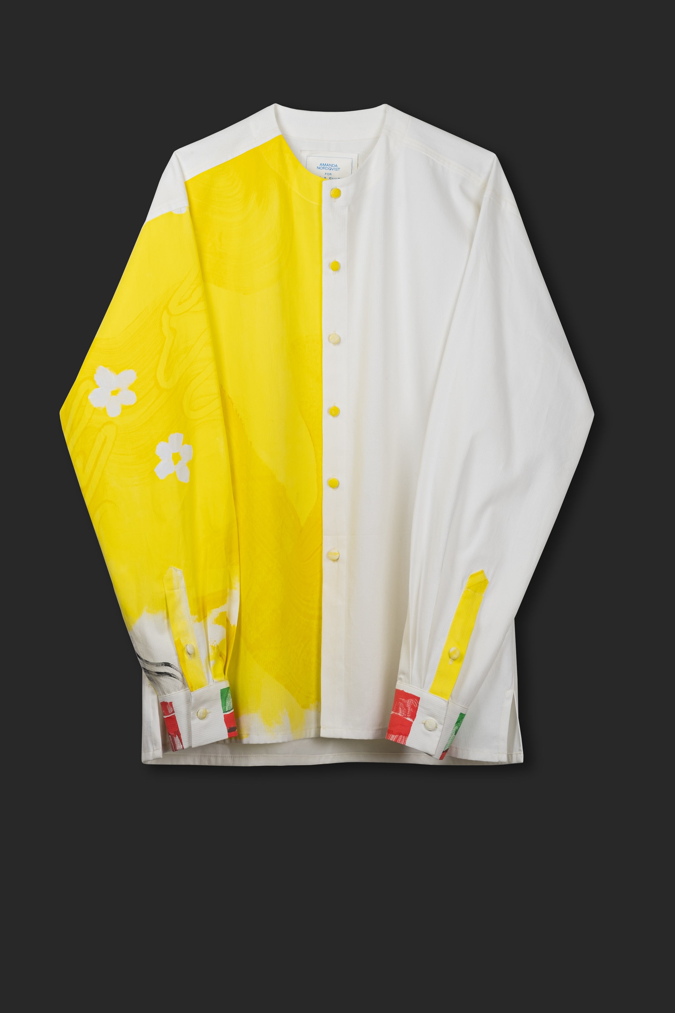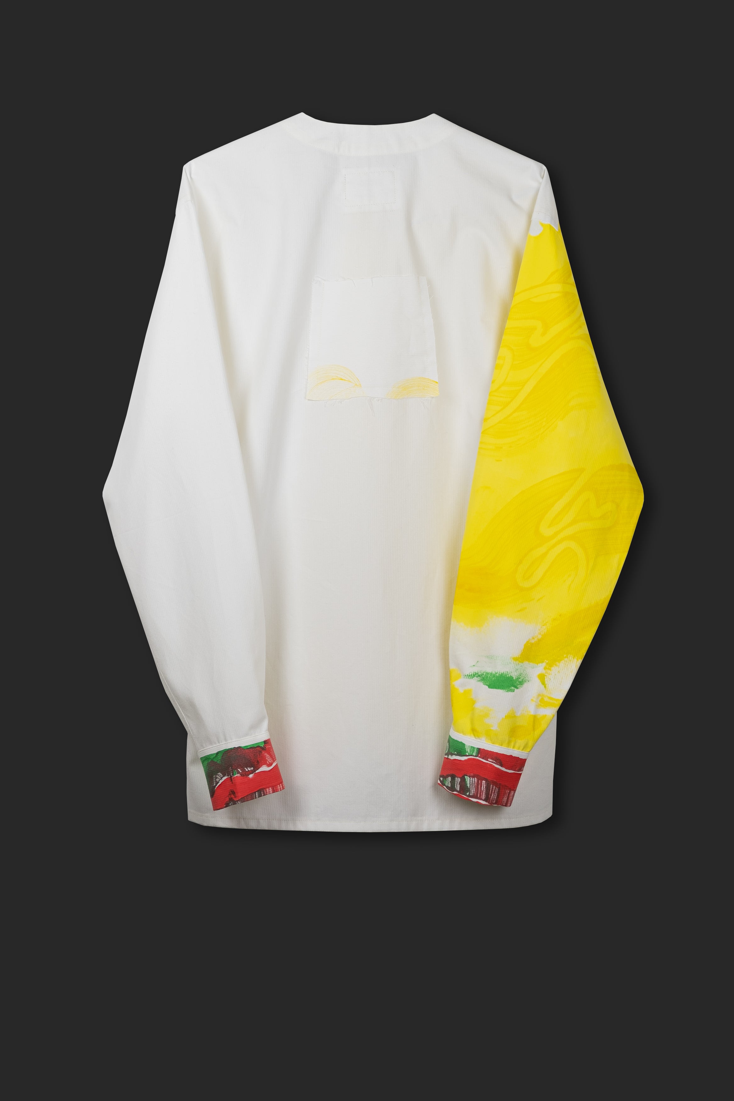 The shirt has been made from a semi-weight textured woven cotton. From Athens to Stockholm, the fabric travelled with us during our pop-up days there. Talented artist and friend Amanda Nordqvist perceived the fabric as a canvas, with the intention to create an artwork and not a clothing pattern. Afterwards, we brought it back to Athens and worked on this process for more than months in order to shape 16 one-of-a-kind shirts. We cut, sewed and finished them as if they were an abstract puzzle. Also, we created fabric buttons from the fabric scraps, all of them different from each other as such all the shirts are. Each and every garment is one-off and has its own drawings and lines.  You can read more about Amanda here
