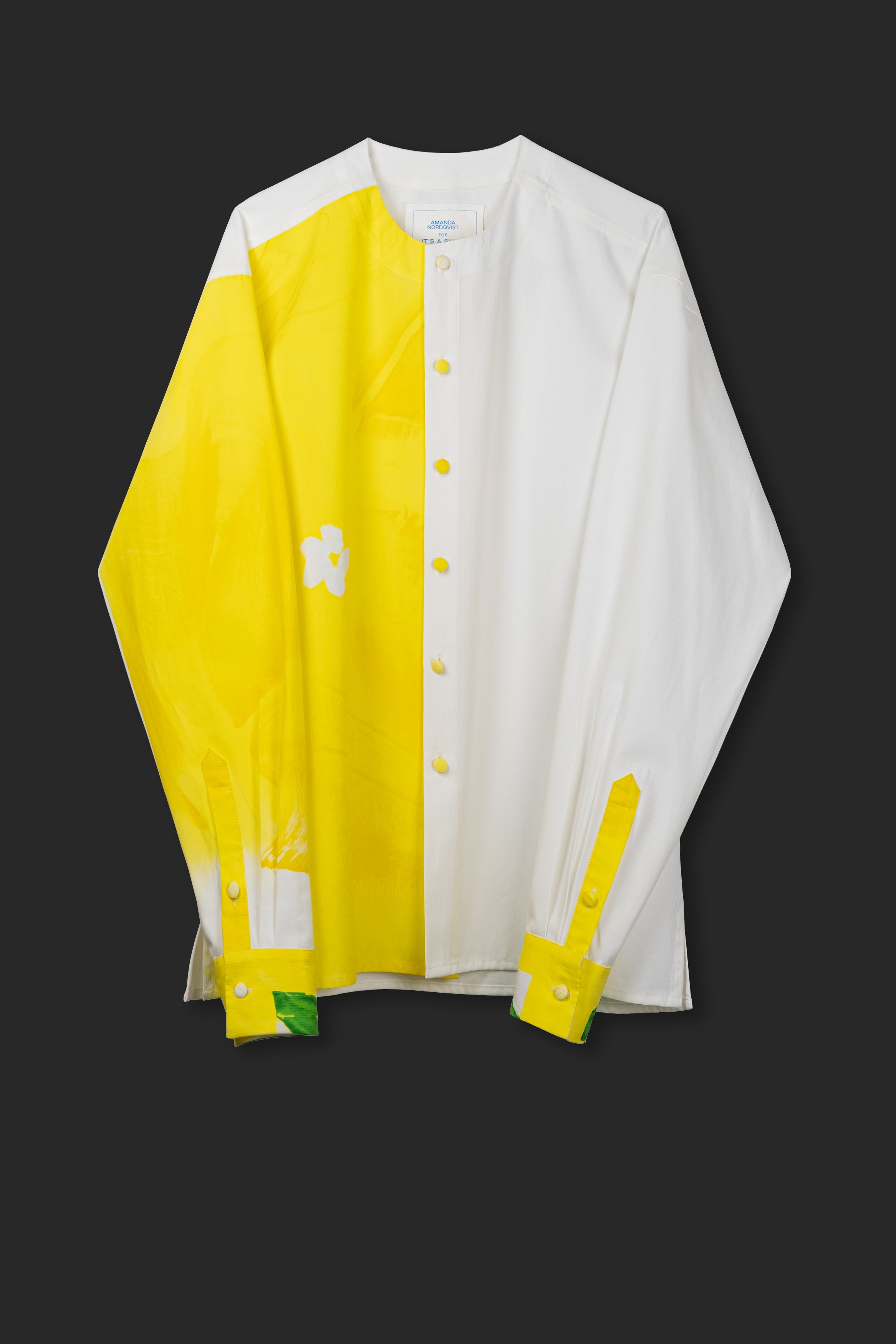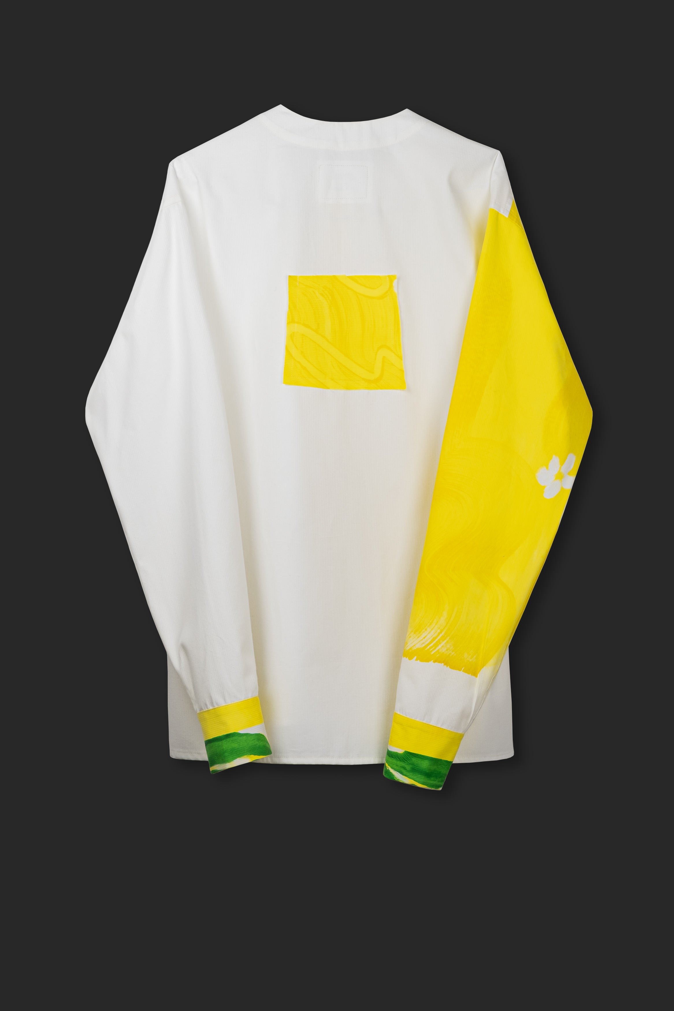 The shirt has been made from a semi-weight textured woven cotton. From Athens to Stockholm, the fabric travelled with us during our pop-up days there. Talented artist and friend Amanda Nordqvist perceived the fabric as a canvas, with the intention to create an artwork and not a clothing pattern. Afterwards, we brought it back to Athens and worked on this process for more than months in order to shape 16 one-of-a-kind shirts. We cut, sewed and finished them as if they were an abstract puzzle. Also, we created fabric buttons from the fabric scraps, all of them different from each other as such all the shirts are. Each and every garment is one-off and has its own drawings and lines.  You can read more about Amanda here