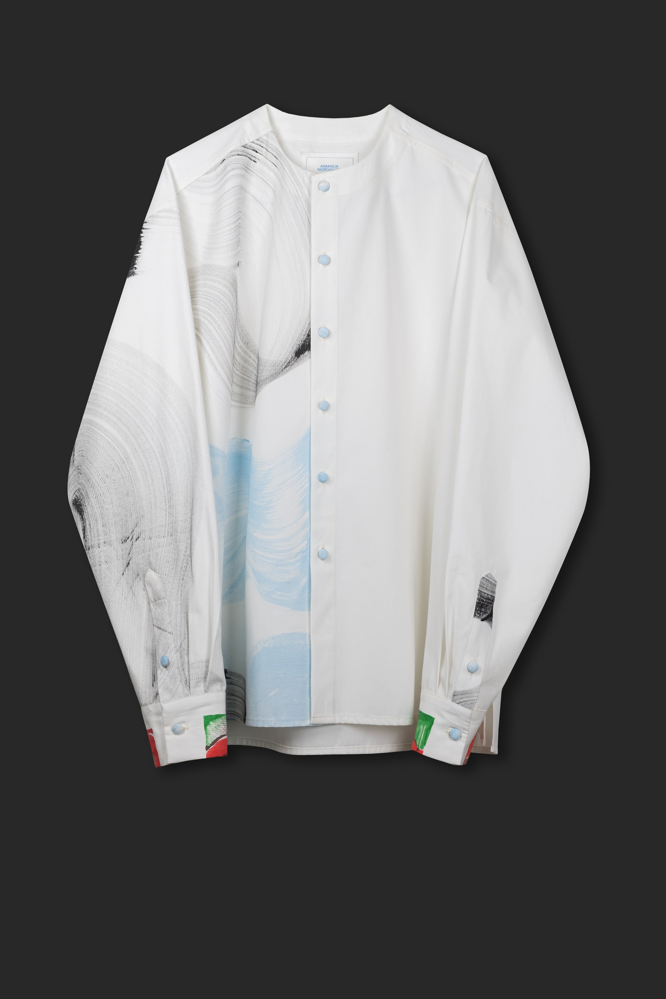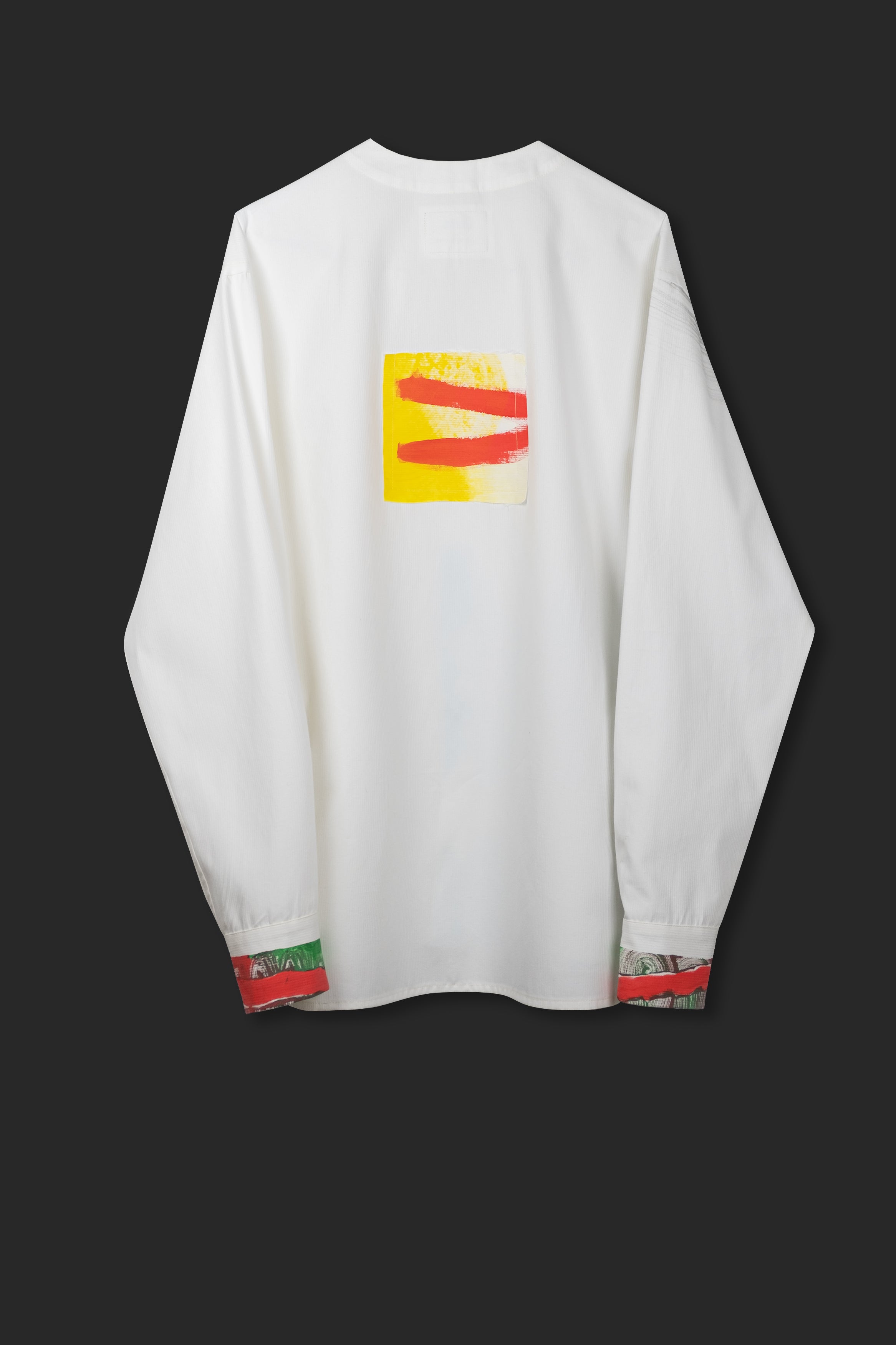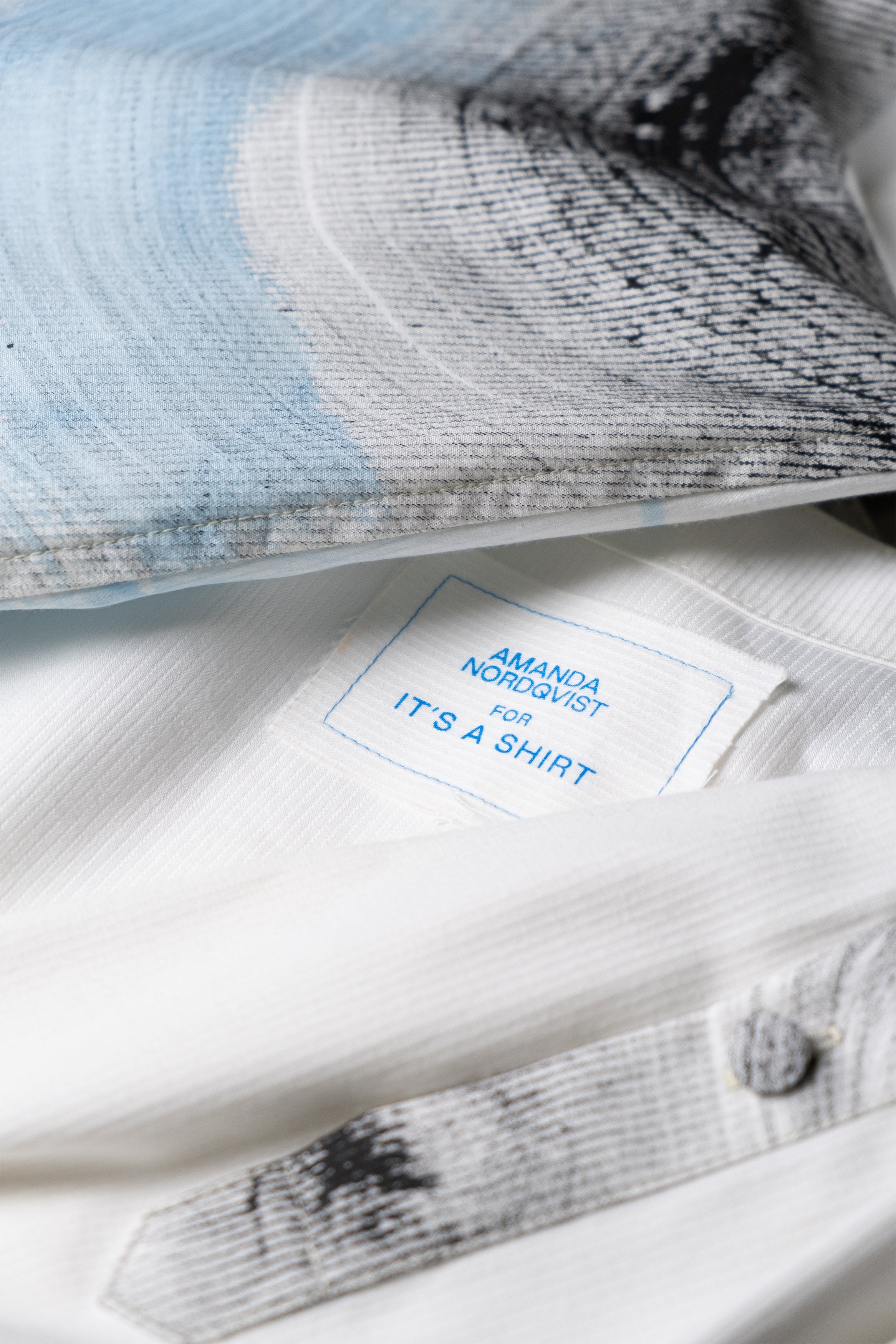 The shirt has been made from a semi-weight textured woven cotton. From Athens to Stockholm, the fabric travelled with us during our pop-up days there. Talented artist and friend Amanda Nordqvist perceived the fabric as a canvas, with the intention to create an artwork and not a clothing pattern. Afterwards, we brought it back to Athens and worked on this process for more than months in order to shape 16 one-of-a-kind shirts. We cut, sewed and finished them as if they were an abstract puzzle. Also, we created fabric buttons from the fabric scraps, all of them different from each other as such all the shirts are. Each and every garment is one-off and has its own drawings and lines. You can read more about Amanda here