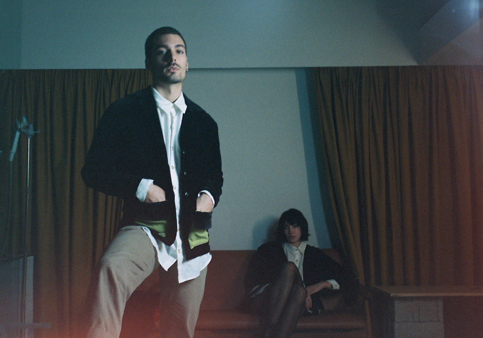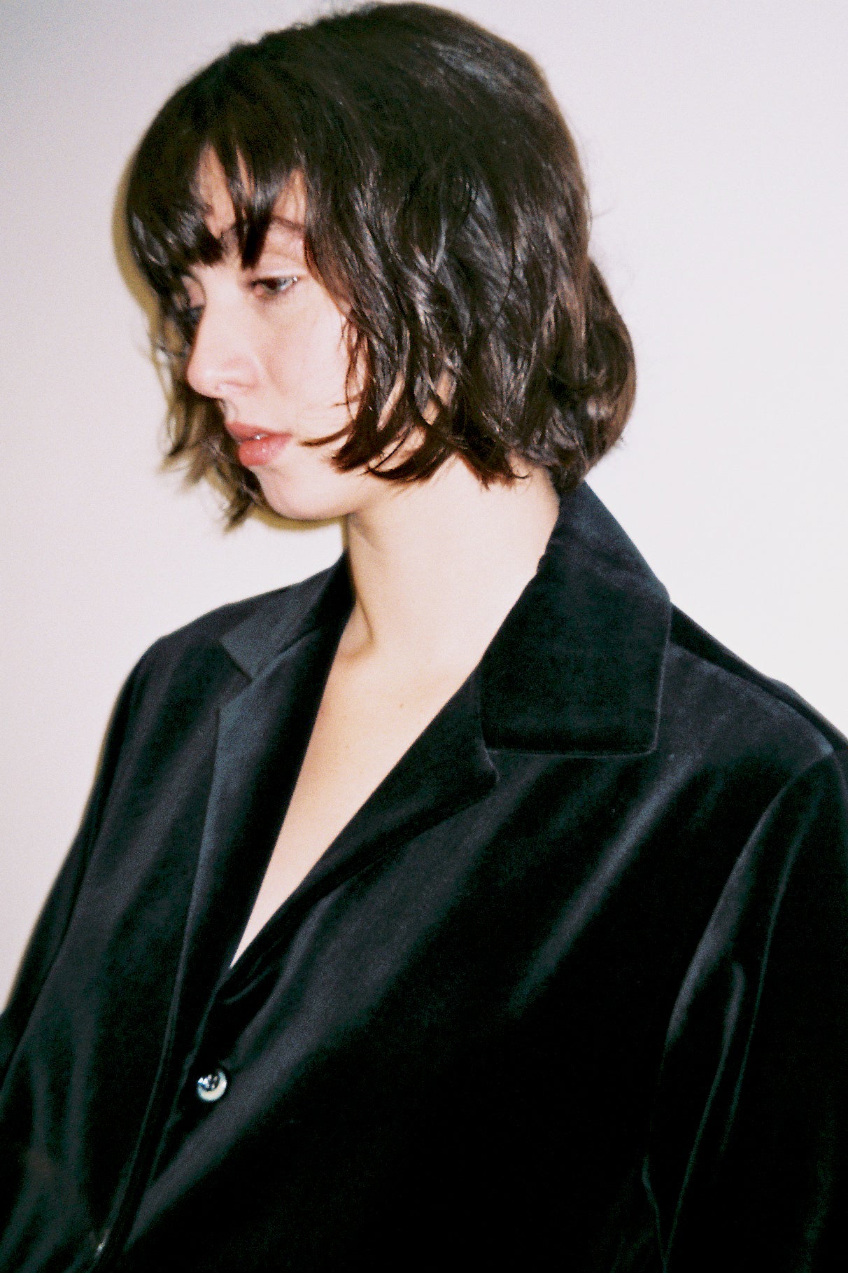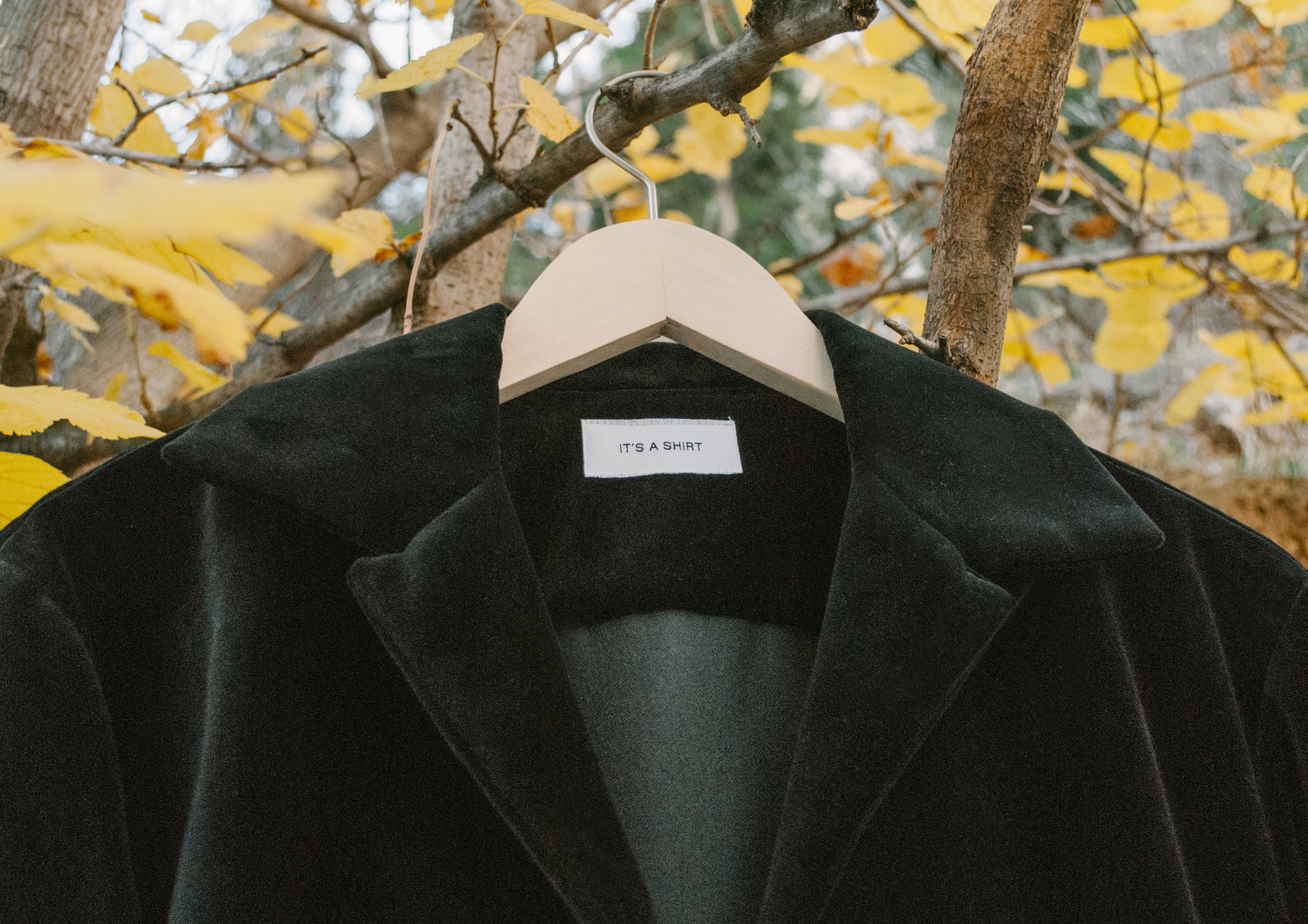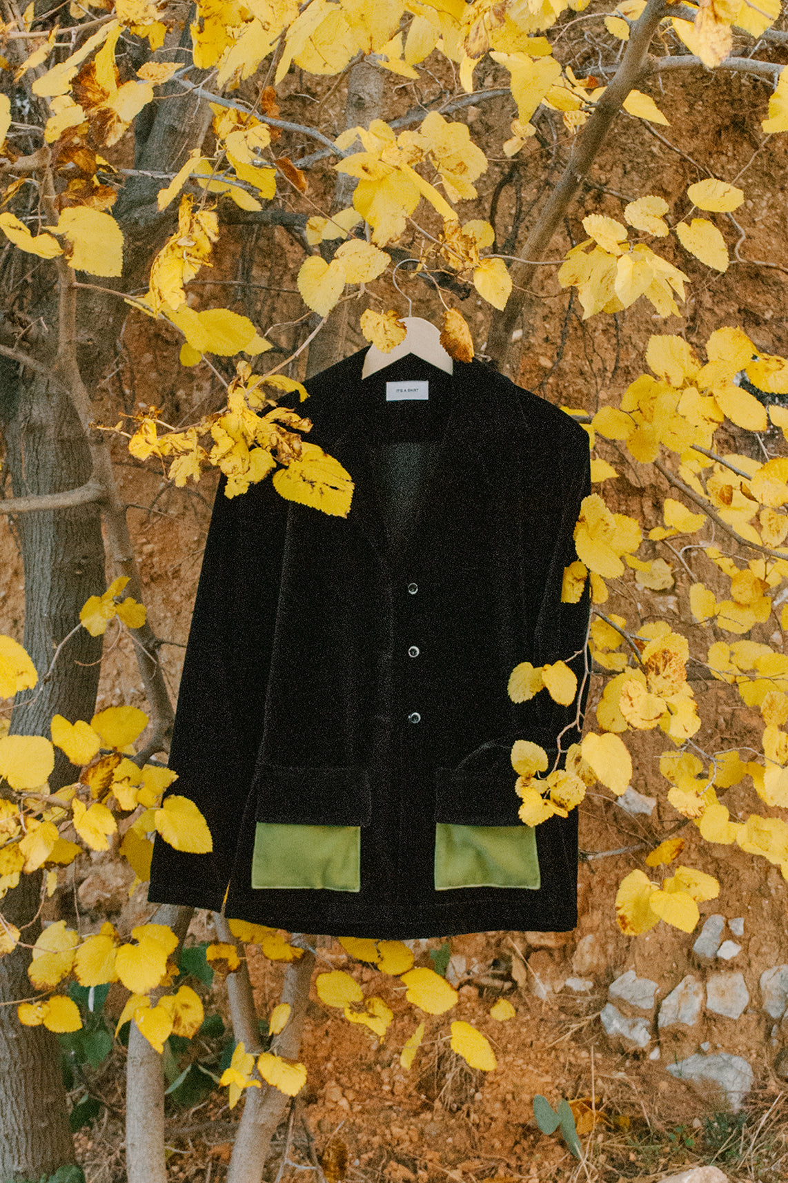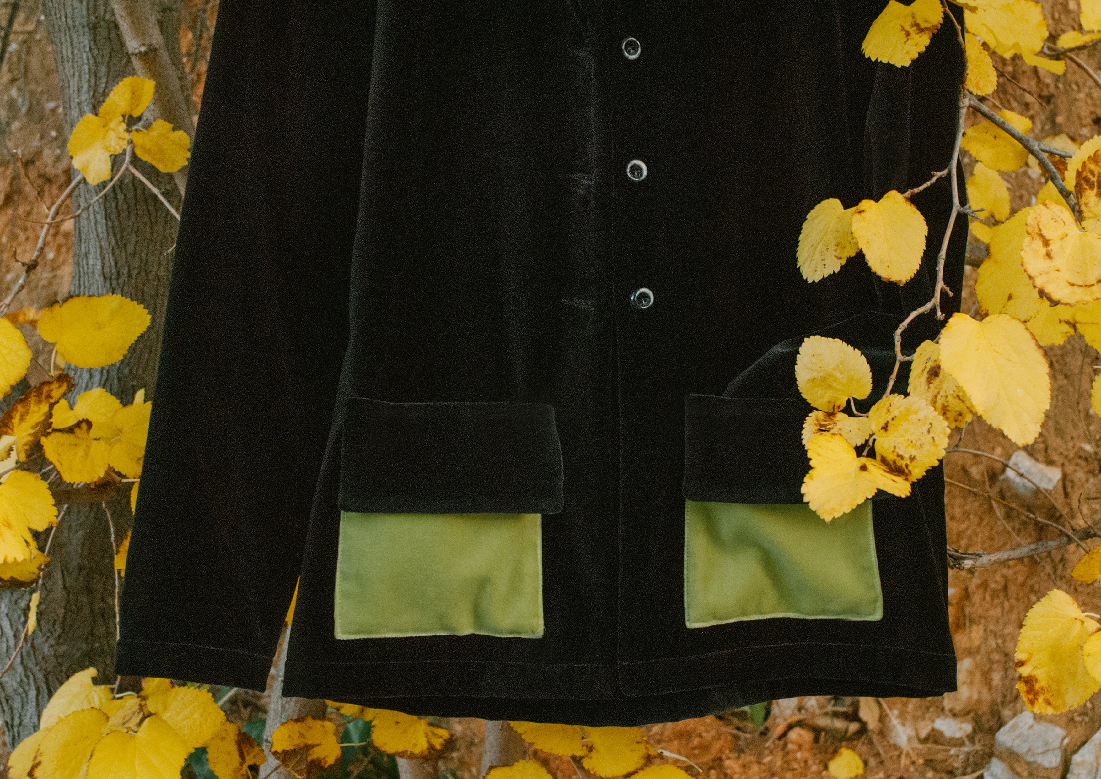 is a unisex garment in black with two front pockets in a lime colour way. It runs a slim silhouette fit and is made from a 100% french heavy cotton velvet. The garment has been tailored accordingly to have a blazer fit. Available in two sizes. This is an extra limited overshirt-series.