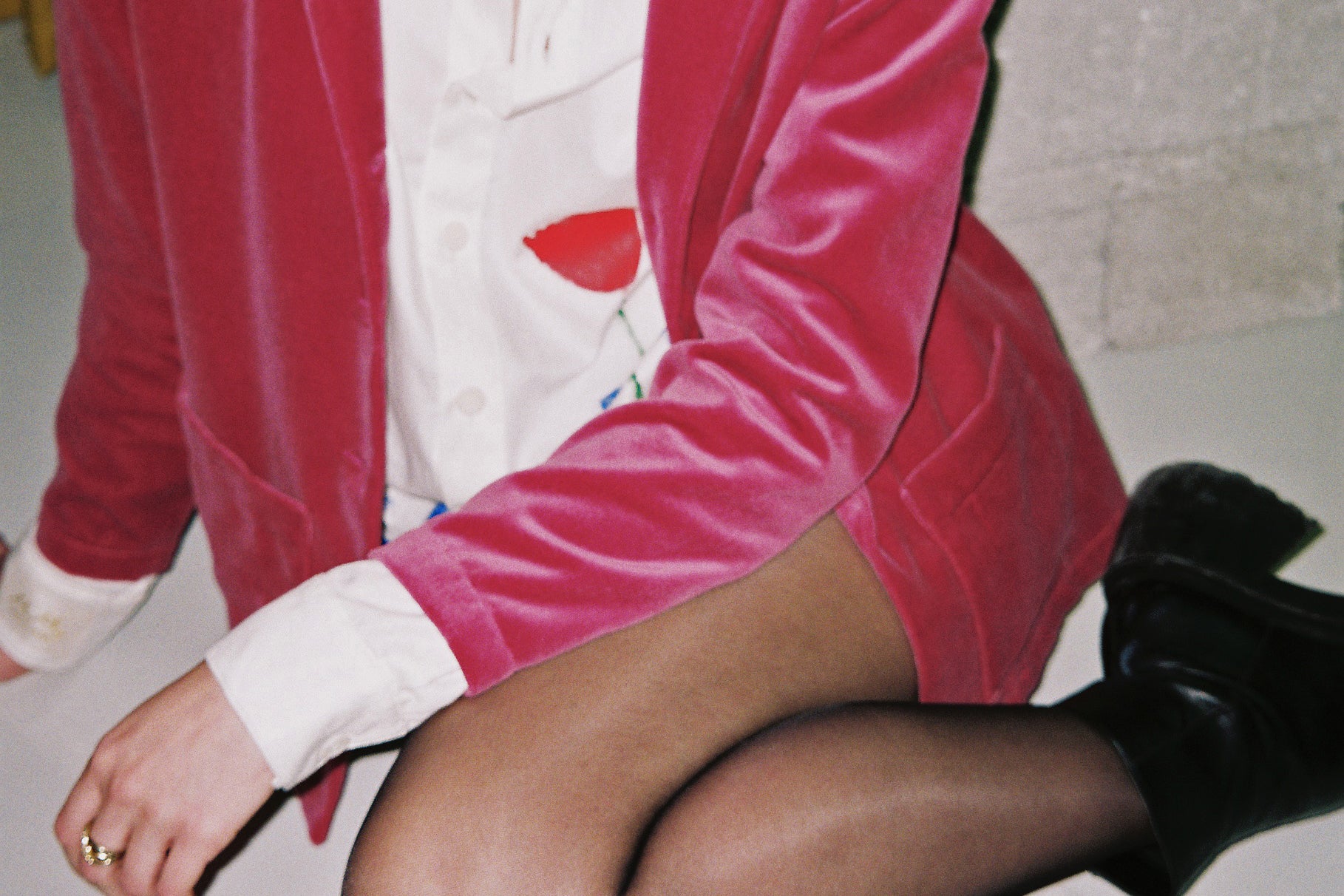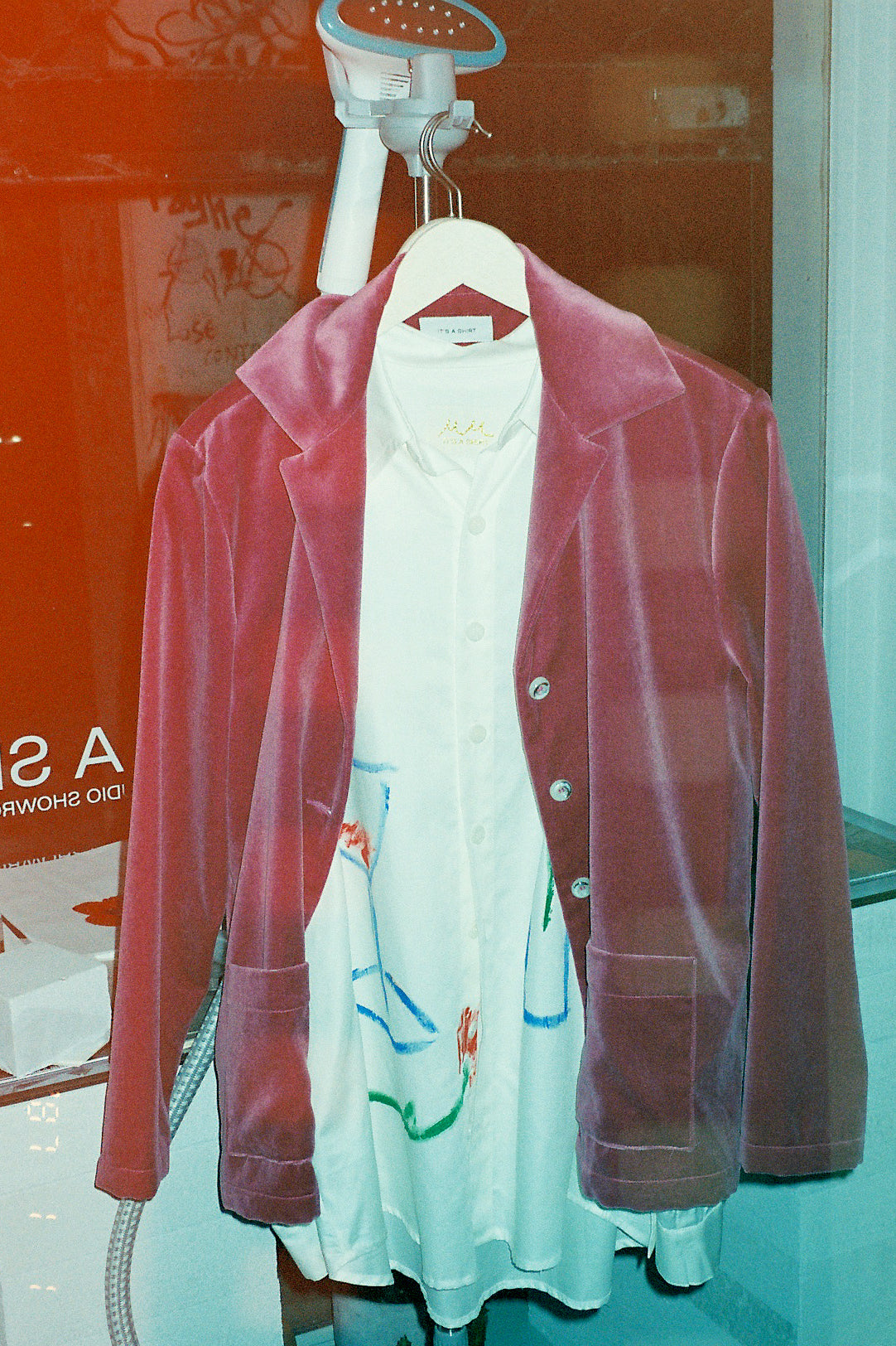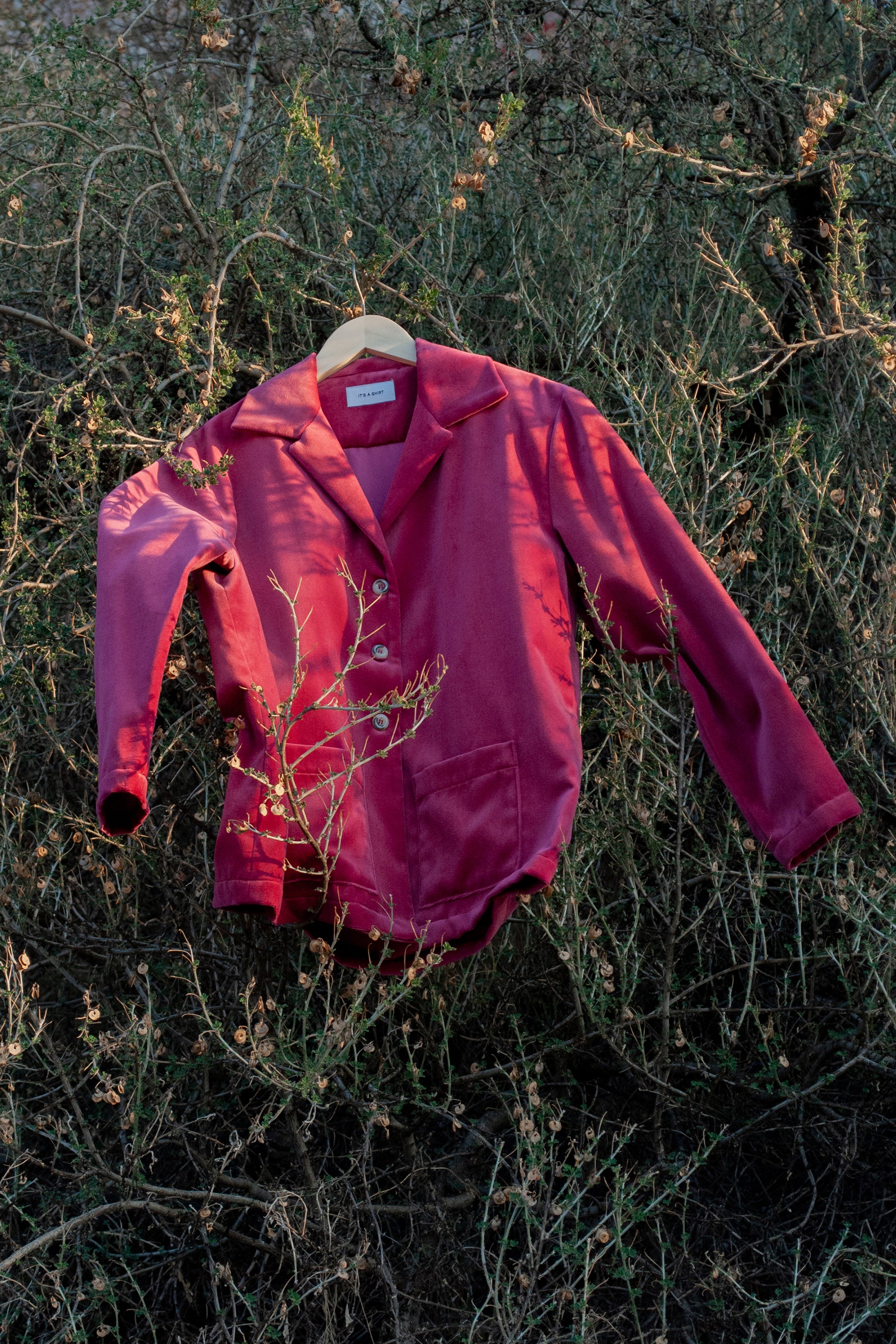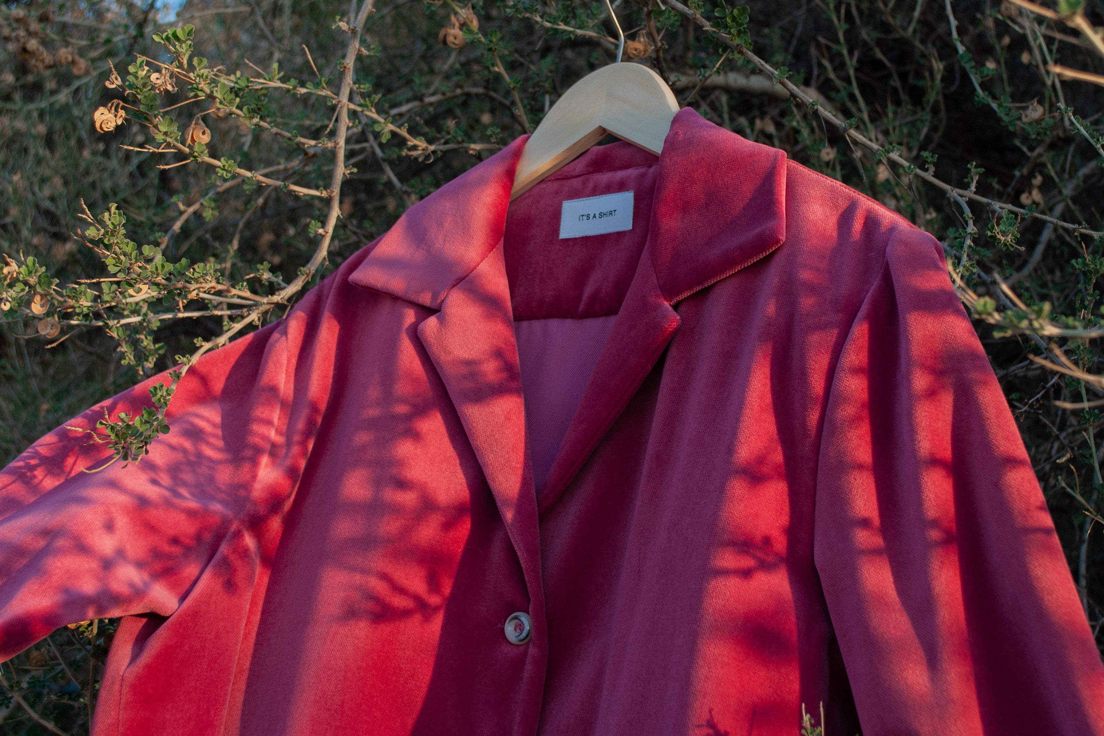 is a unisex garment in a french rose colour with a slim silhouette fit made from a 100% french heavy cotton velvet. The garment has been tailored accordingly to have a blazer fit. Available in two sizes. This is an extra limited overshirt-series.