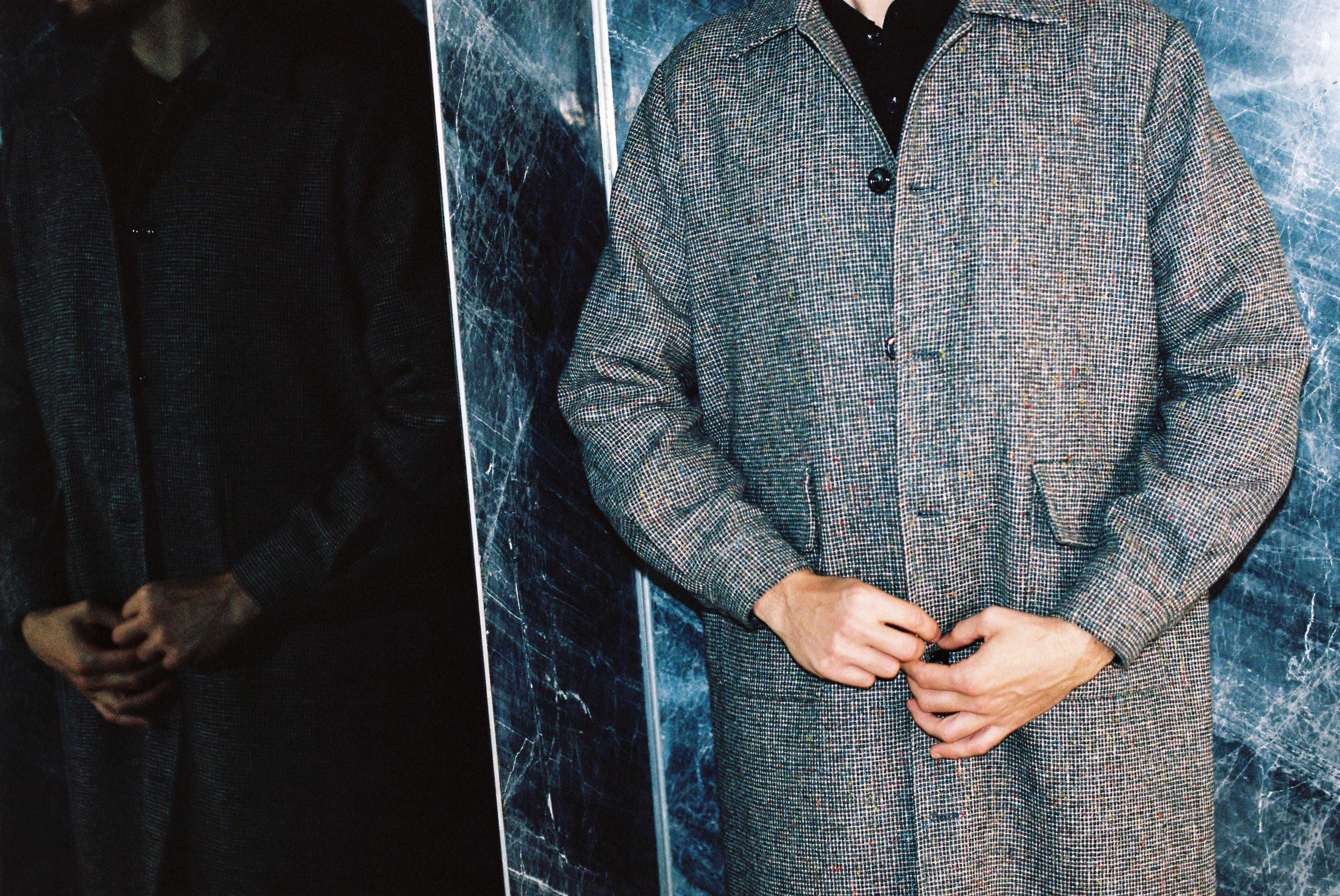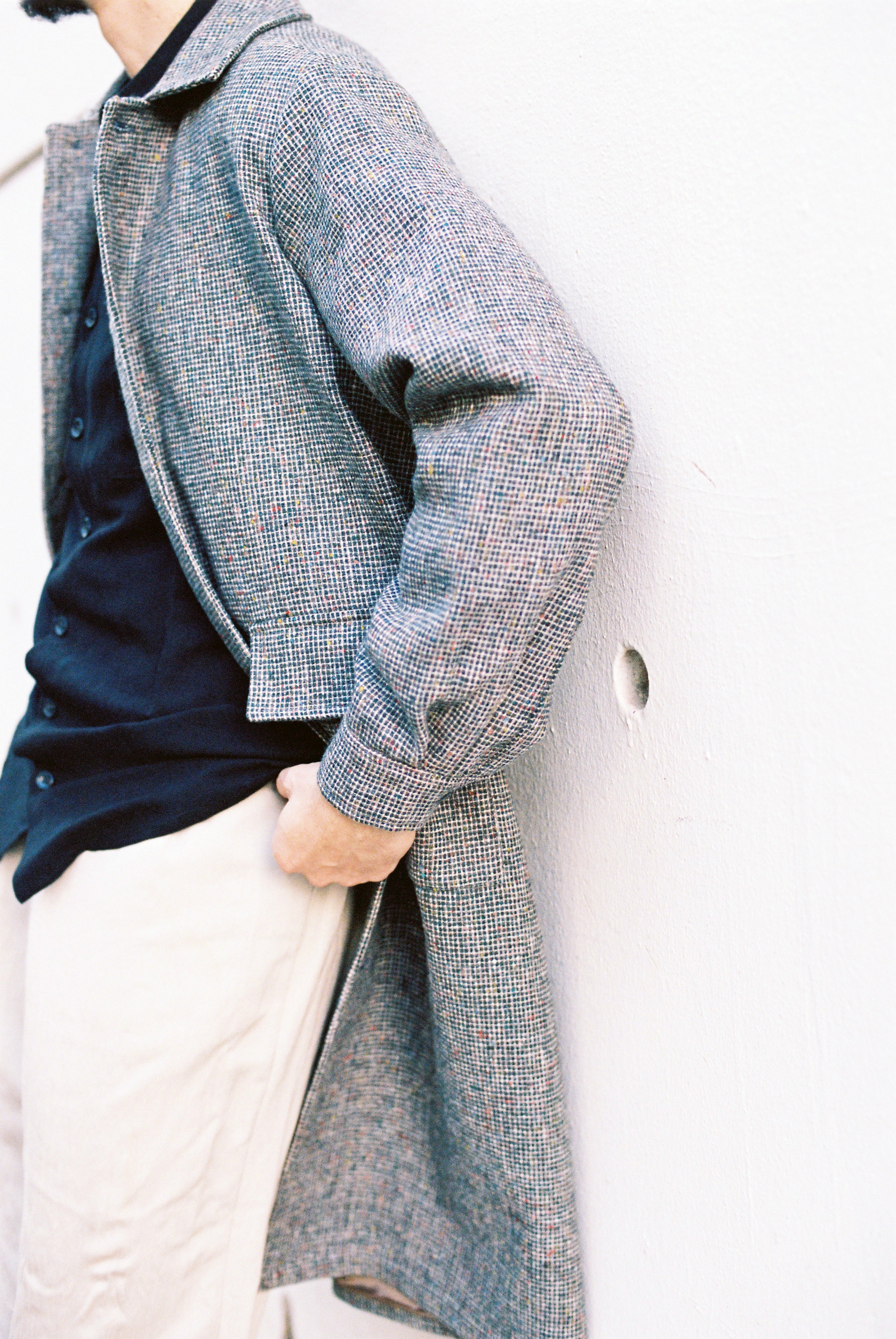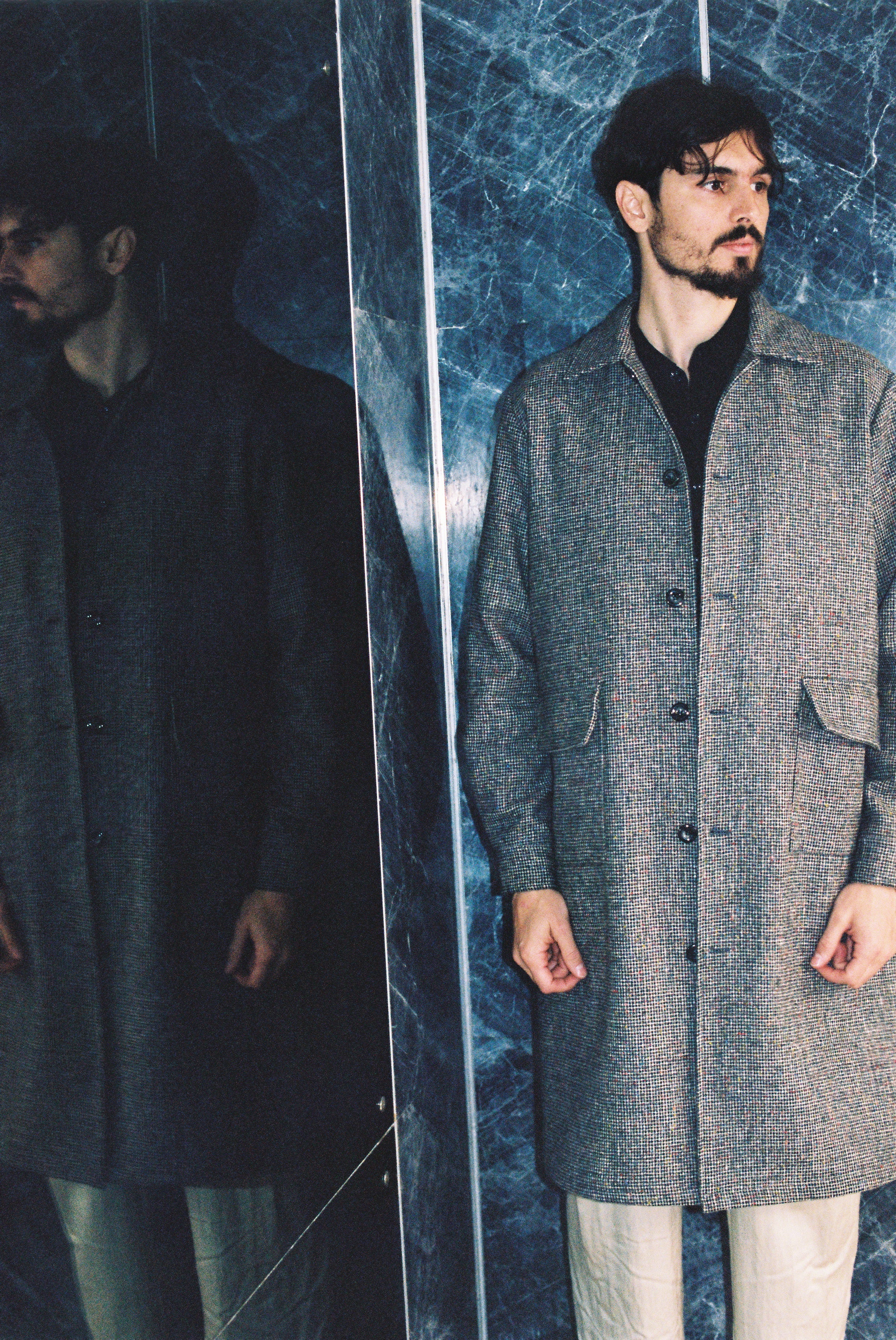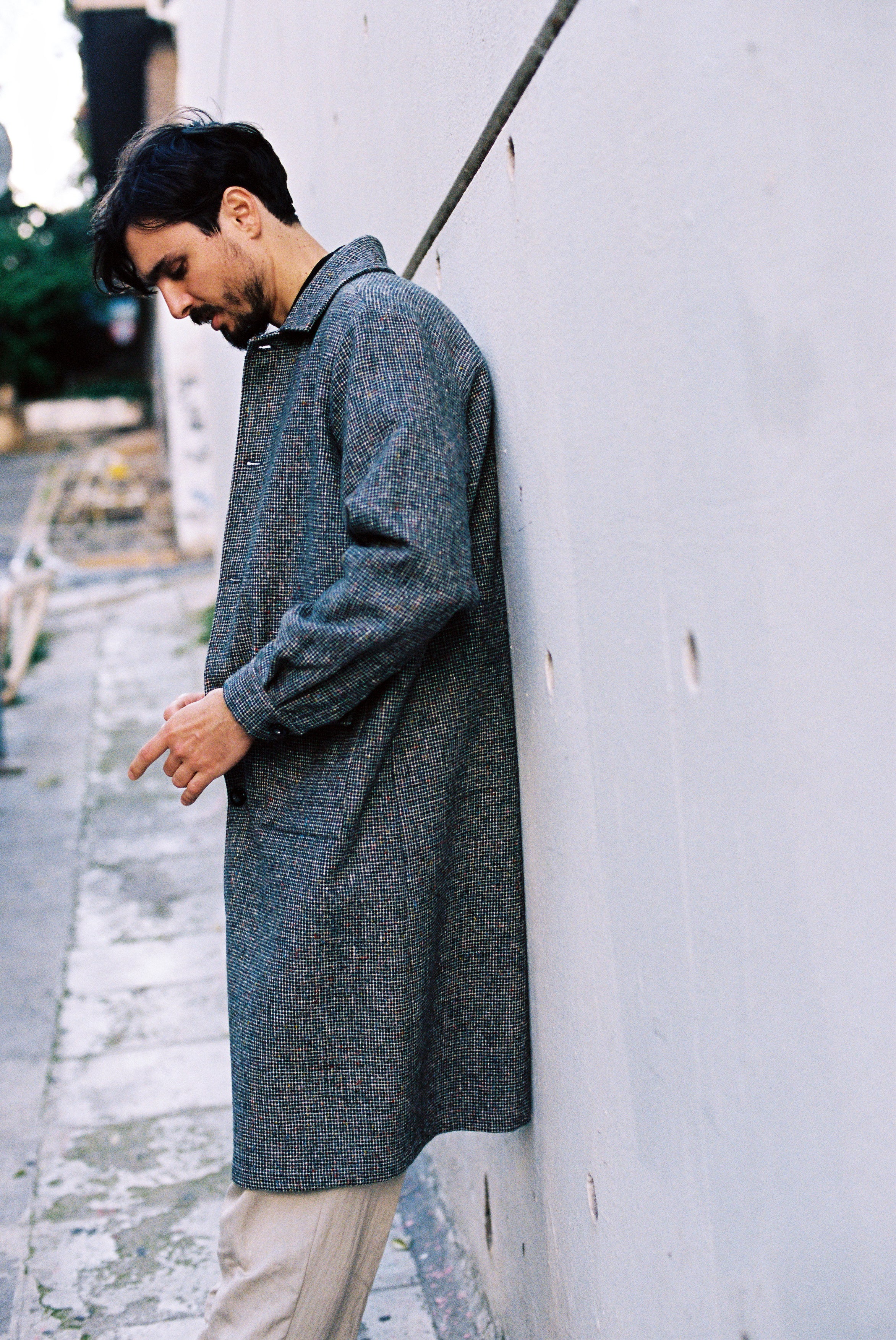 It's a unisex long outerwear garment shaped in a relaxed fit. Its outer part is made from premium dead-stock Kynoch Donegal tweed, 100% wool. This special fabric is differentiated due to its contrast-colored neps. Its lining is a shiny viscose in a caramel/light grey colour. Every item has been tailored individually with an inner pocket on the heart's side, which is finished with a tweed fabric detail. It has two generous front flap pockets and its closure is compiled by heavy bone buttons with keyhole buttonholes. The logo has been screen printed on the back facing of the garment in a honey-yellow colour in a small family studio located at Piraeus port. It's available in two sizes.