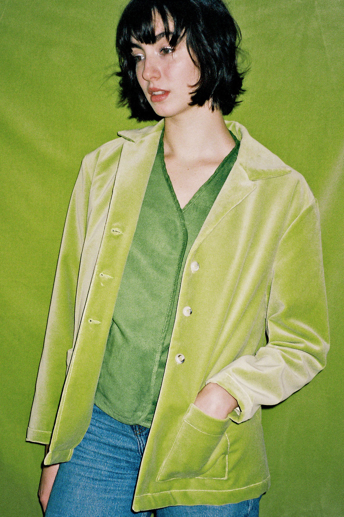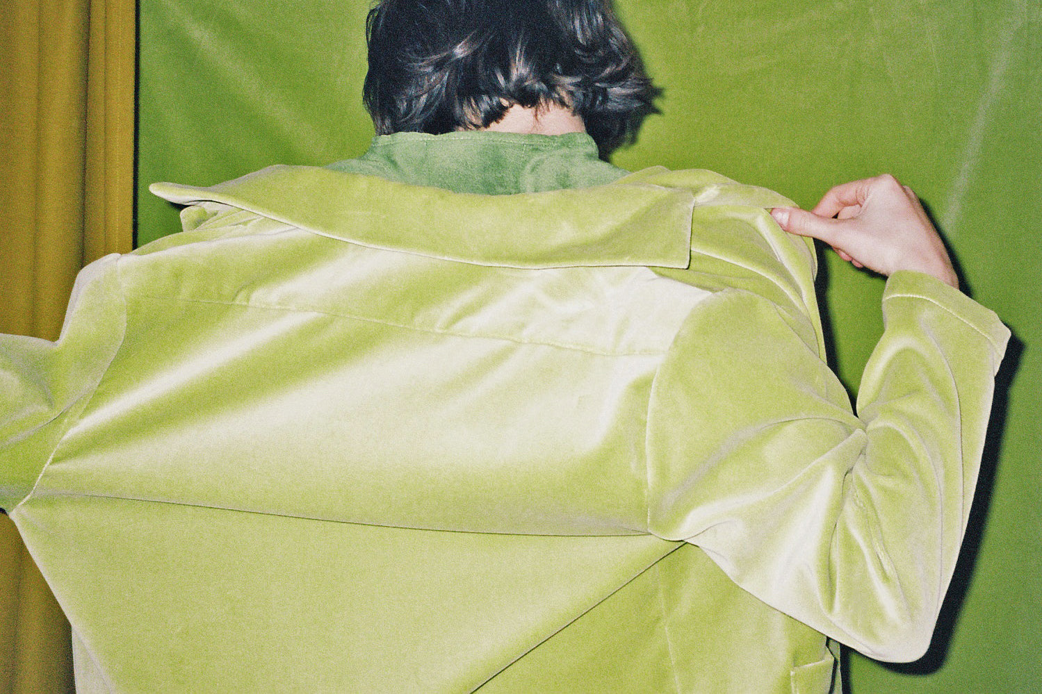 is a unisex garment in lime colour with a slim silhouette fit and made from a 100% french heavy cotton velvet. The garment has been tailored accordingly to have a blazer fit. Available in two sizes. This is an extra limited overshirt-series.