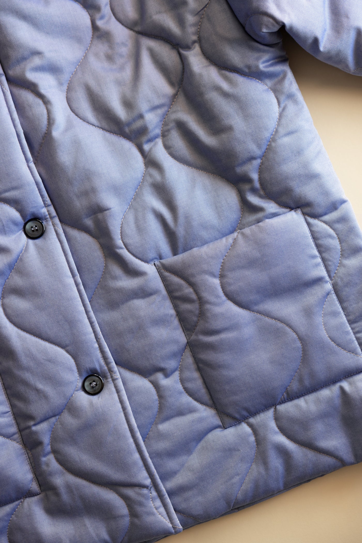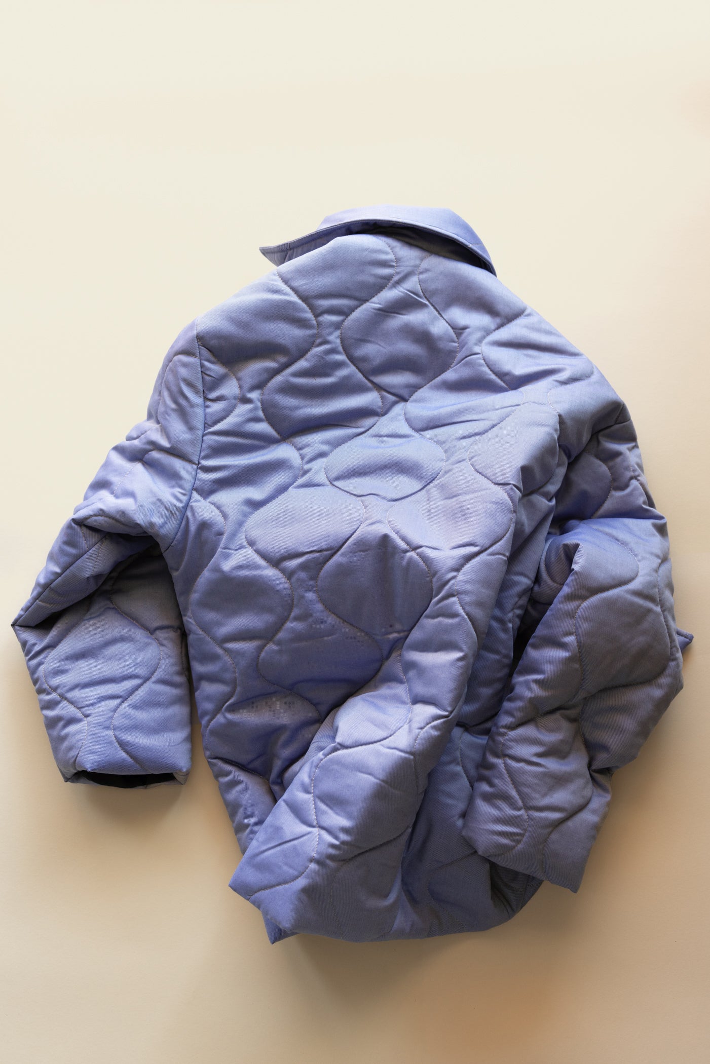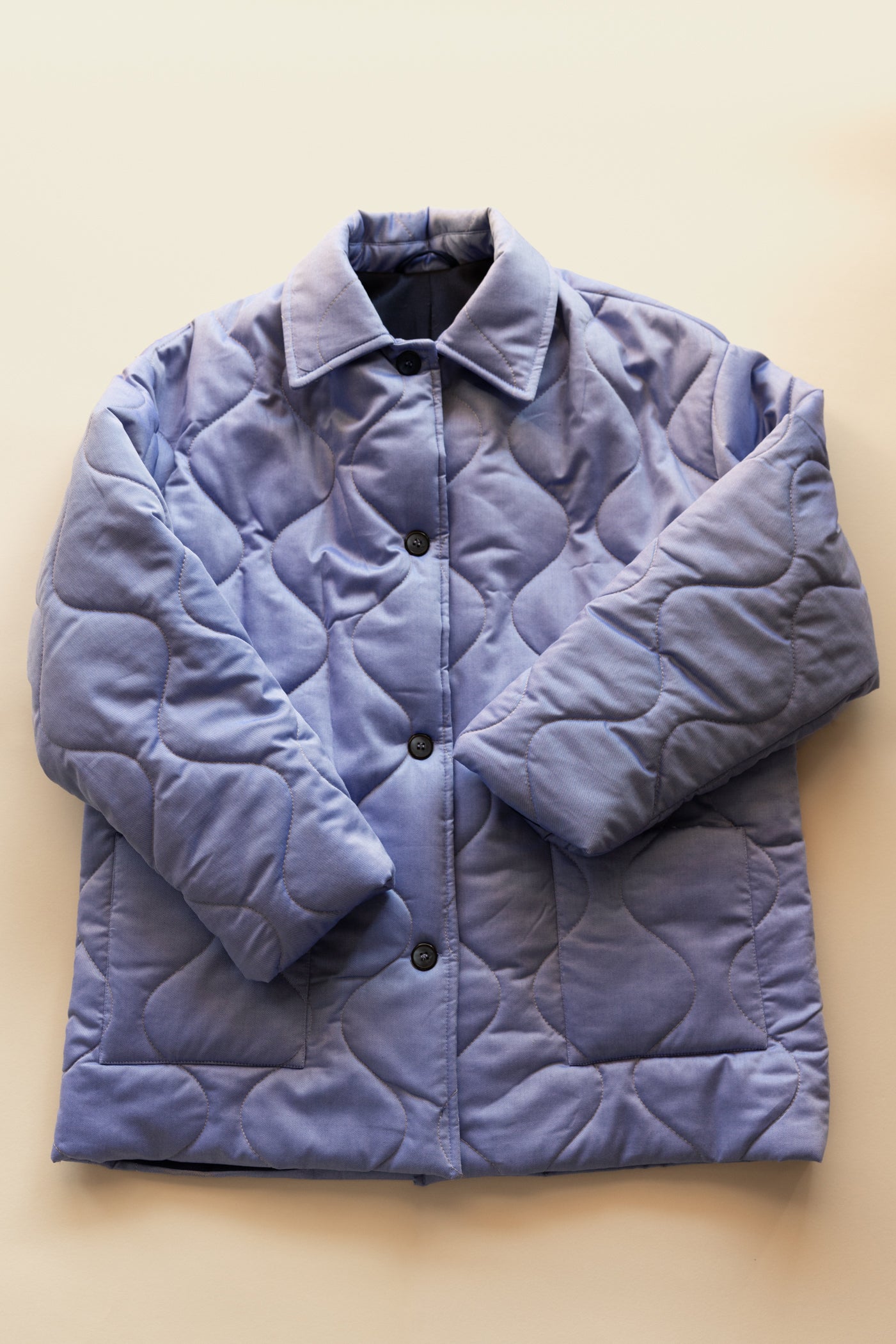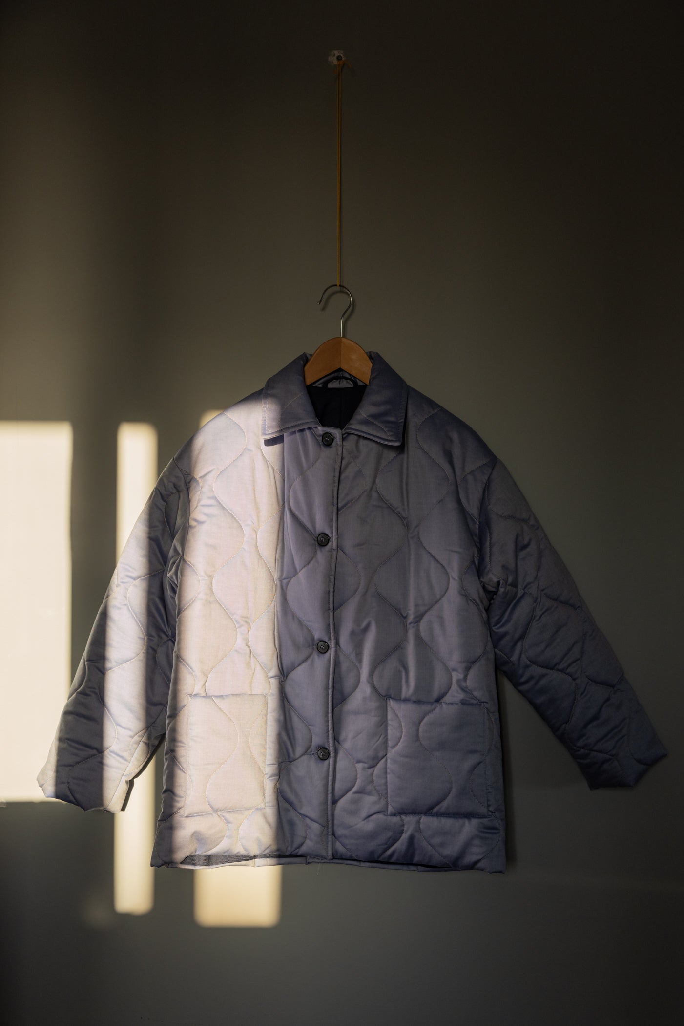 Firstly, we selected Swiss shirt poplins and transformed them into quilted fabric. The color of the NORTHERN LIGHTS jacket is metallic lilac wonder blue, with beige contrast stitching that runs along its surface. It features two aligned flat pockets and large bone dead-stock buttons as well as a three dimensional padded surface. The process of cutting, sewing, and finishing was a lengthy one due to the thickness of the layers of the fabrics. To ensure the jacket is warm enough for colder days, we crafted the inner lining from dead-stock dark blue soft cotton and added a delicate hidden pocket for functionality. As this is our first attempt at creating such an outerwear, we hope you embrace it and have it as a long-lasting part of your wardrobe, accompanying you through each and every winter day. Stay cozy and warm while wearing a garment you truly deserve!