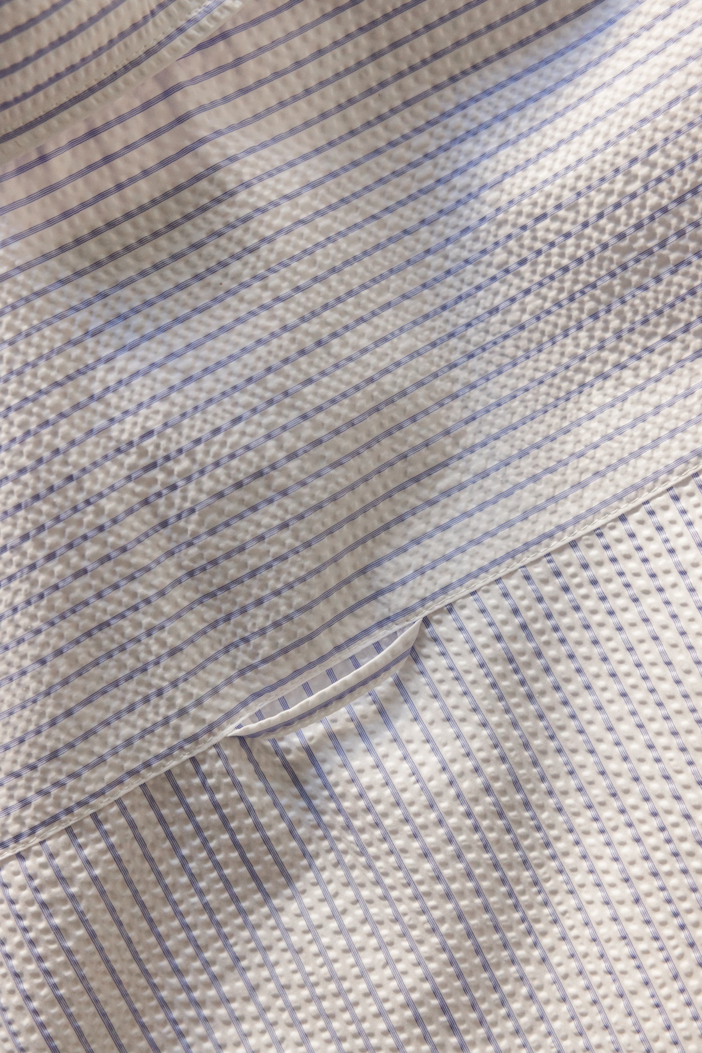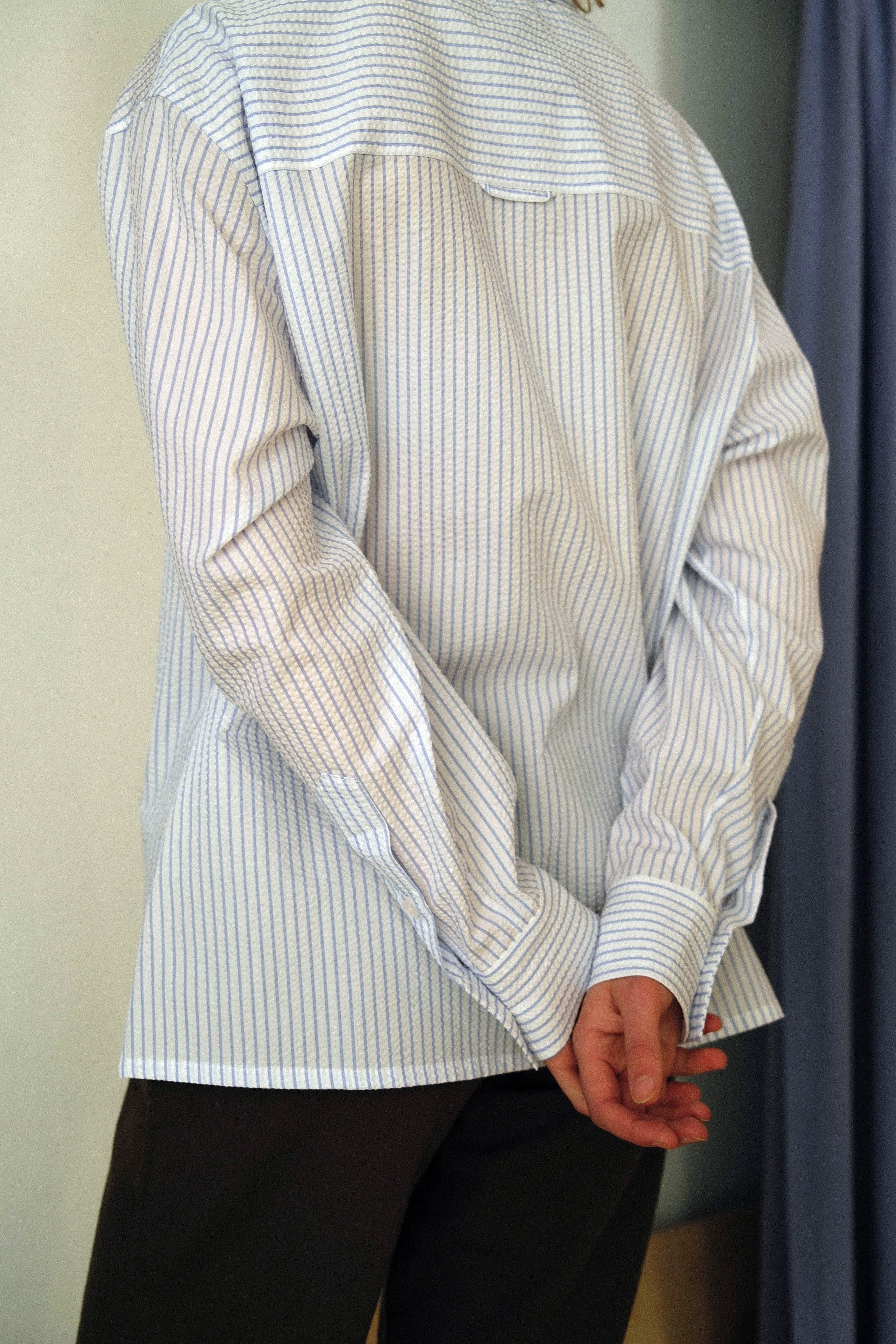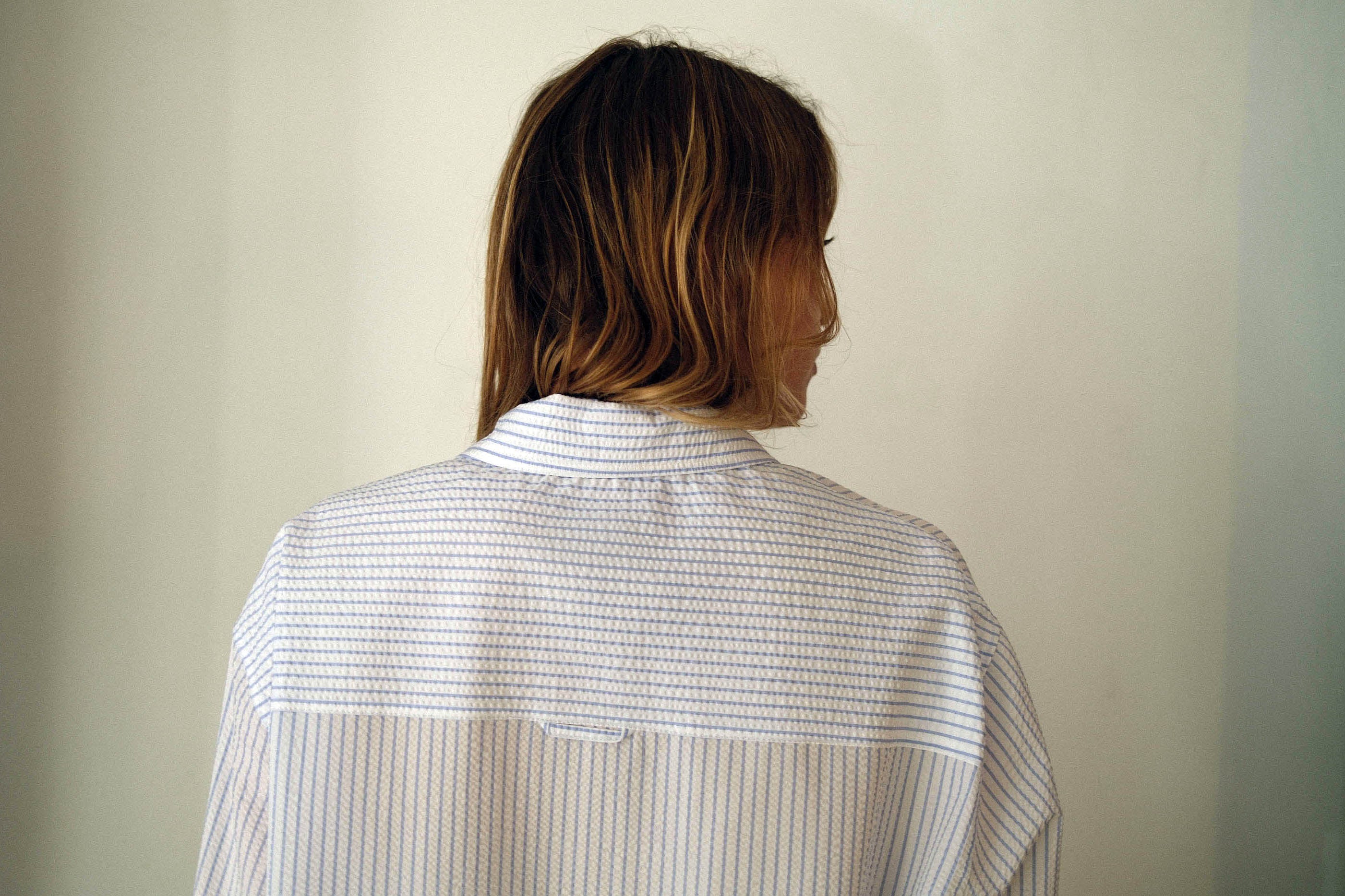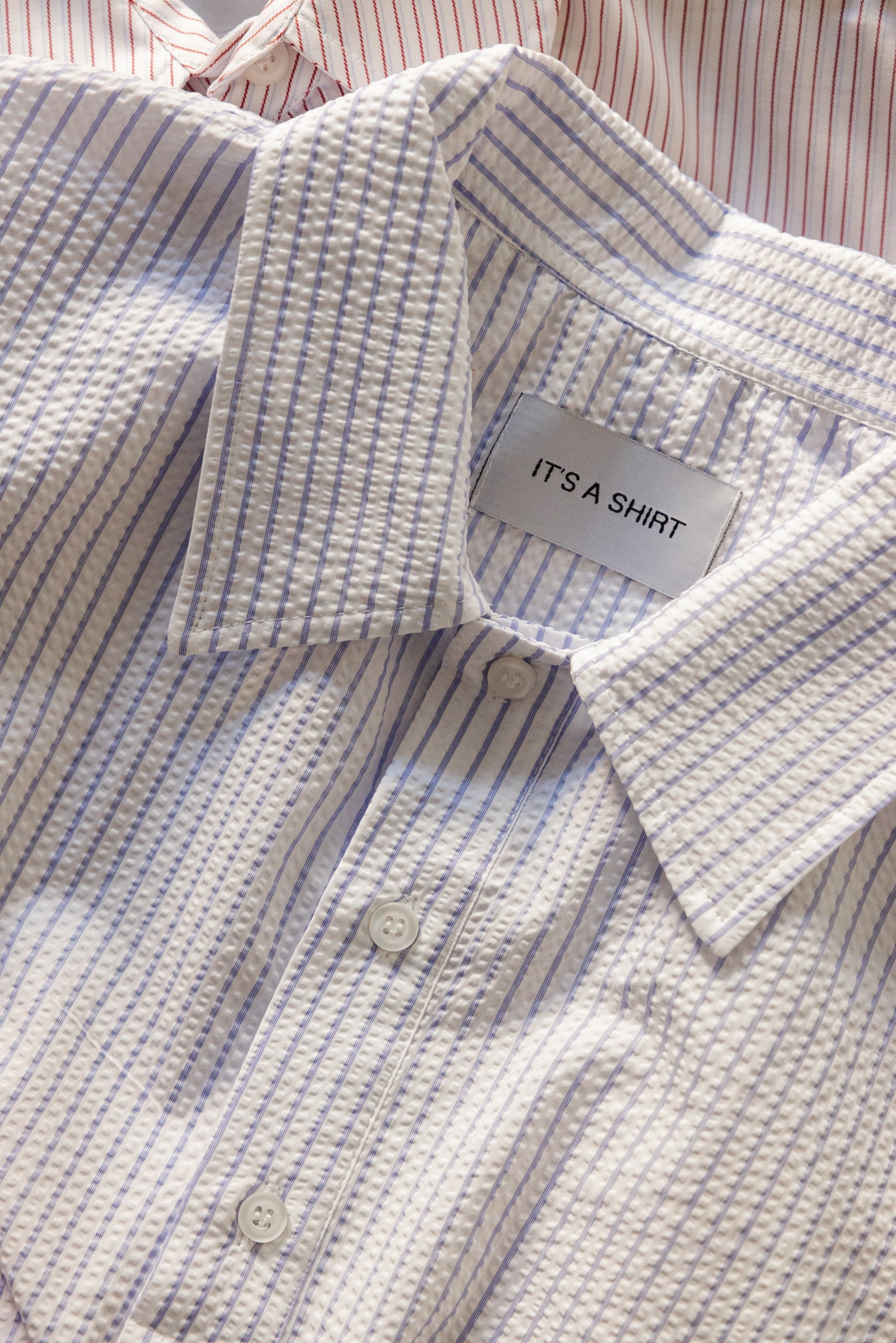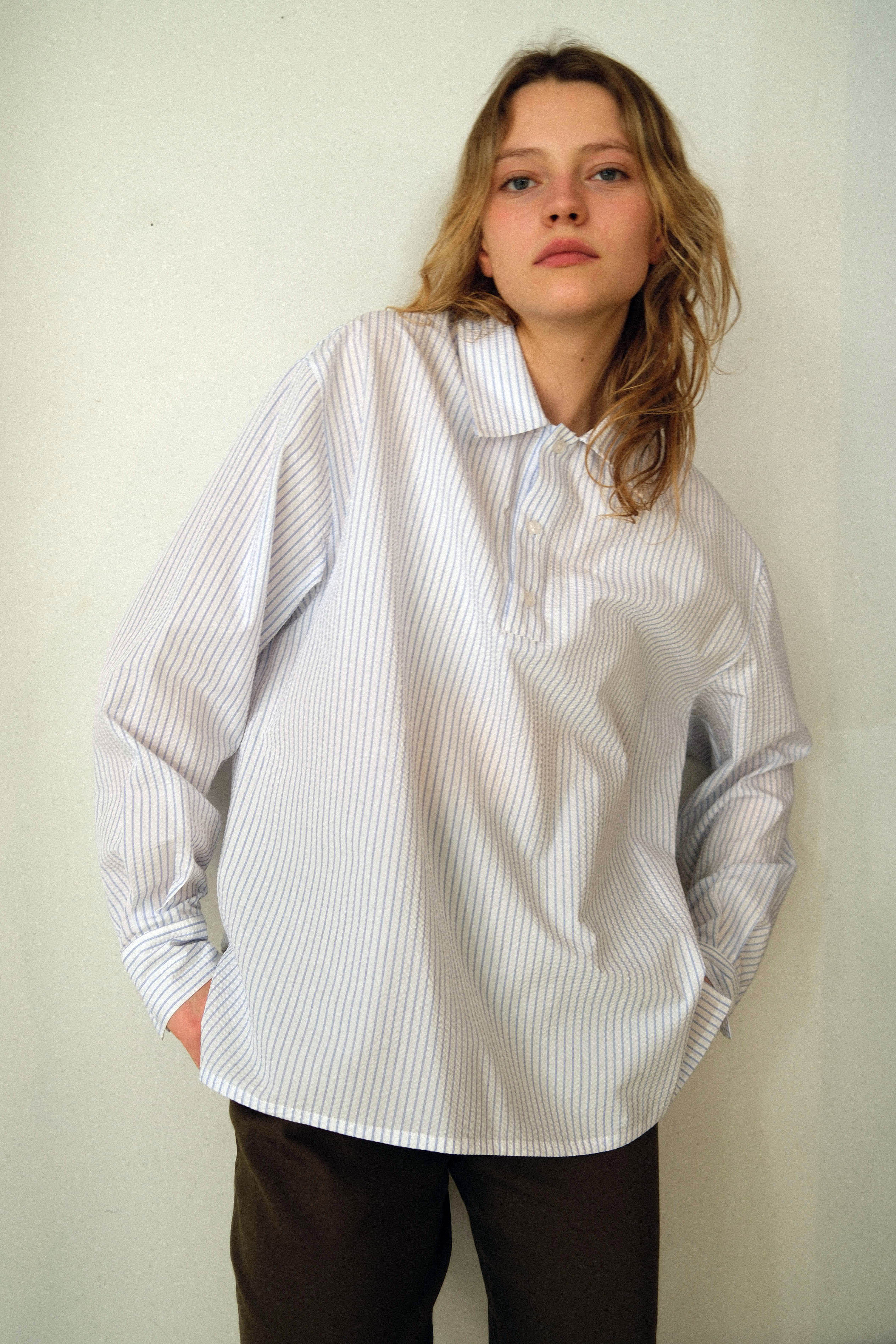 Crafted from truly beautiful textured seersucker cotton produced in north Italy, this garment exudes both timeless elegance and effortless comfort. It is thoughtfully detailed with three polished pearl buttons and features a wide, flat collar. The loose, boxy fit ensures a relaxed silhouette but it can also match a formal look. Each garment is meticulously crafted in our family-owned workshop in Athens, ensuring high level of quality and care in every stitch.