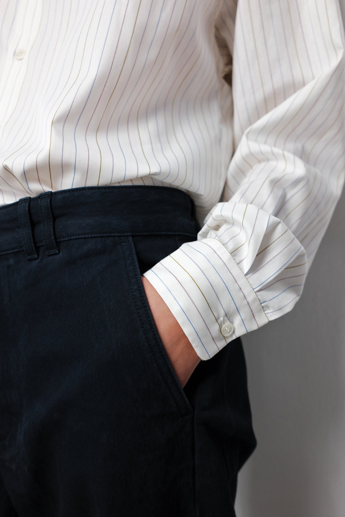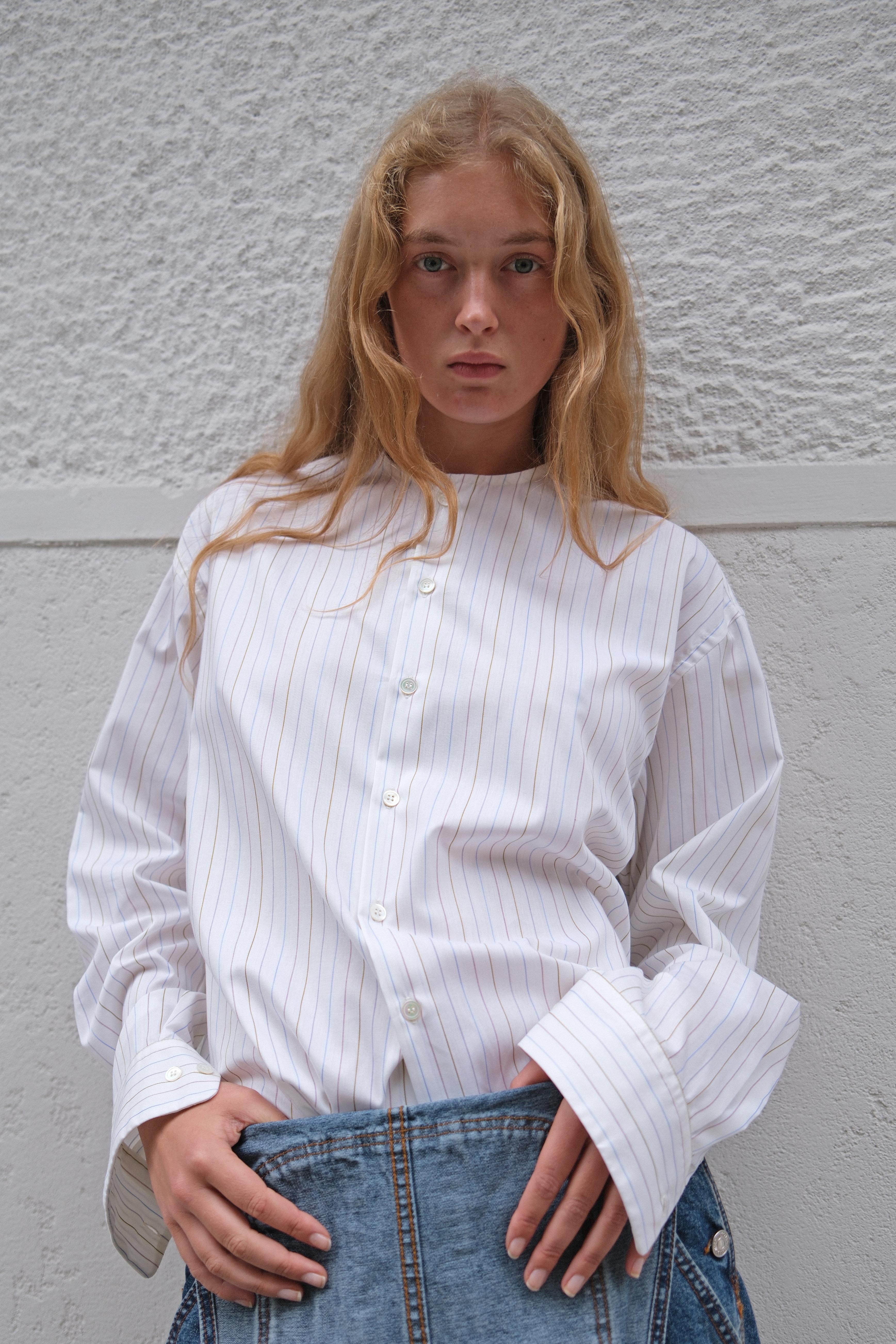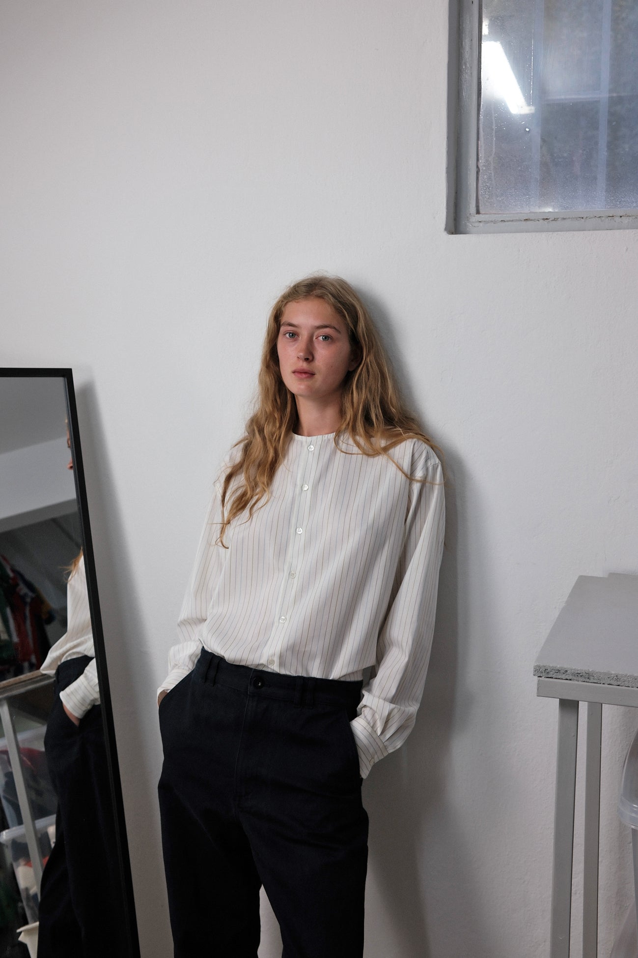 We firstly created the cut in 2022, and this is the elevated version of the initial design. It offers a relaxed fit, but not too oversized, and features a rounded neckline in place of a collar, making it appropriate to be layered with other garments. It has been crafted from a rare striped fabric we sourced from a closed production (70's-90's), it's pretty soft, smooth and textured.