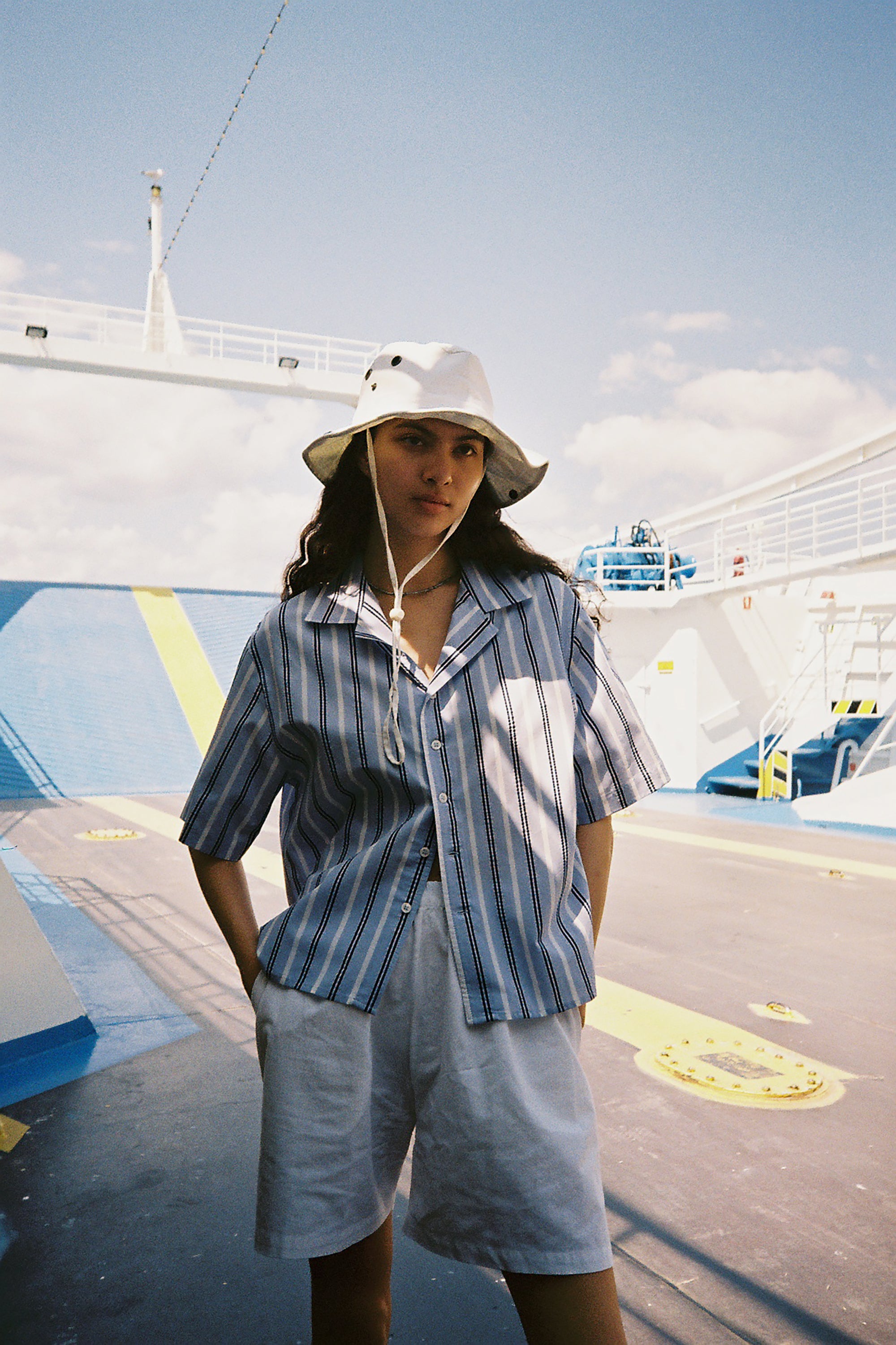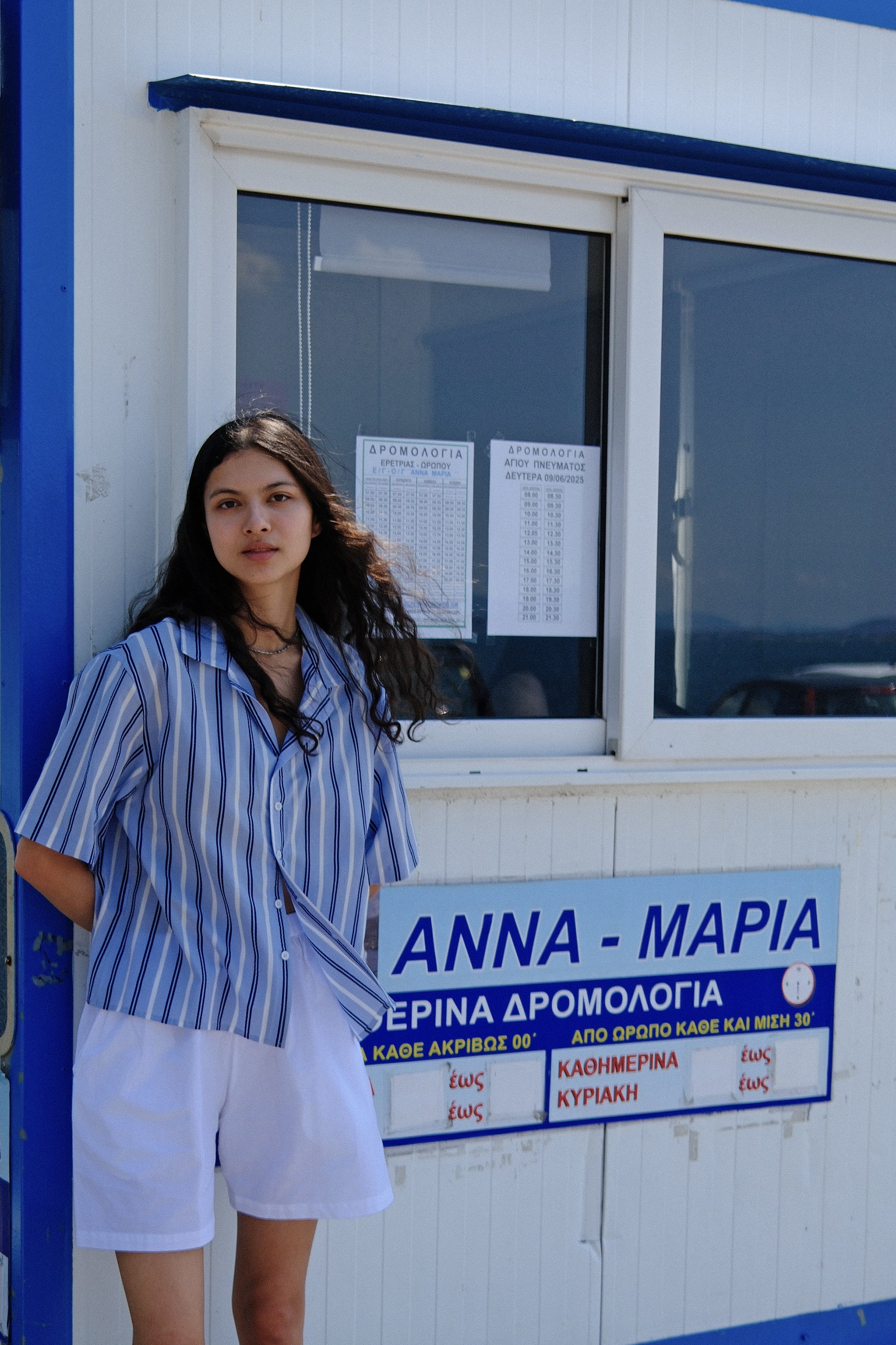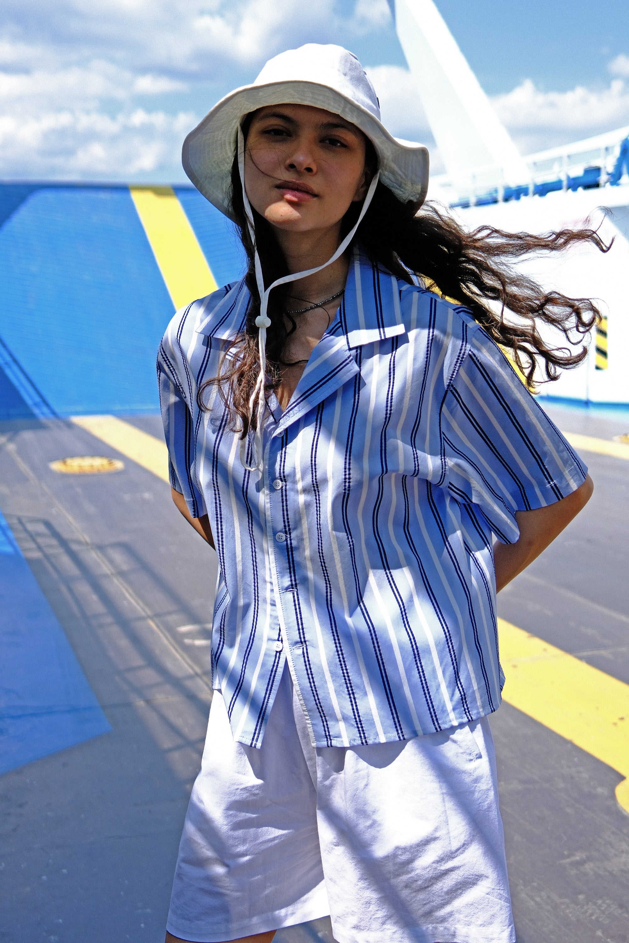 By the sea is our unisex every-day squared shirt featuring a short sleeve boxy cut with a wing collar. It is is crafted from 100% Italian cotton with a seersucker navy blue stripe. The shirt is finished with pearl buttons. No-restocks.