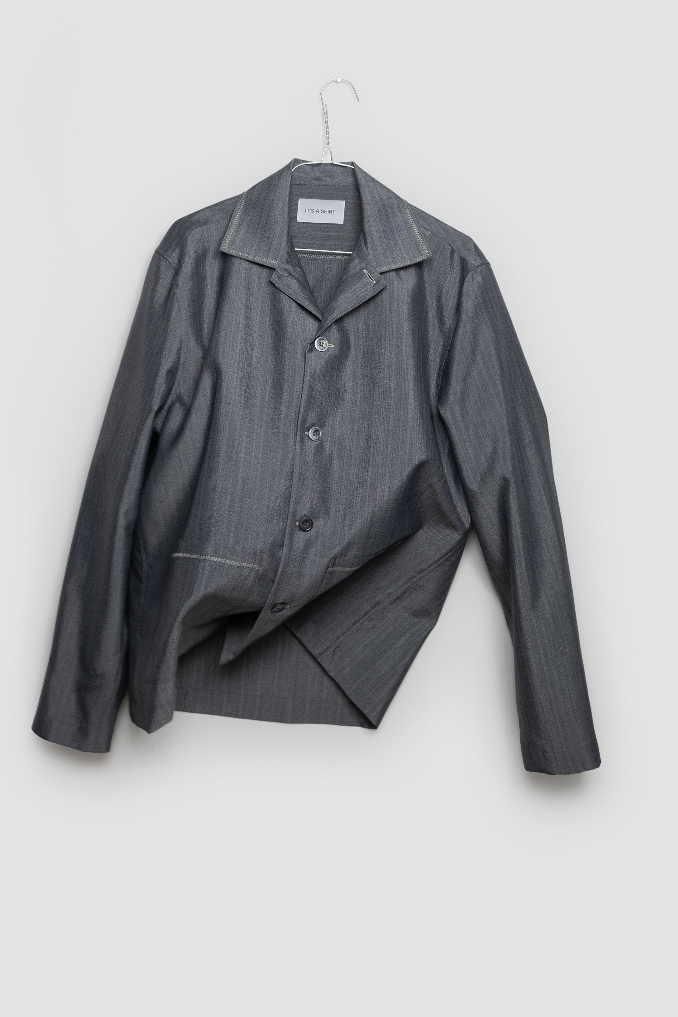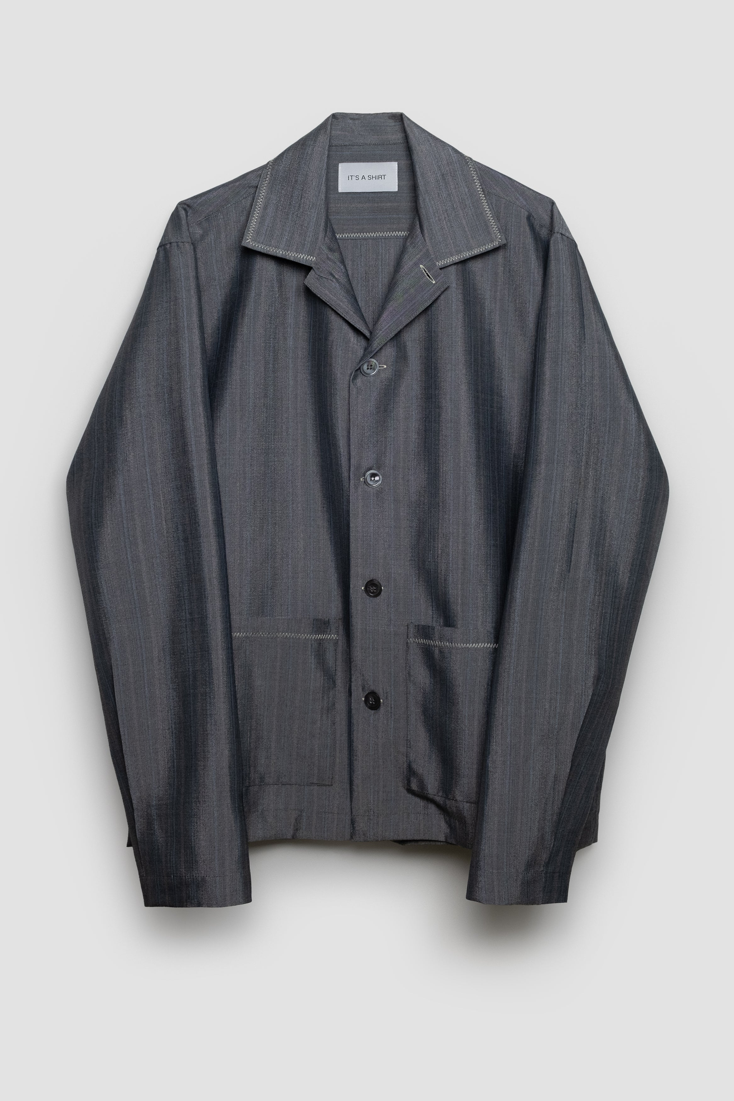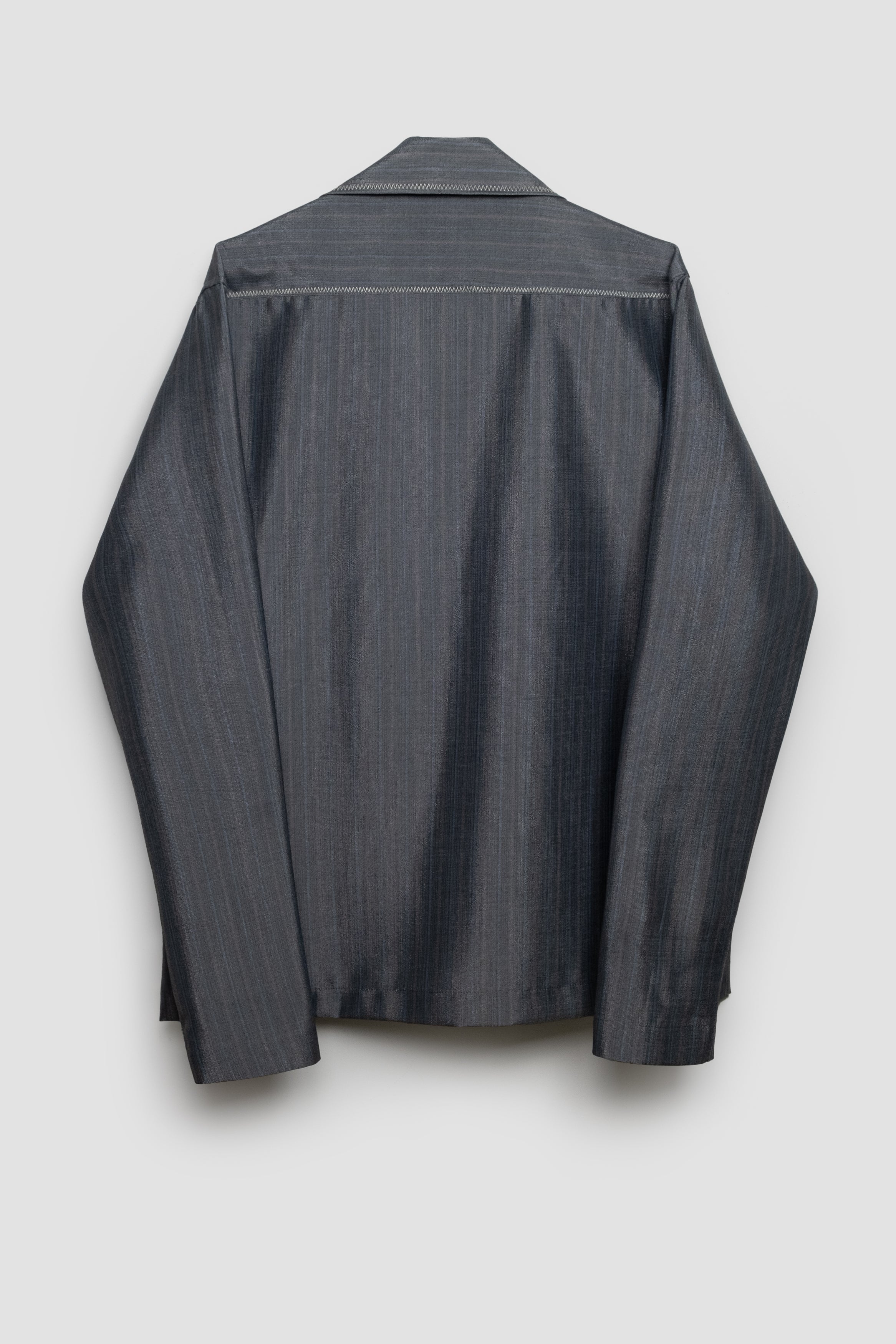 Tea Time is our long sleeve unisex over-shirt which owns a formal-blazer fit. Its cutaway collar can either be buttoned up or left wide open. Crafted from a greek dead-stock wool (3 ALPHA company), the garment can stand alone or be layered as an over shirt. There are two front pockets alongside its surface as well as contrast zig zag stitching as embellishment. The fabric has a shiny finishing. Limited quantities available.