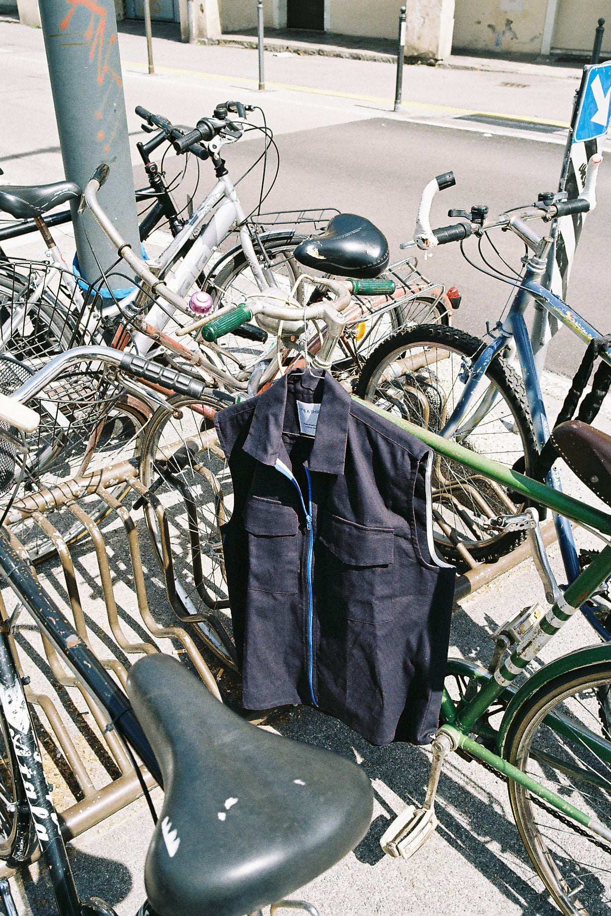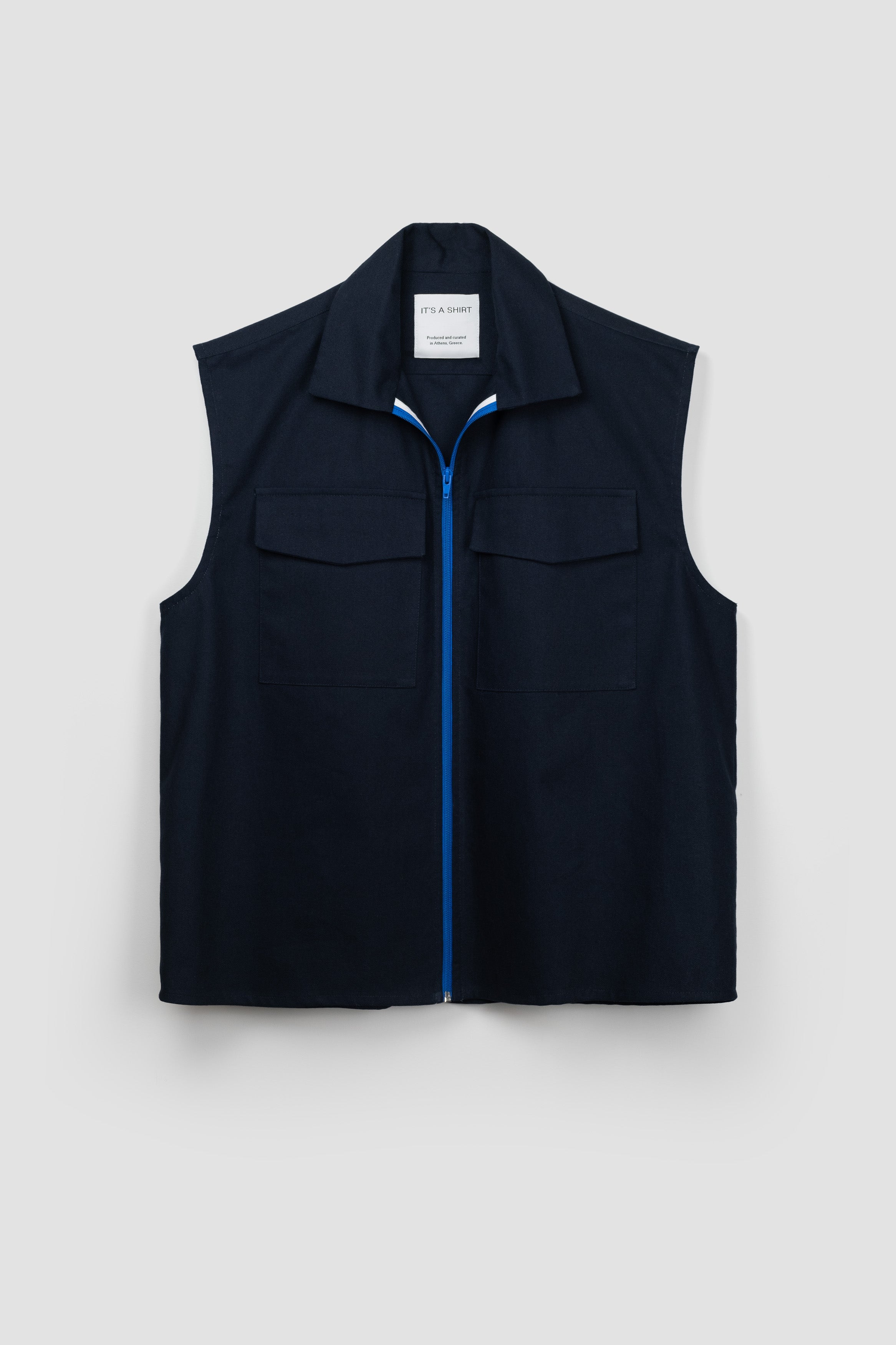 WORK IN PROGRESS: DEEP BLUE VEST is a squared vest with a loose fit. Its cutaway collar can be zipped up or left wide open. It has also two generous flap pockets on the front. Crafted in a heavy dead-stock cotton, the garment is appropriate to be layered all year round.