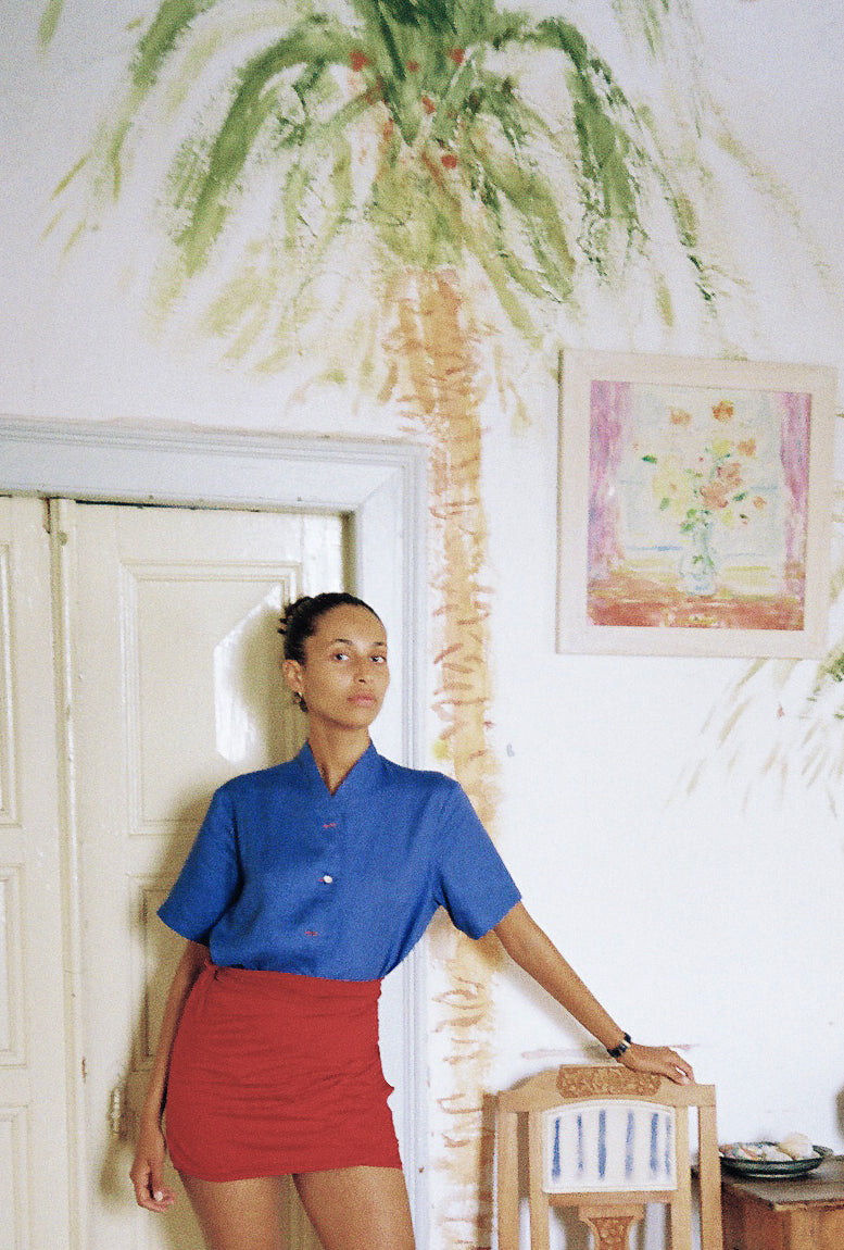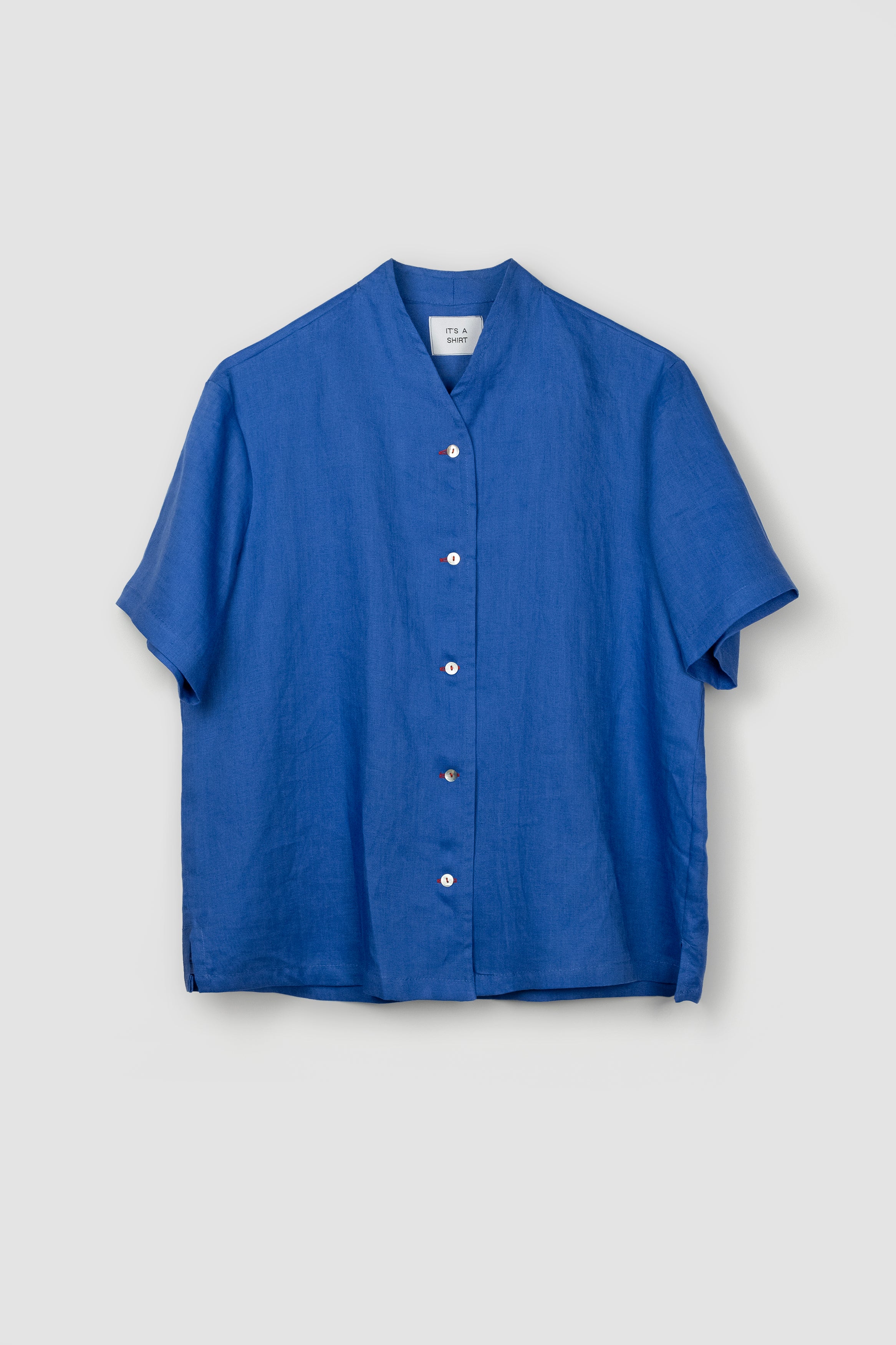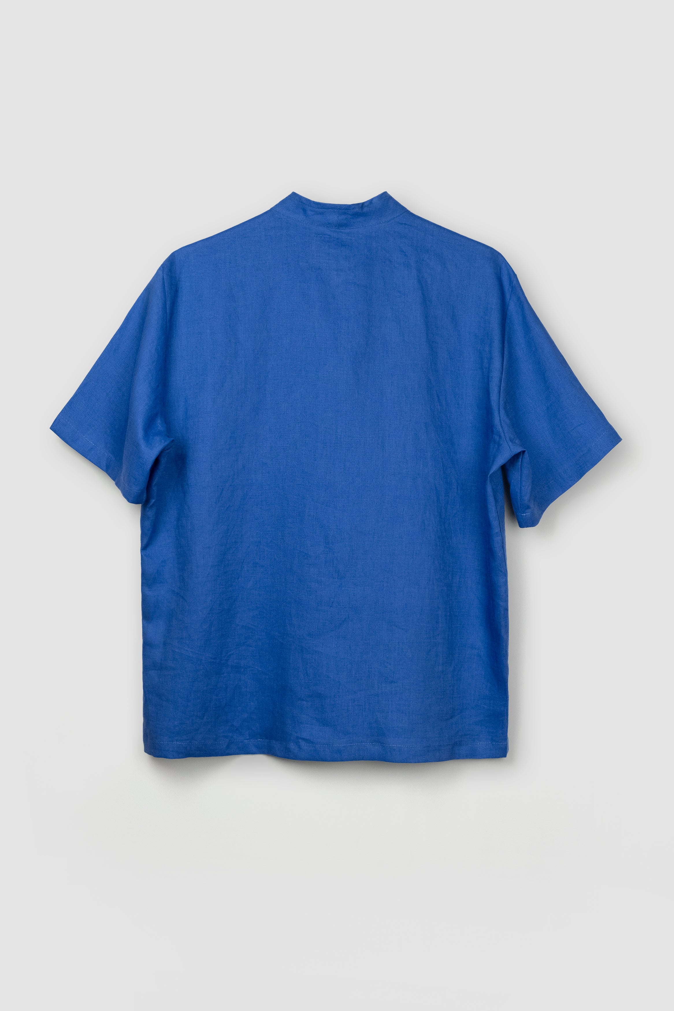 Malina is a short sleeve shirt with a V-neck collar inspired by the Japanese wafuku robes. Its boxy-squared cut makes it unisex and easy-to-wear as an every day garment owing a delicate collar shape. To create this garment we used blue linen produced in Greece as well as mother of pearl buttons. Limited pieces available.