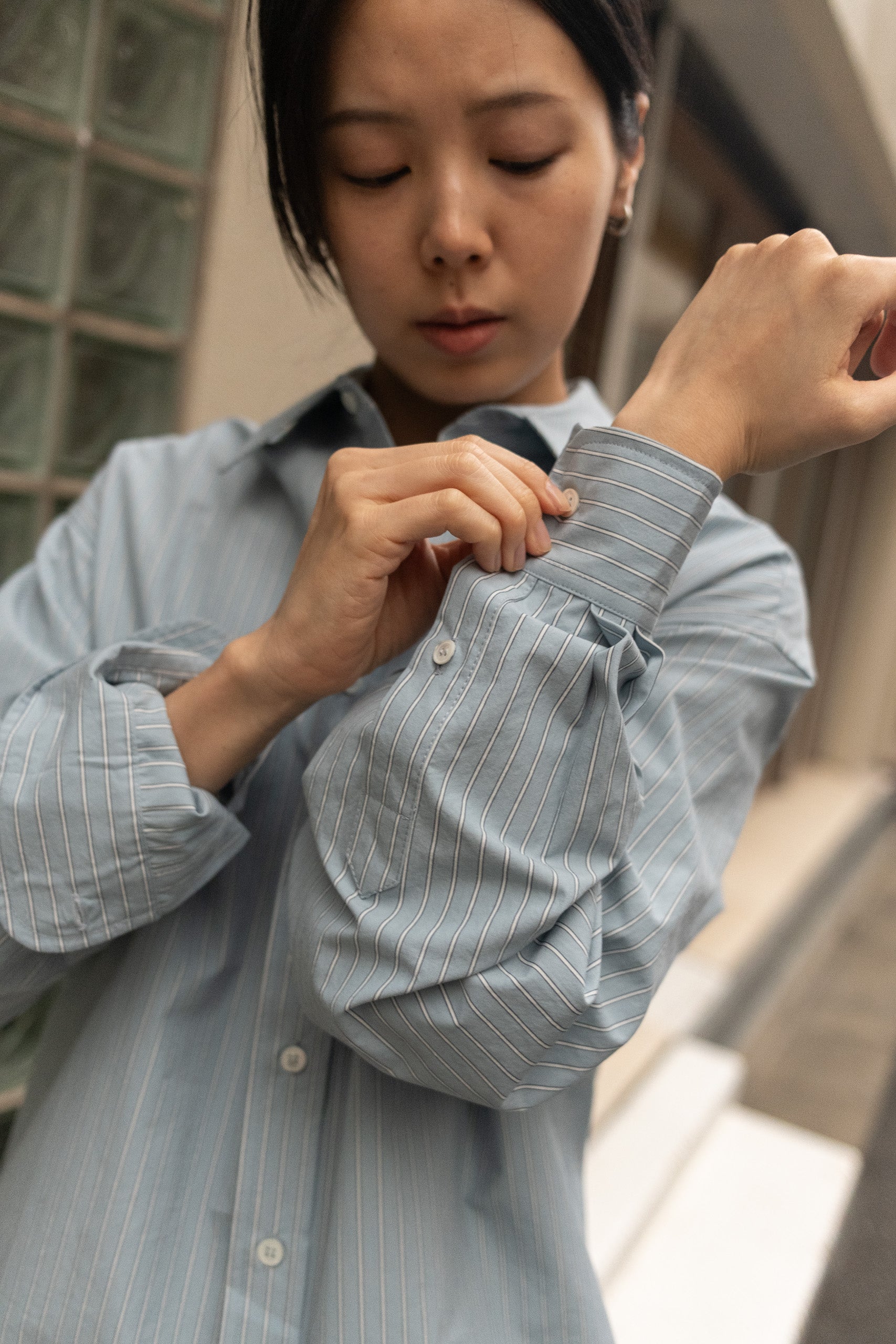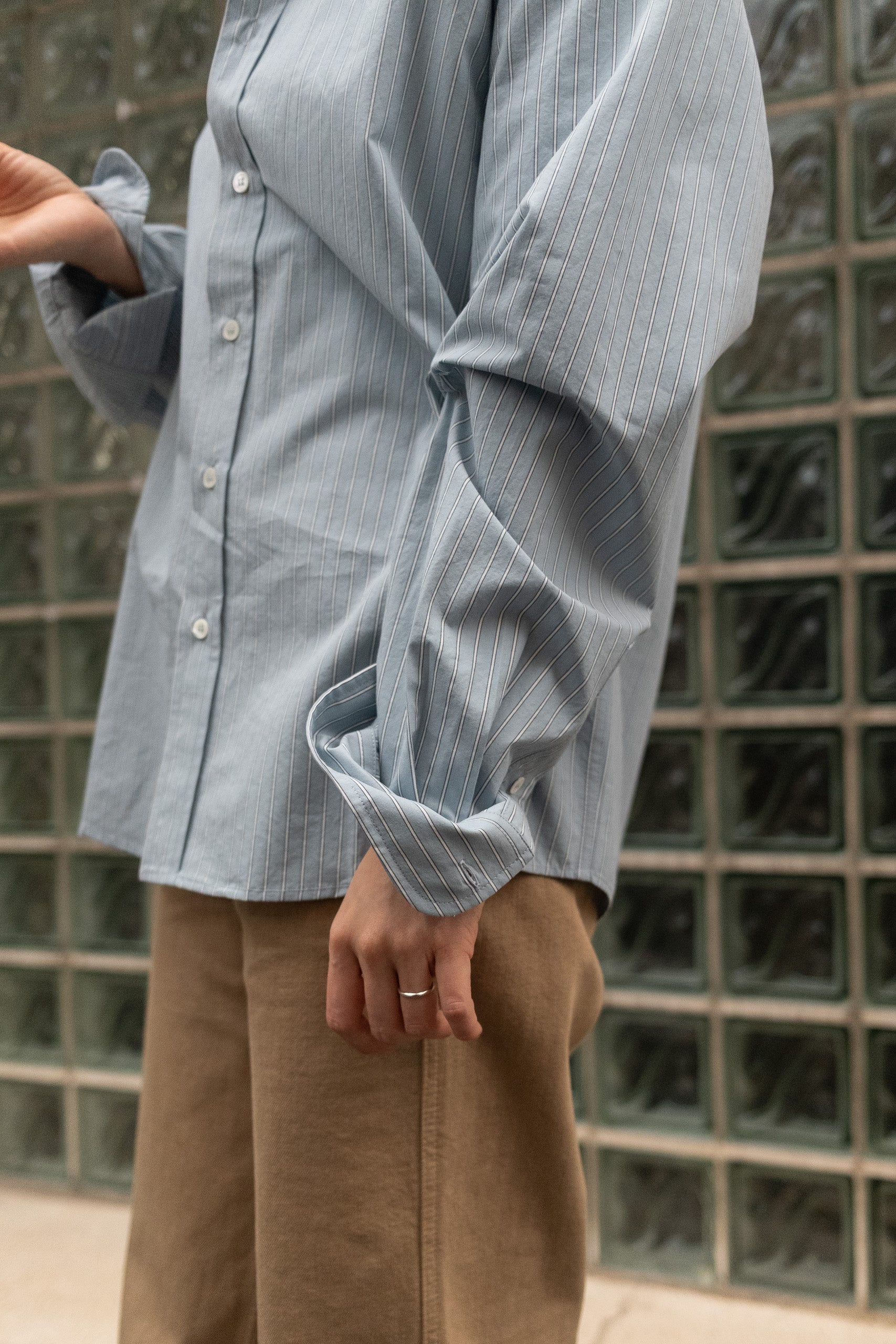 Our timeless long-sleeve unisex classic shirt features a contemporary fit that strikes the perfect balance between relaxed and refined, making it an ideal companion for any occasion throughout the day or even the year. Crafted from crisp, baby blue Italian cotton with white stripes, this shirt has a velvet texture and a peached finish. It is elegantly finished with natural mother or pearl buttons. Each garment is crafted in our family-run workshop, where quality and care shape every shirt we produce. Designed for lasting wear, the CREAMY SKY Classic is a limited edition shirt for those who twist the classic into playful and distinctive.