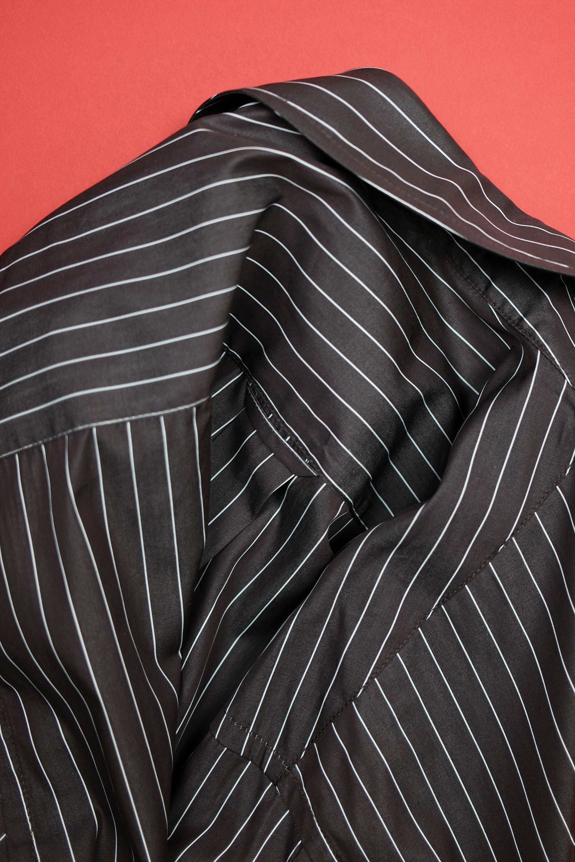 Our timeless long-sleeve unisex classic shirt features a contemporary fit that strikes the perfect balance between relaxed and refined, making it an ideal companion for any occasion throughout the day or even the year. Crafted from crisp, brown Italian cotton with thin white stripes, this shirt has a delicate texture. It is elegantly finished with natural mother or pearl buttons. Each garment is crafted in our family-run workshop, where quality and care shape every shirt we produce. Designed for lasting wear, the PENCIL Classic is for those who twist the classic into playful and distinctive.