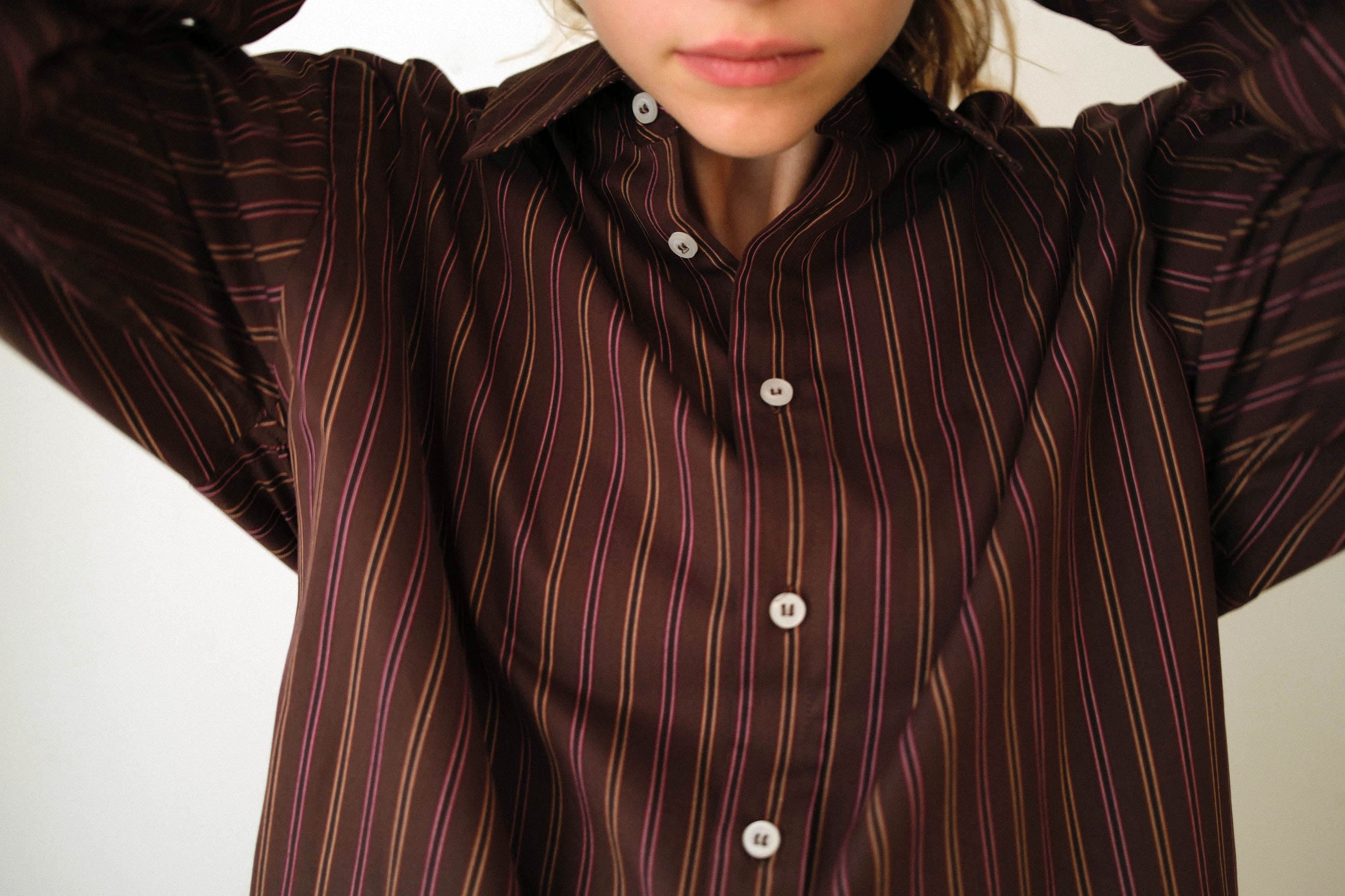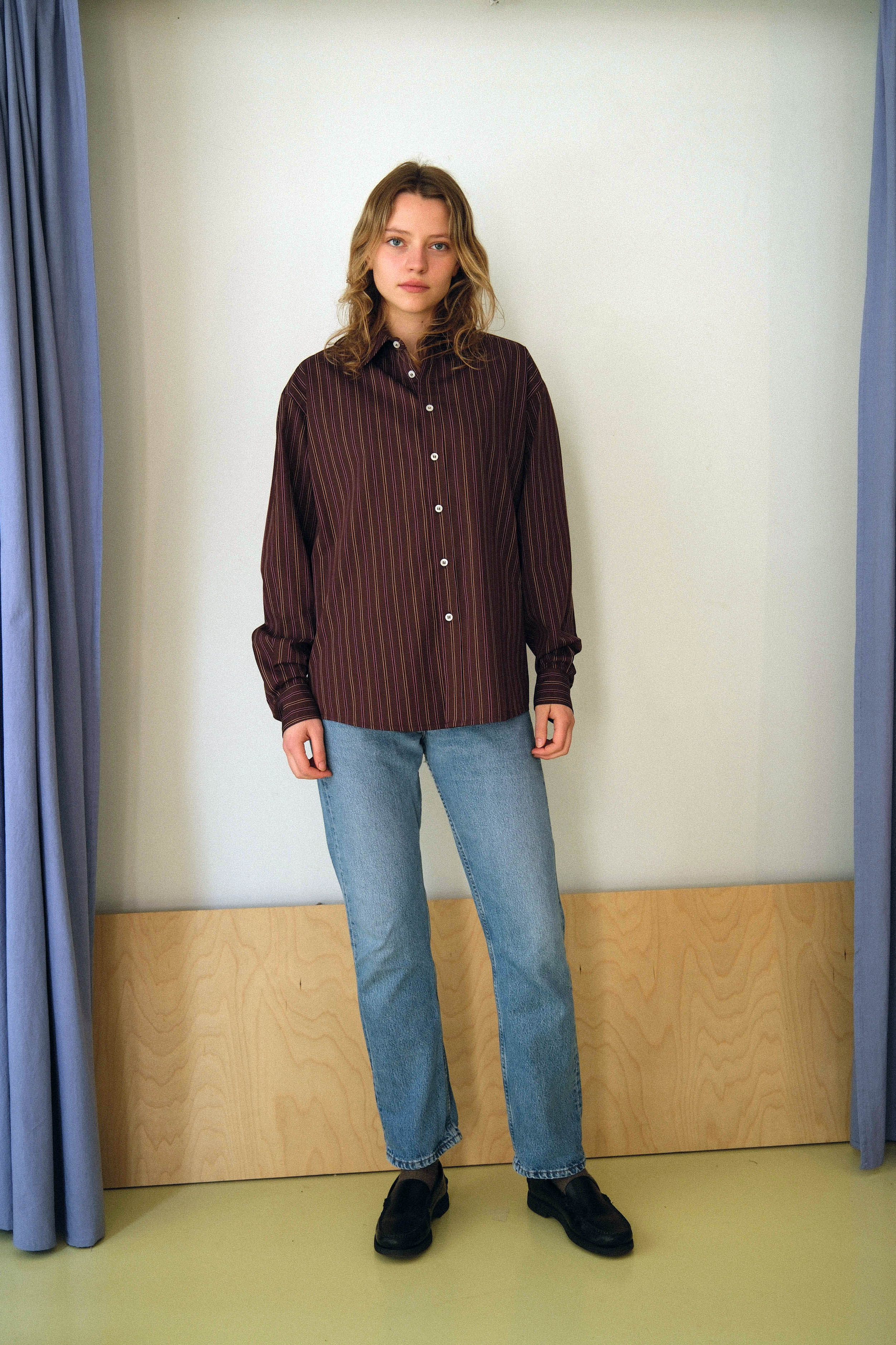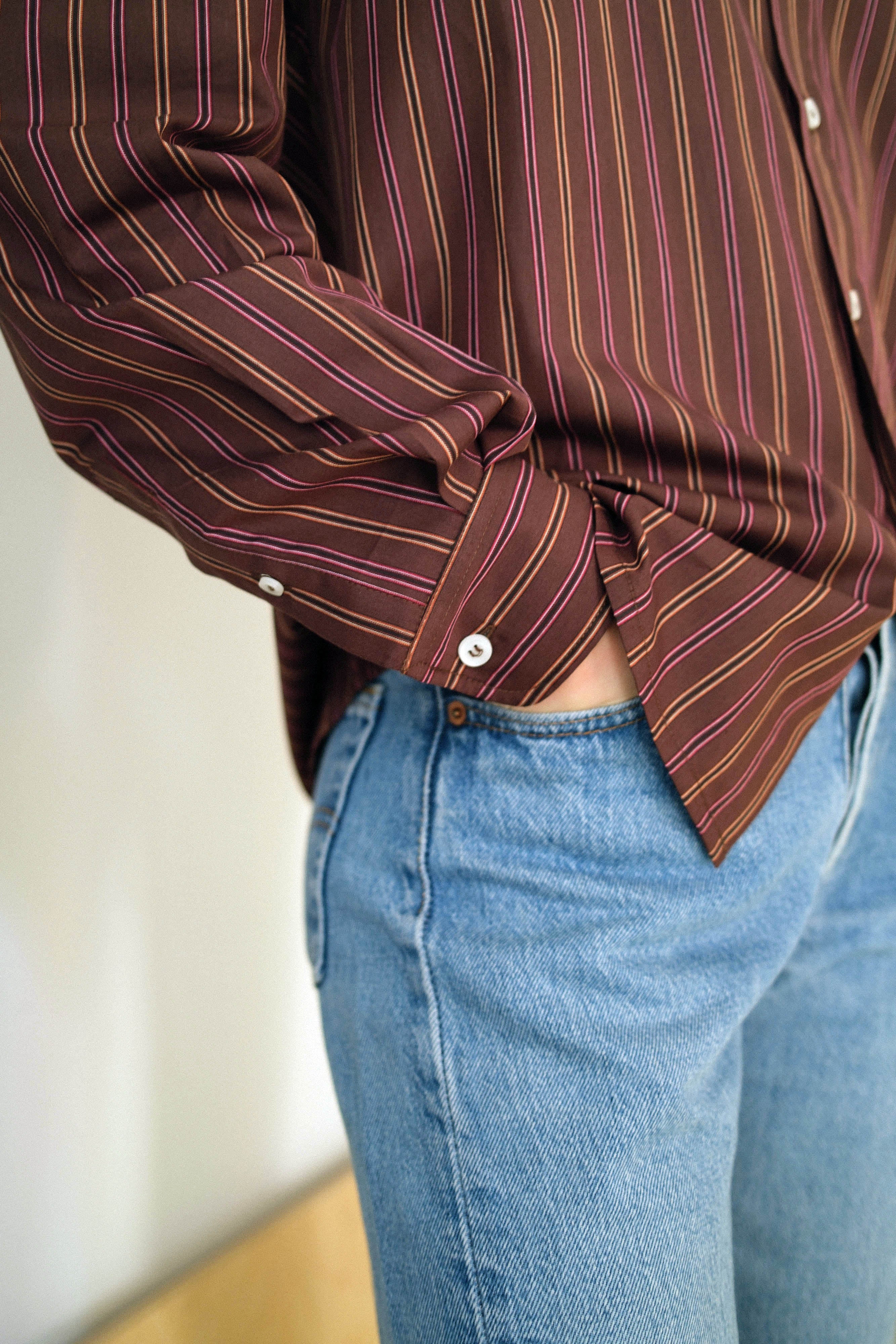 This timeless long-sleeve unisex shirt features a contemporary twisted fit that strikes the perfect balance between relaxed and refined, making it an ideal companion for any occasion throughout the day. Crafted from a silky colorful striped poplin produce in north Italy, the shirt shapes a sleek silhouette and is beautifully finished with white matte bone buttons. Each garment is produced in our family-run workshop, ensuring quality and care in every piece. Designed for durability, HOLLY MOTORS classic is a funky and versatile shirt for every season, on any occasion. Only 1 garment available per size.
