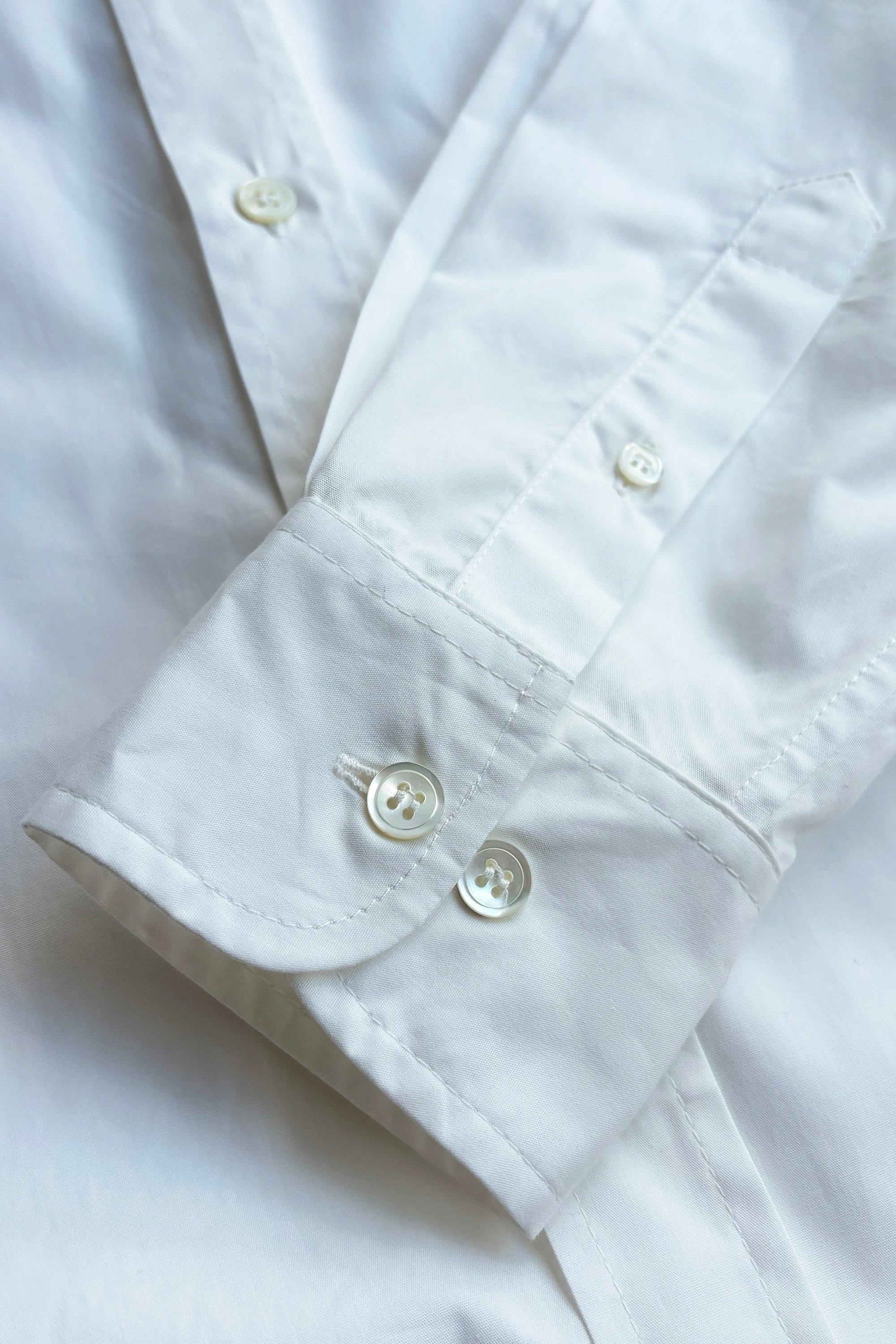 IVORY POLAR belongs to our CLASSICS collection, it's our long sleeve timeless shirt with a unisex cut and a contemporary twist. Through trials and errors we transformed the strict button down collar into a more playful version of it for any occasion. The fit is relaxed and the sleeves are quite loose. To create this garment we used an elevated crispy off white poplin produced in north Italy. It is finished with natural mother of pearl buttons. Each and every shirt is produced in our small-family-production space. This garment is made to last and accompany you all the way.