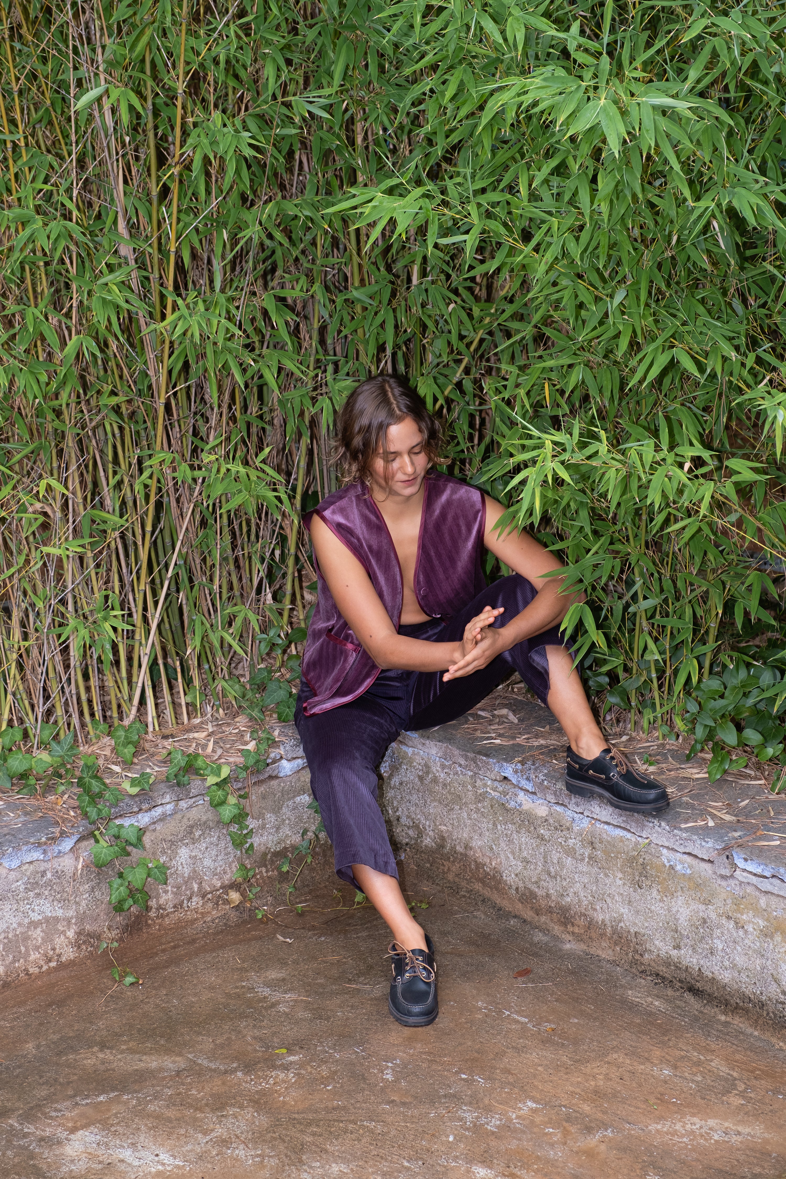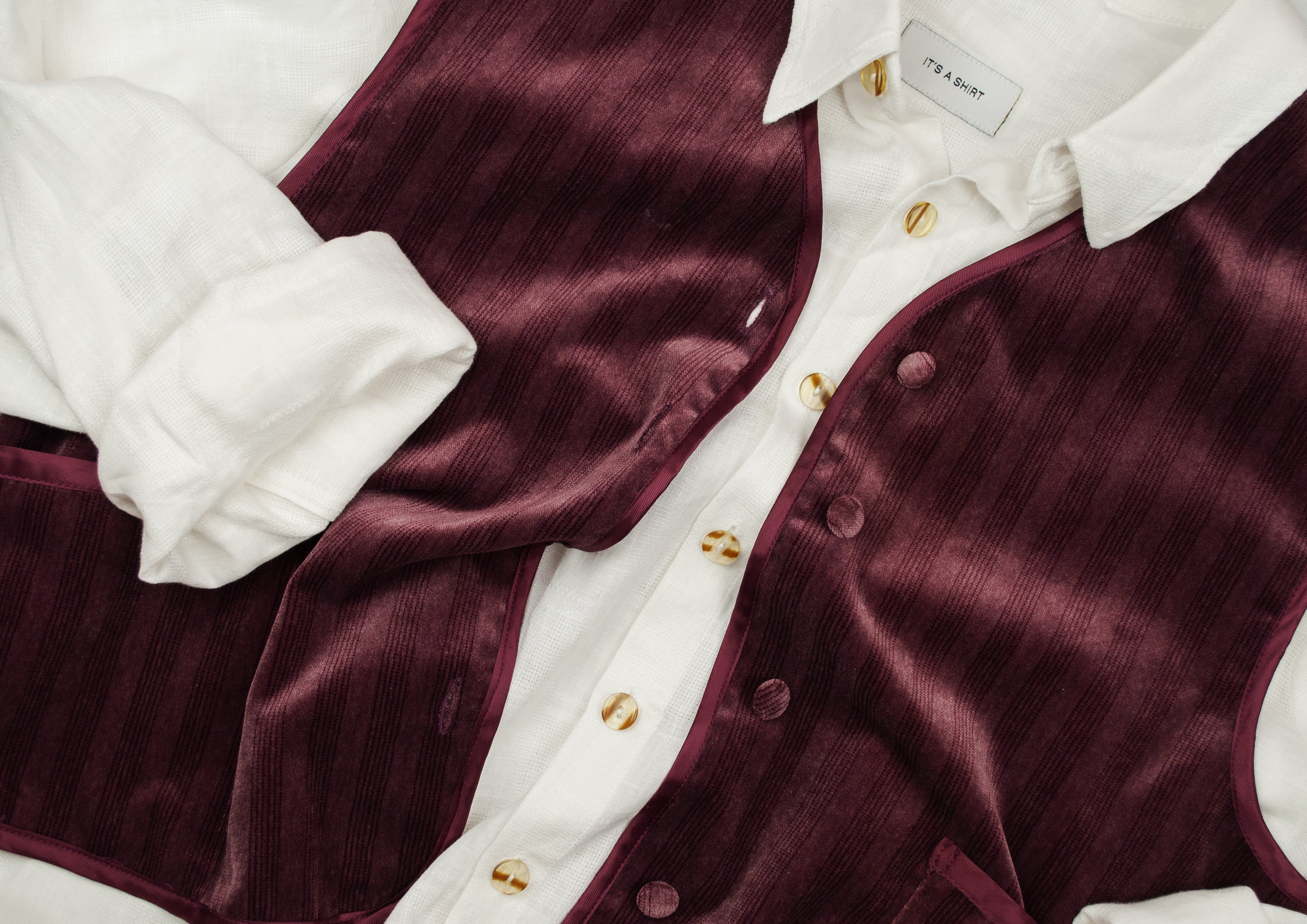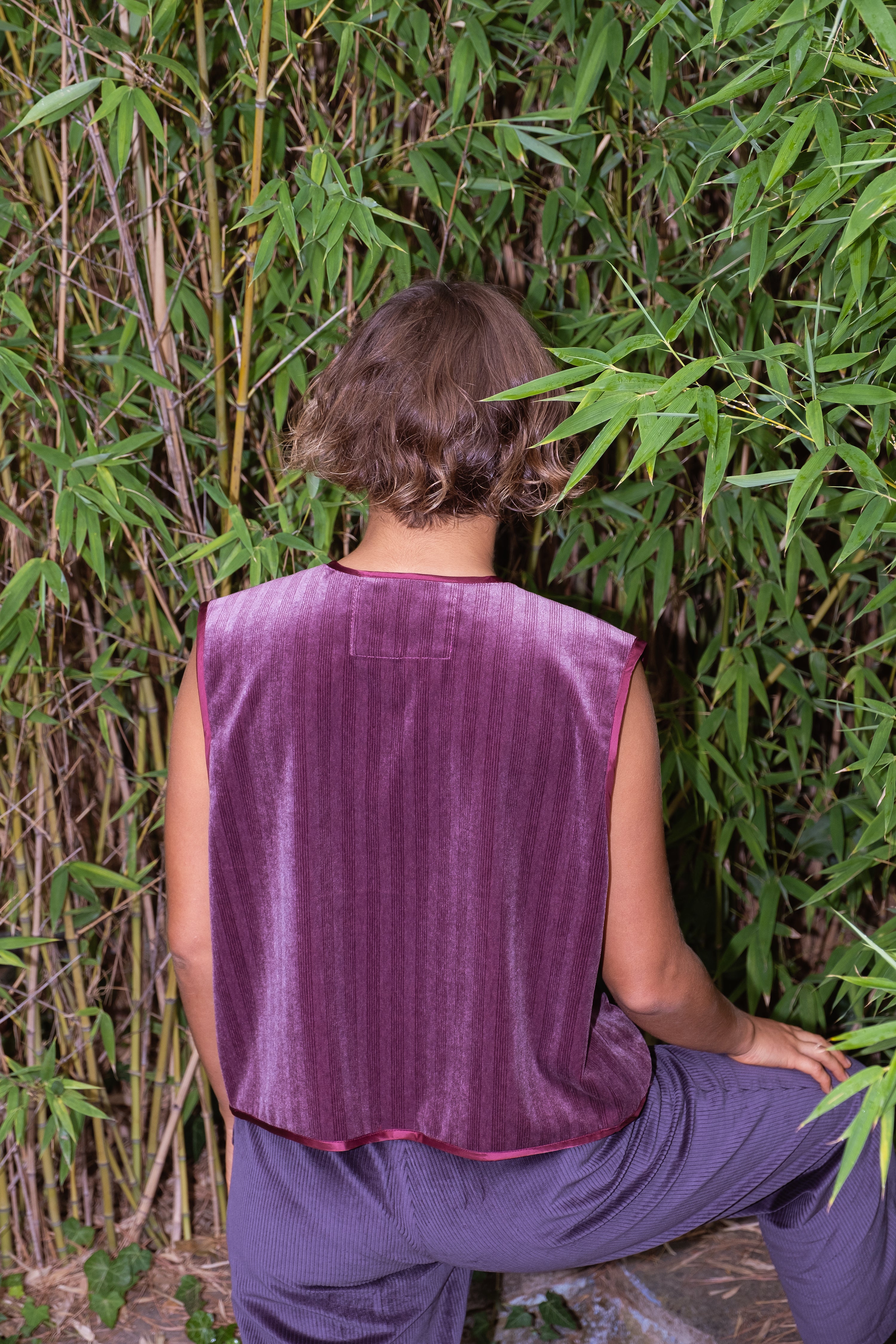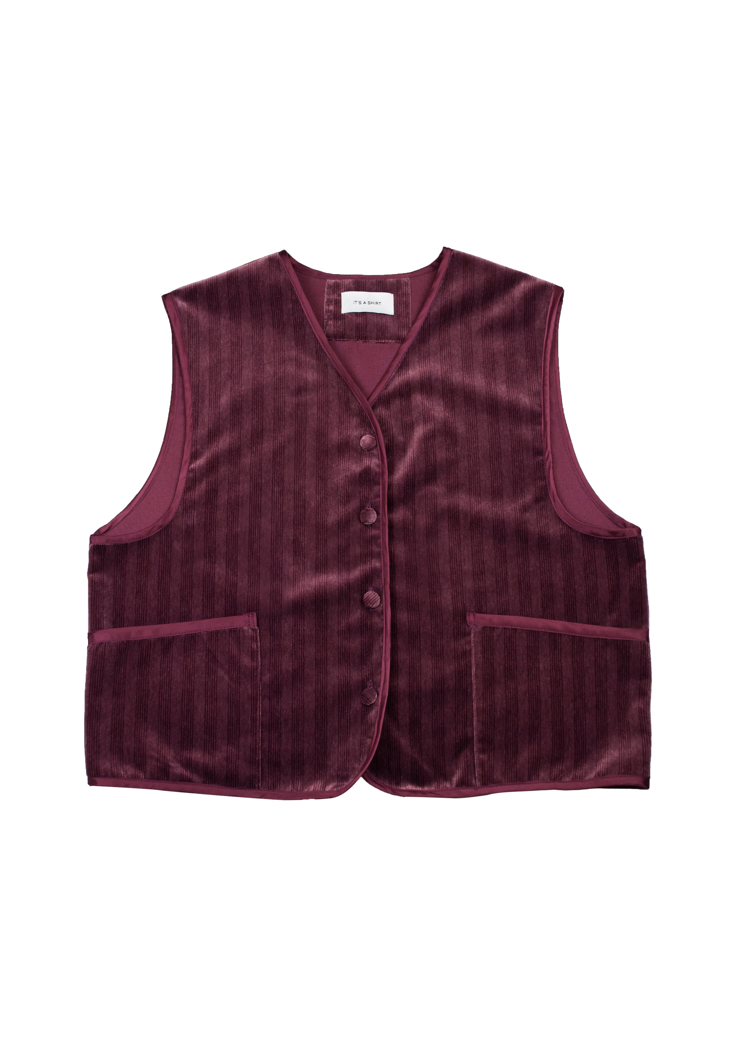 is a squared vest in burgundy colour made of french corduroy with a velvet texture. Boxy fit, V-neck finished with fabric middle-sized buttons.