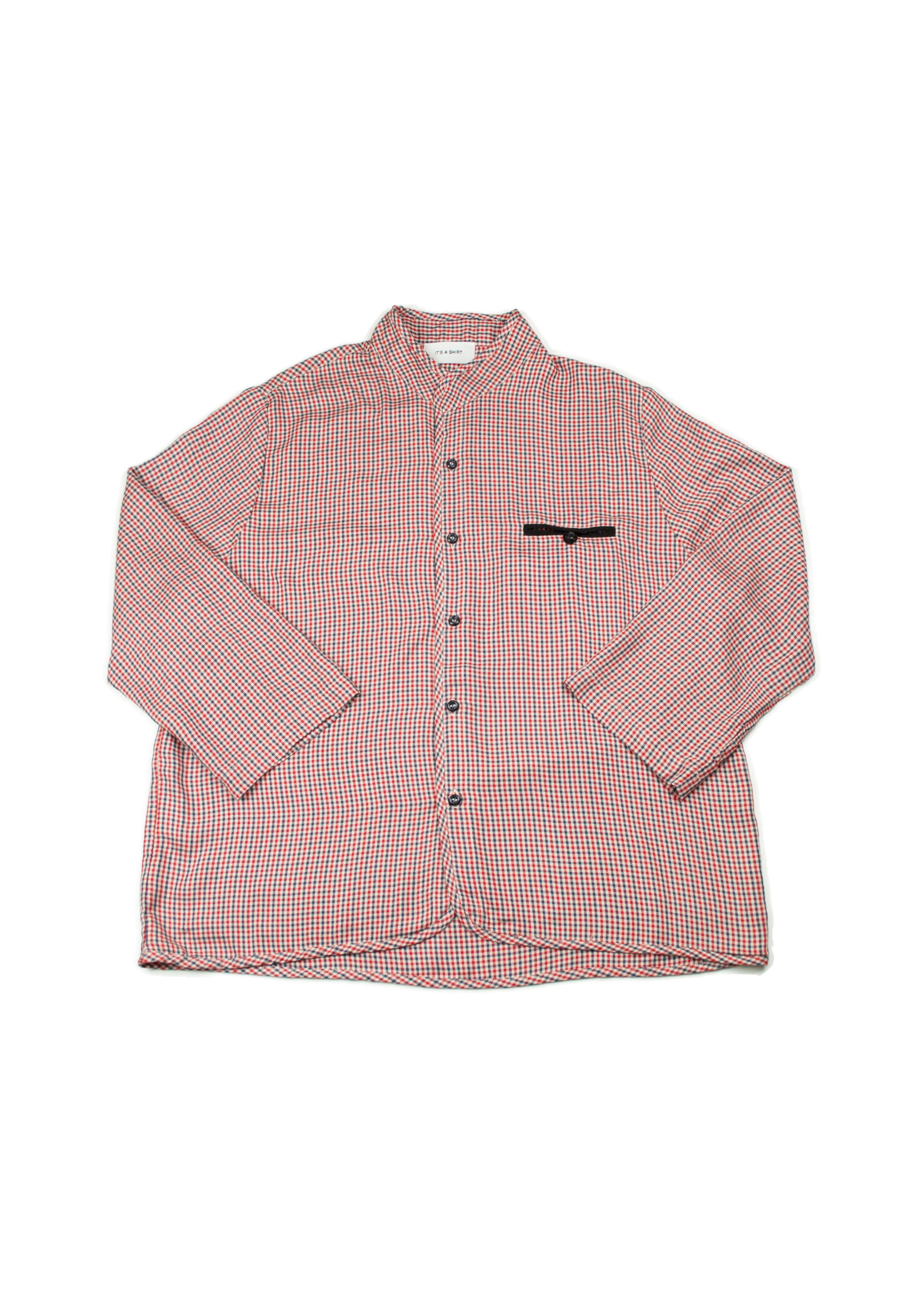 is a squared Shepherd's check unisex shirt in a blue red and white colour combination made of english cotton/viscose. Boxy fit, mandarin collar, finished with small-sized blue pearl buttons.