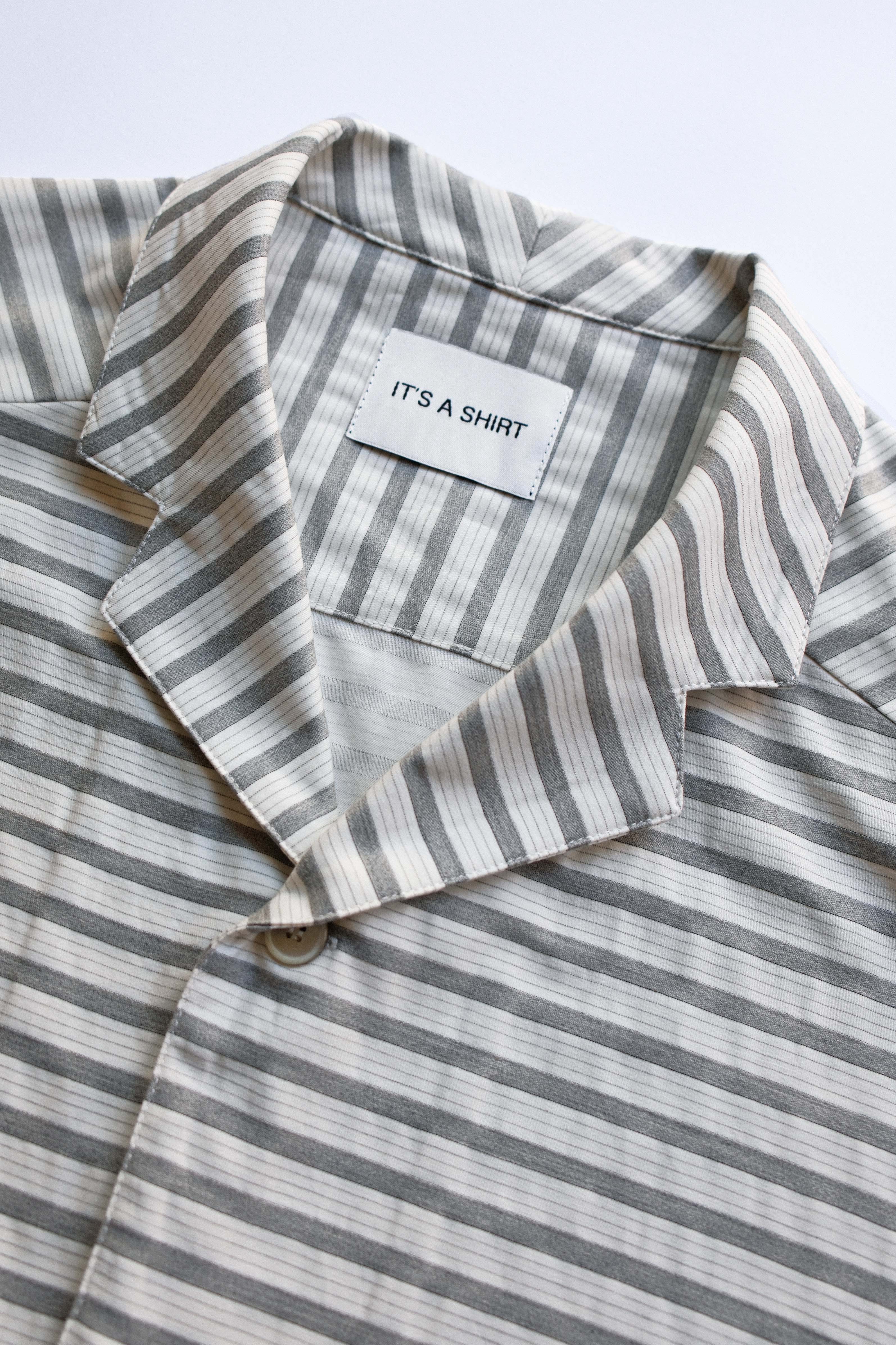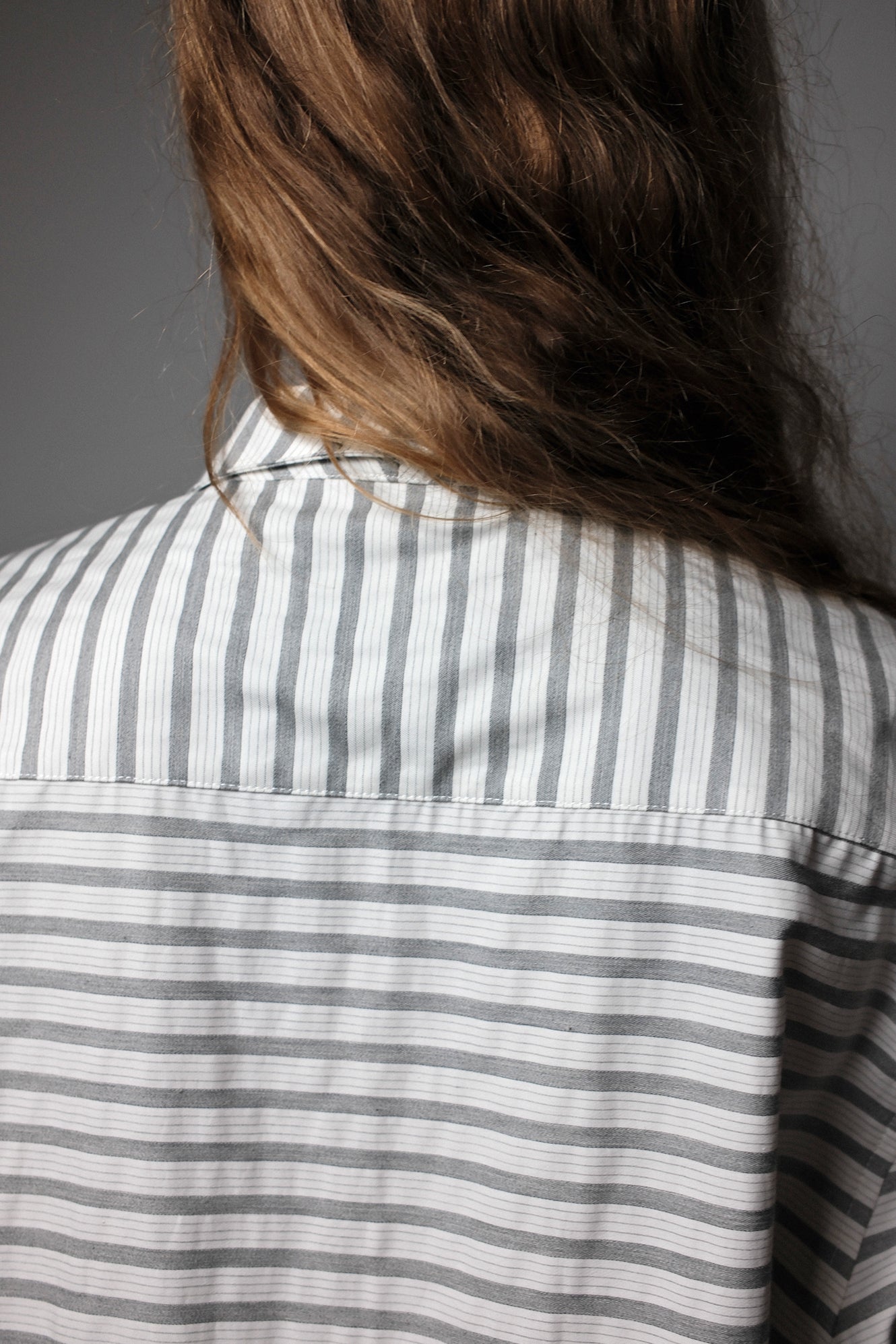 The garment presents a unisex, boxy silhouette, a delicate wing collar, two front pockets, and long sleeves with squared cuffs. It can be worn open as a jacket or buttoned up as a sophisticated shirt. Each and every shirt is produced in our family production space located in Athens. No restocks, limited pieces available.