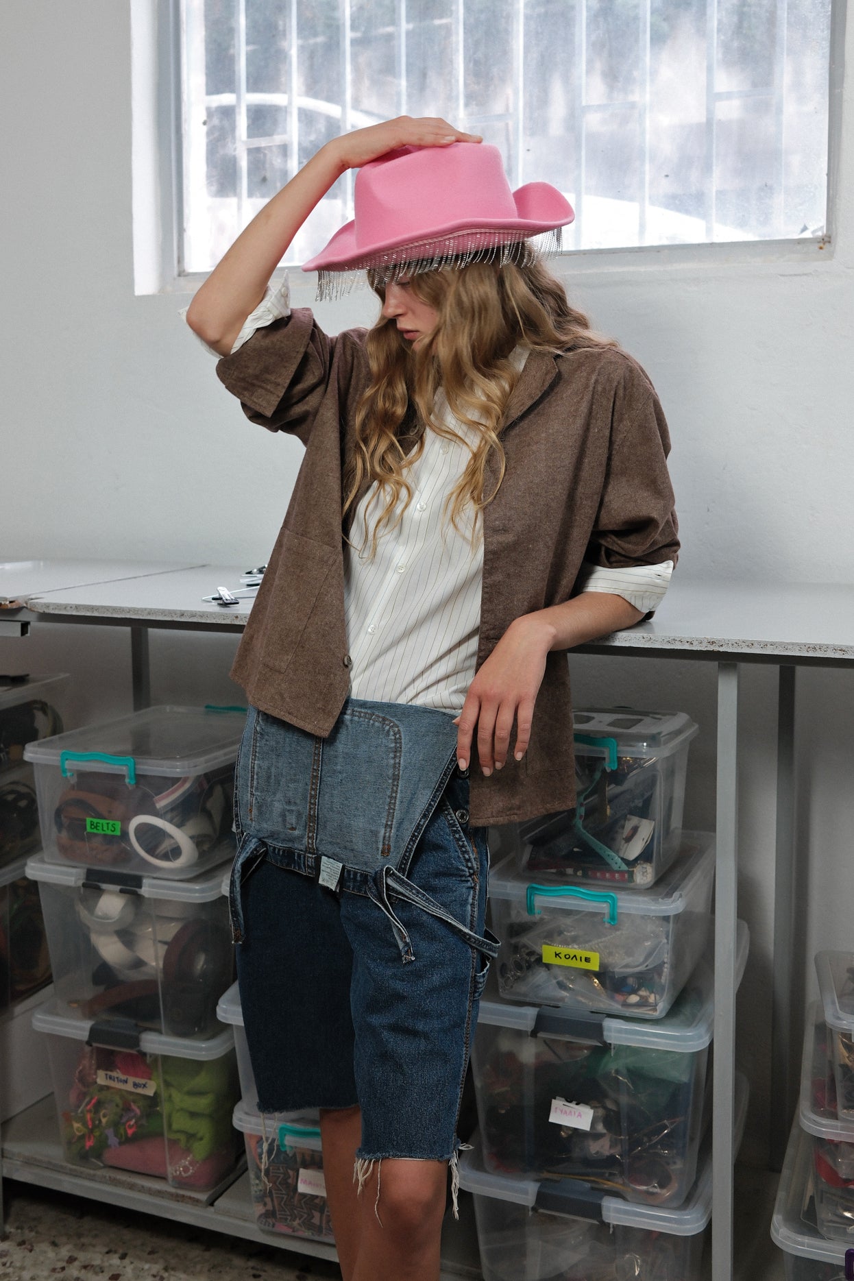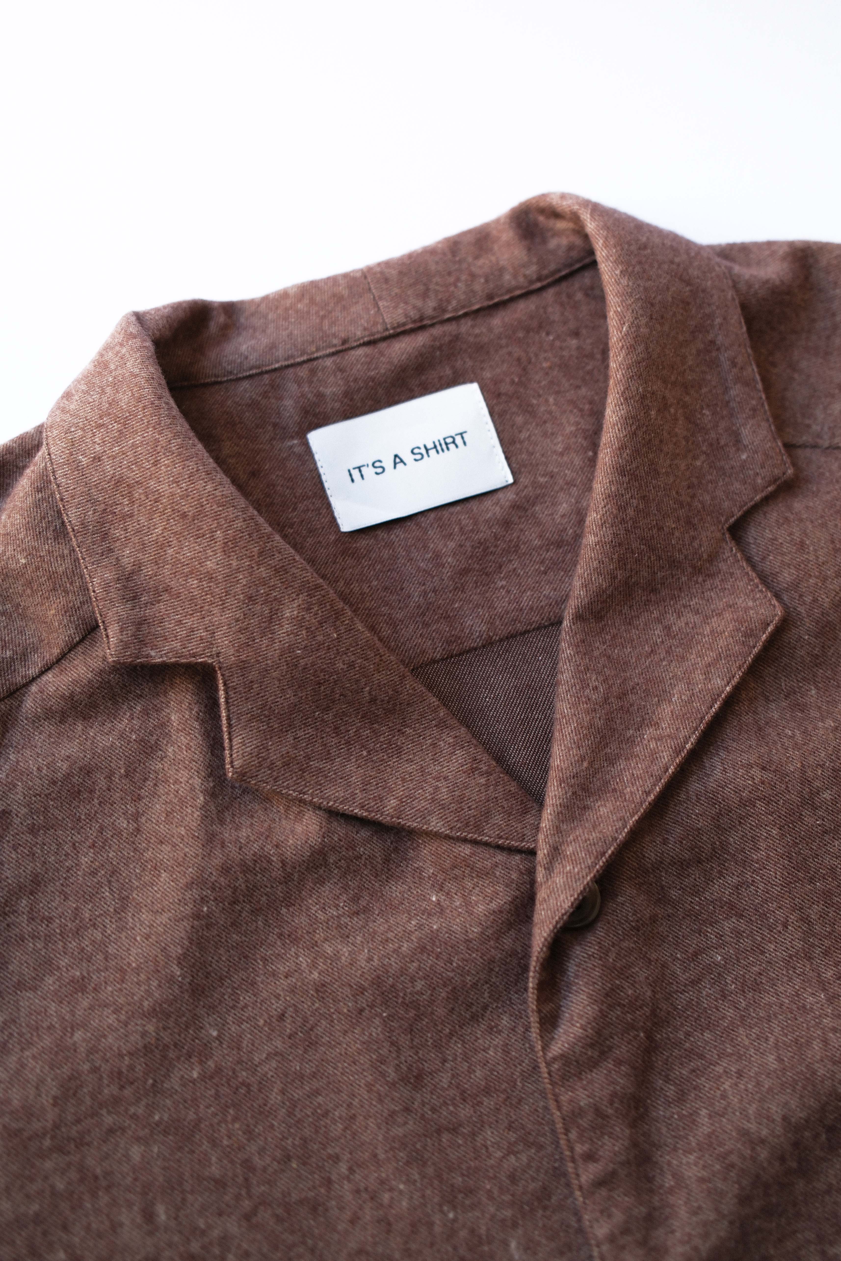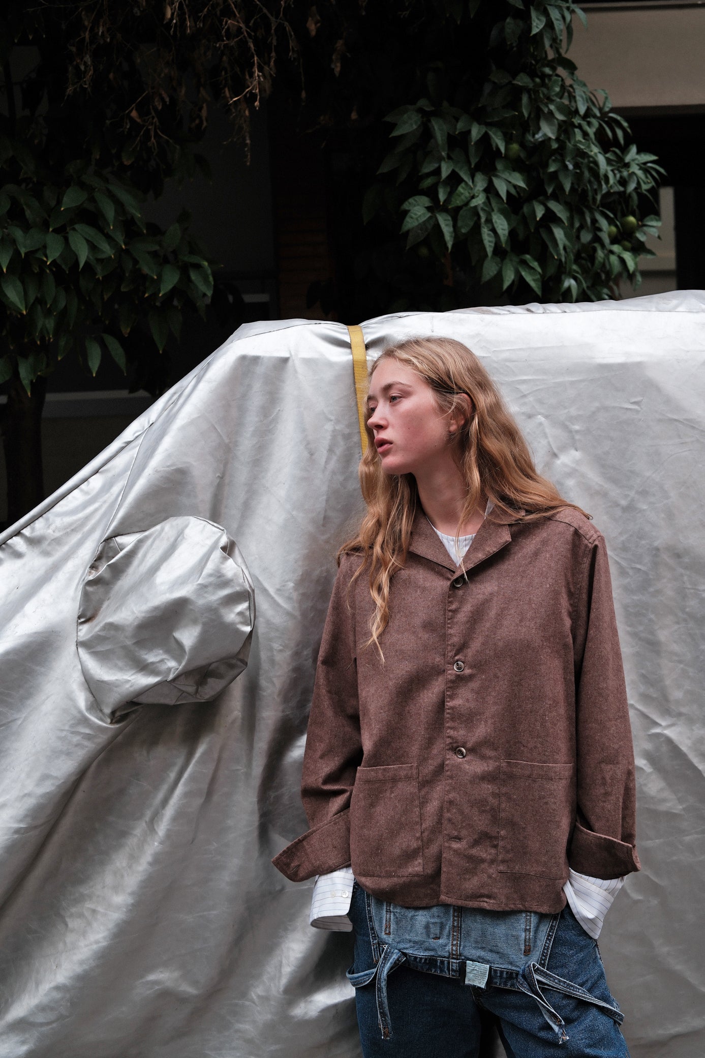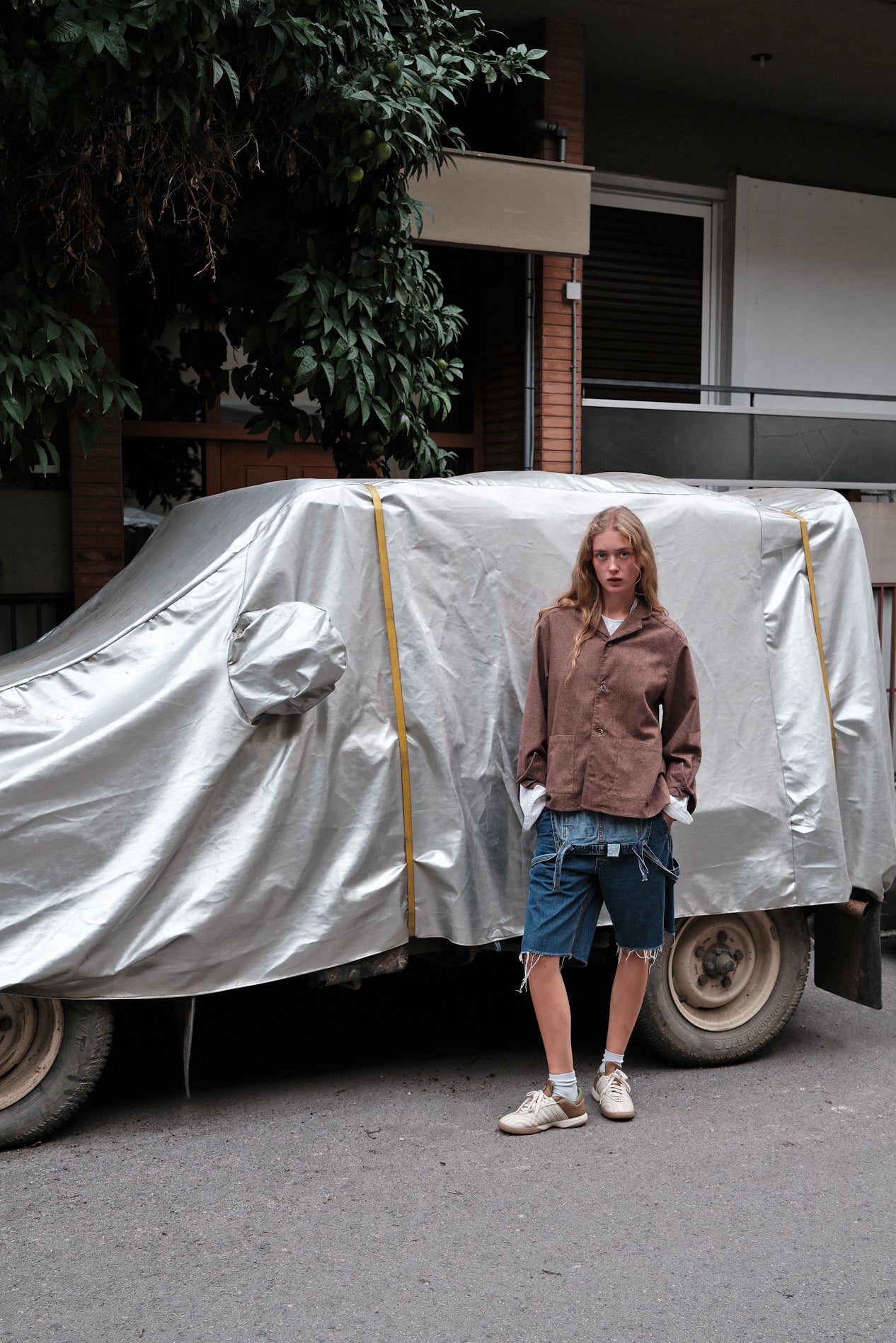 The garment presents a unisex, boxy silhouette, a delicate wing collar, two front pockets, and long sleeves with squared cuffs. It can be worn open as a jacket or buttoned up as a sophisticated shirt. Each and every shirt is produced in our family production space located in Athens. No restocks, limited pieces available.