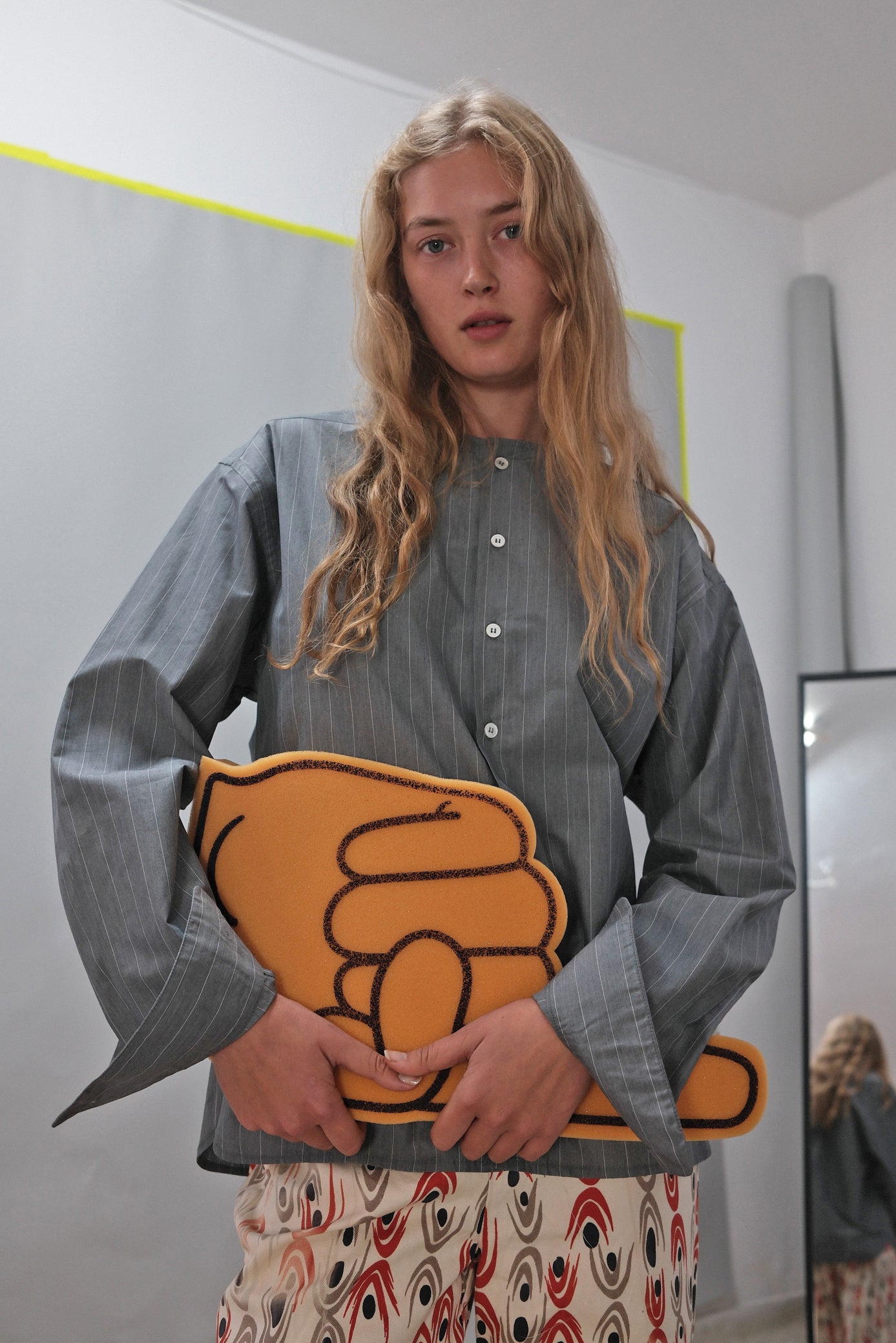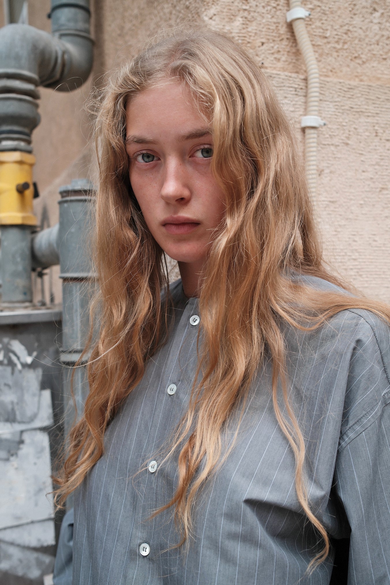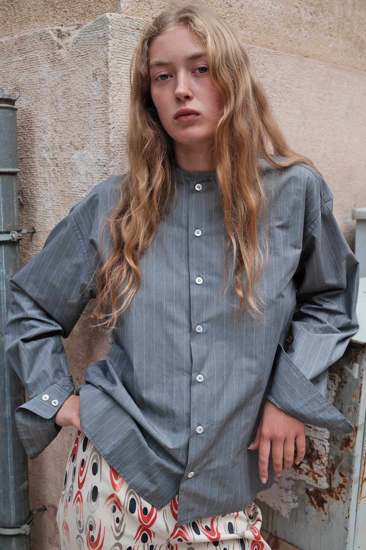 We firstly created the cut in 2022, and this is the elevated version of the initial design. It offers a relaxed fit, but not too oversized, and features a rounded neckline in place of a collar, making it appropriate to be layered with other garments. It has been crafted from premium striped poplin sourced in Italy.