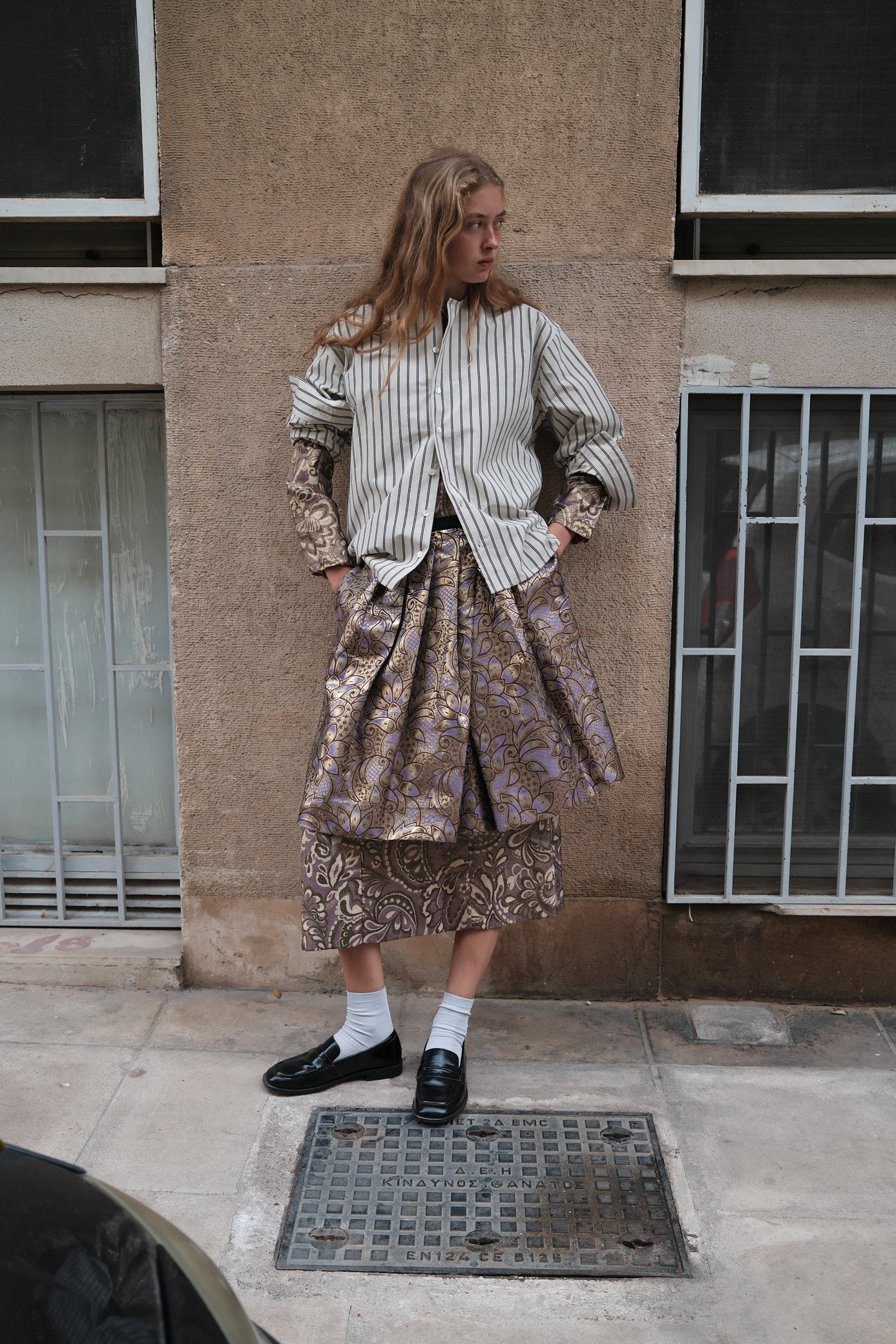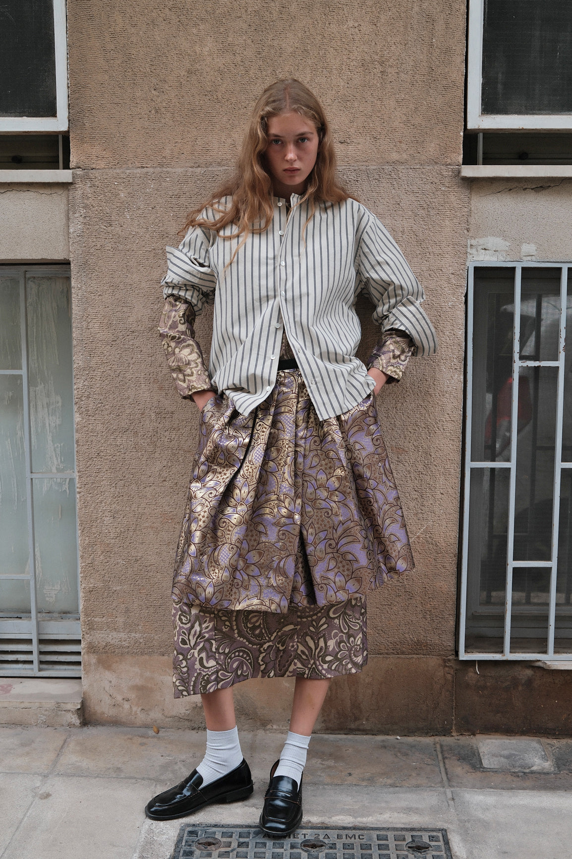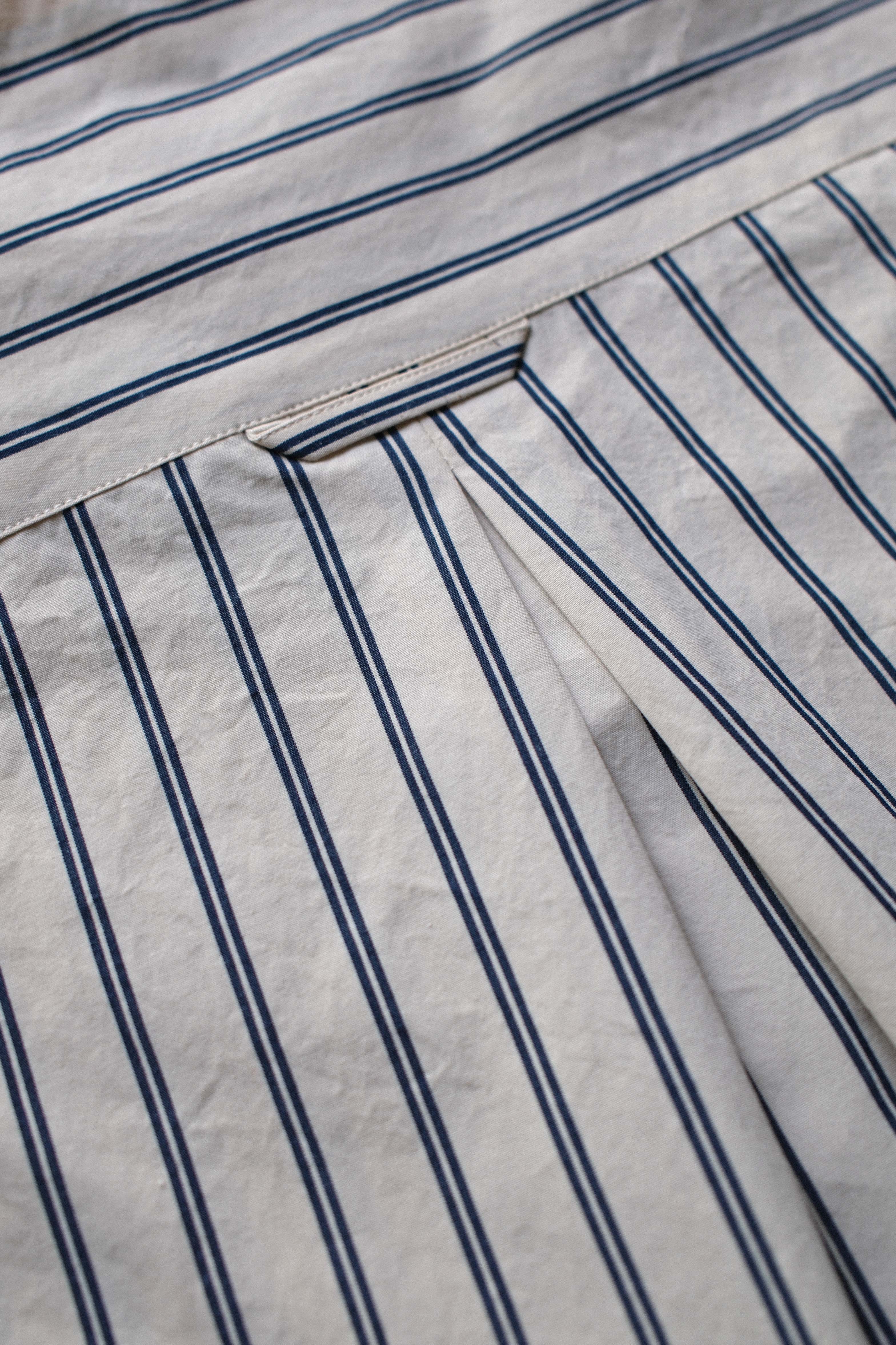 WALLPAPER shirt is minimal and bold featuring a pleated detail on the back and shaping a structural silhouette. It is finished with natural mother of pearl buttons. This shirt is for all year round and it promises to keep our skin great company. Limited pieces.