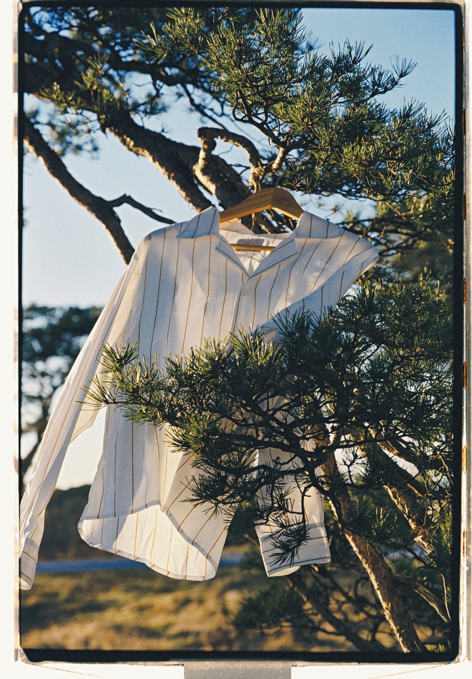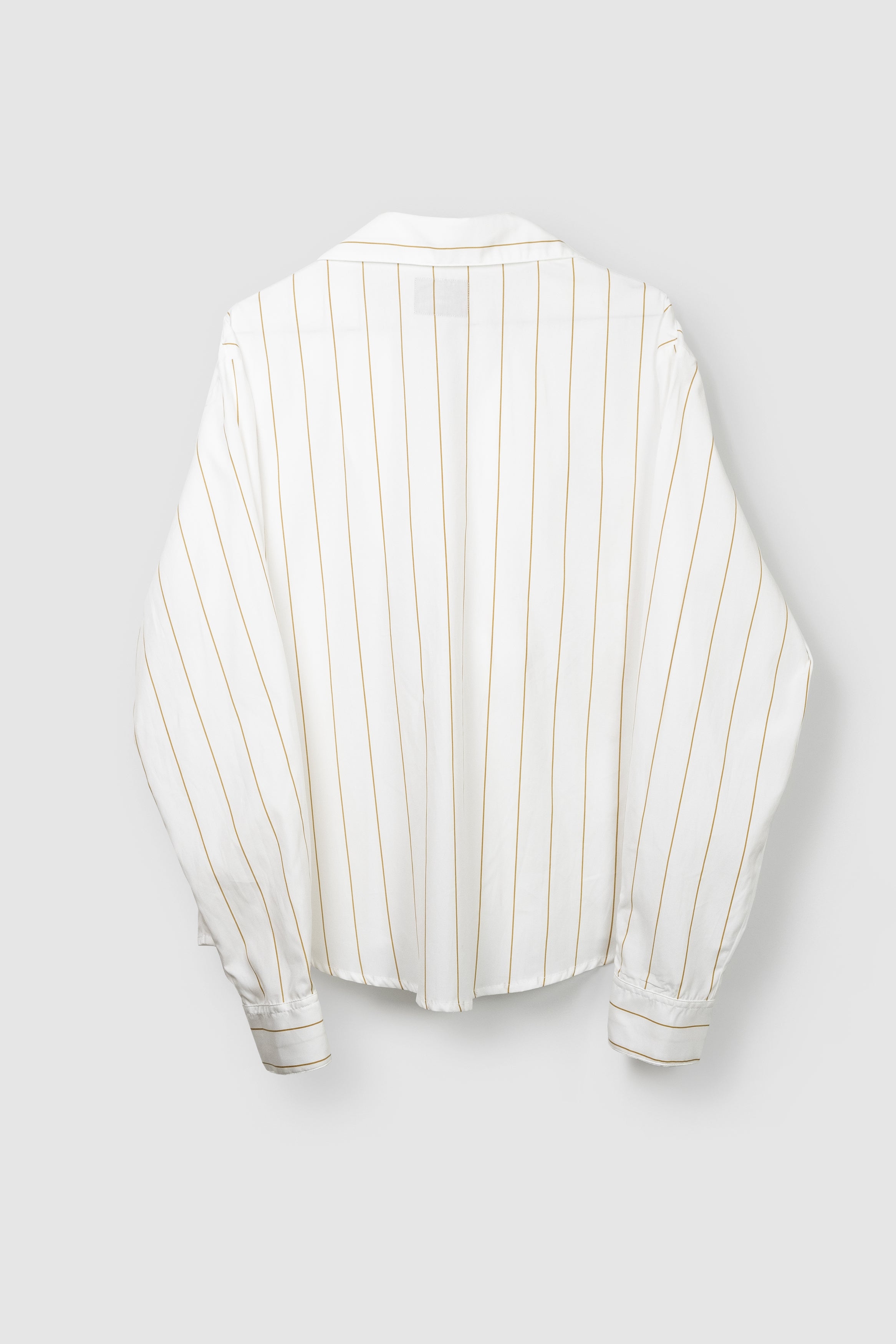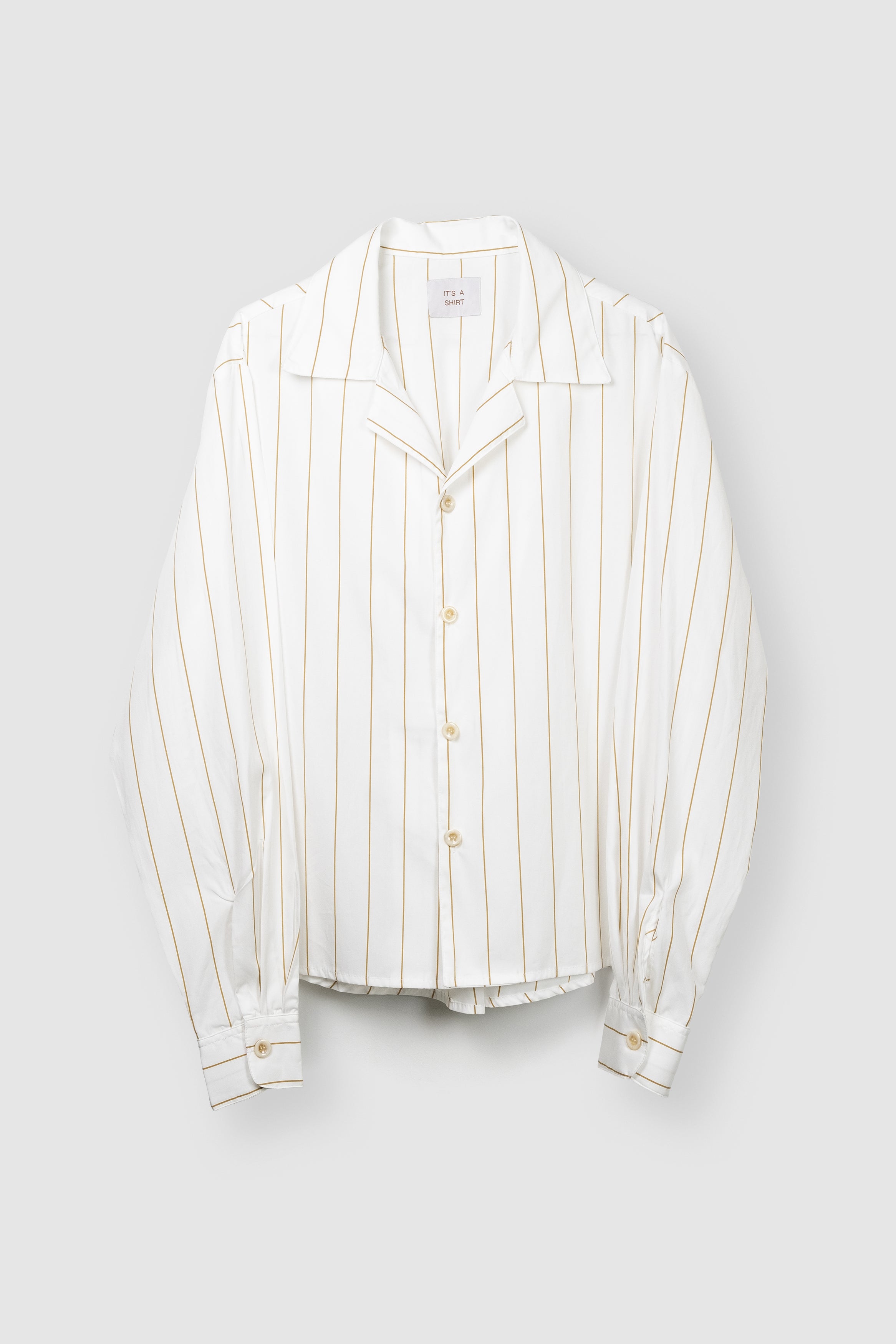 Its fabric is a striped white cotton crispy poplin which makes it a non seasonal shirt that can be used on a warm day or for layering. It is shaped in a boxy fit with notched collar, relaxed sleeves and a semi-length with a curvy silhouette on the profile. It is finished with honey beige-middle-sized bone buttons.