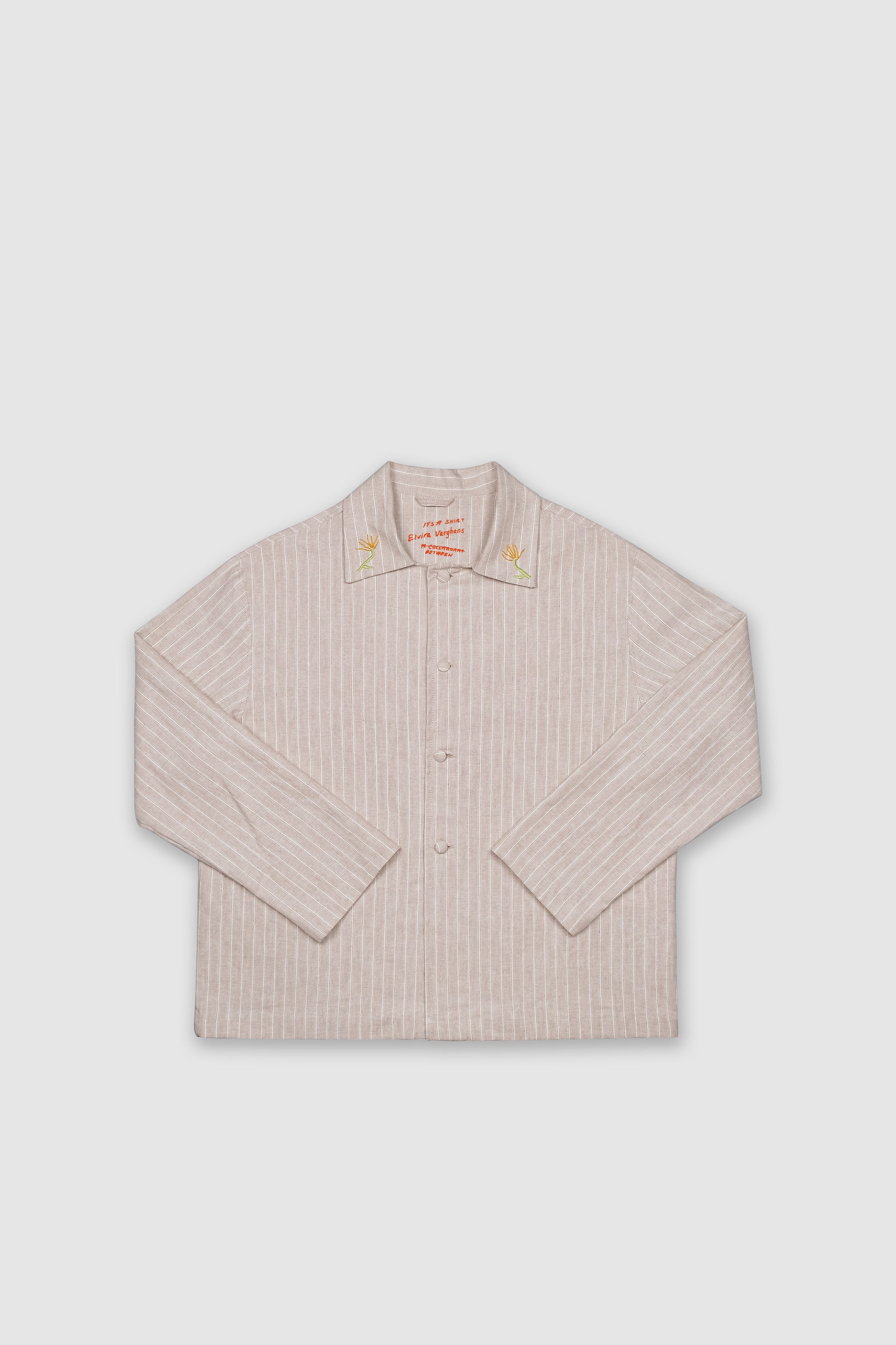 Last November we started a dialogue with Swedish artist Elvira Varghans questing whether is possible to create a workwear shirt with a twist. We exchanged ideas, fabrics and materials via regular post office. The outcome is the production of 24 unique shirts with a distinctive yet a discreet detail. Elvira embroidered each collar by hand in her studio in Malmö. Later, we received them back in Athens and we shaped one-off garments made from greek heavy-weight cotton. Every shirt is unique and has its own embroidery. The inner back is screen printed on the top with our collaboration's signature, handwritten by the artist.
