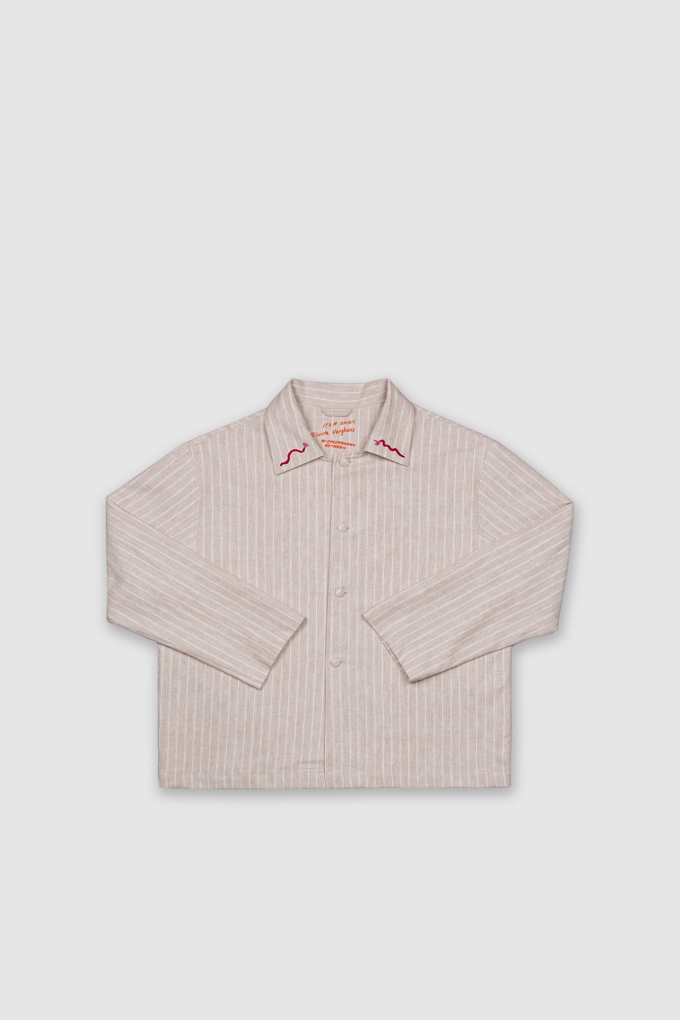 Last November we started a dialogue with Swedish artist Elvira Varghans questing whether is possible to create a workwear shirt with a twist. We exchanged ideas, fabrics and materials via regular post office. The outcome is the production of 24 unique shirts with a distinctive yet a discreet detail. Elvira embroidered each collar by hand in her studio in Malmö. Later, we received them back in Athens and we shaped one-off garments made from greek heavy-weight cotton. Every shirt is unique and has its own embroidery. The inner back is screen printed on the top with our collaboration's signature, handwritten by the artist.