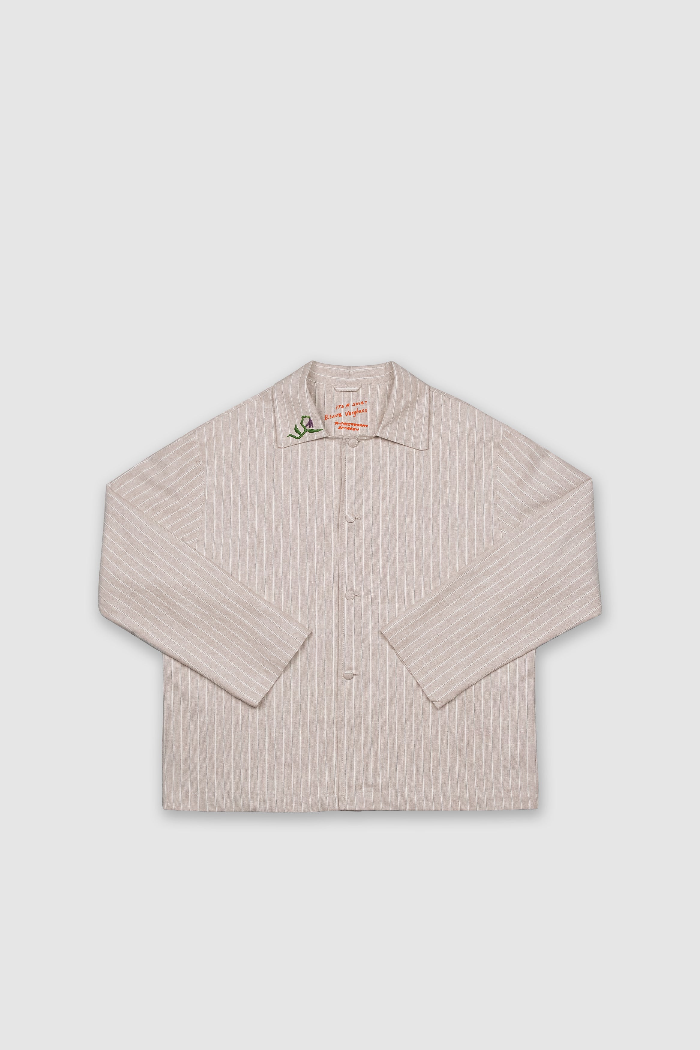 Last November we started a dialogue with Swedish artist Elvira Varghans questing whether is possible to create a workwear shirt with a twist. We exchanged ideas, fabrics and materials via regular post office. The outcome is the production of 24 unique shirts with a distinctive yet a discreet detail. Elvira embroidered each collar by hand in her studio in Malmö. Later, we received them back in Athens and we shaped one-off garments made from greek heavy-weight cotton. Every shirt is unique and has its own embroidery. The inner back is screen printed on the top with our collaboration's signature, handwritten by the artist.