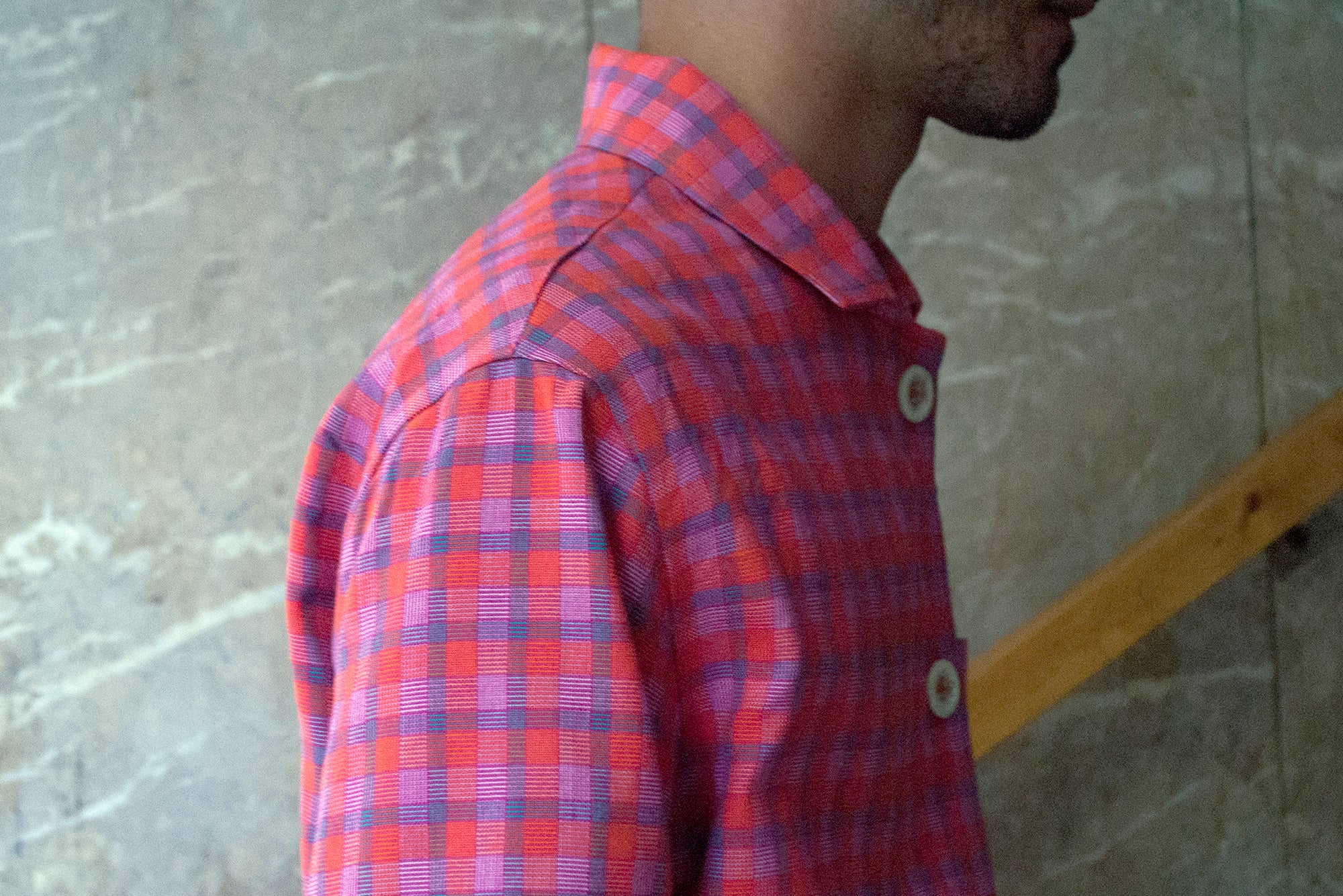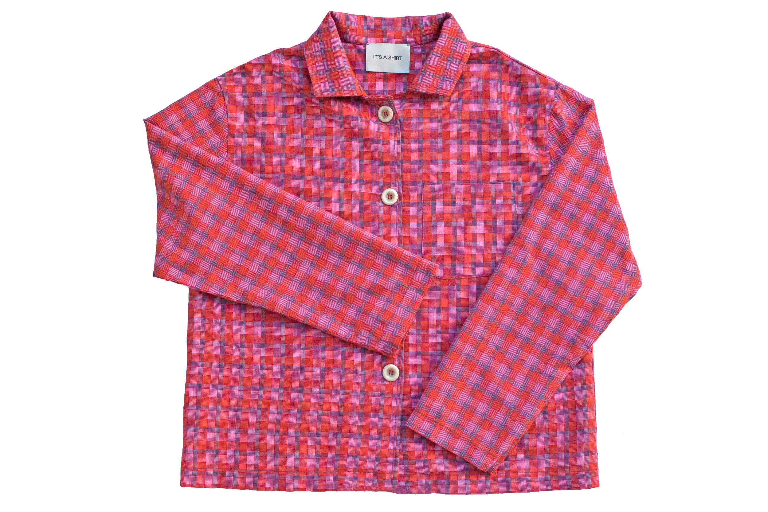 11.11 is a unisex, one size shirt. It has a squared-edges collar and is finished with bone large sized buttons, made from check cotton in pinky shades produced in Greece.
