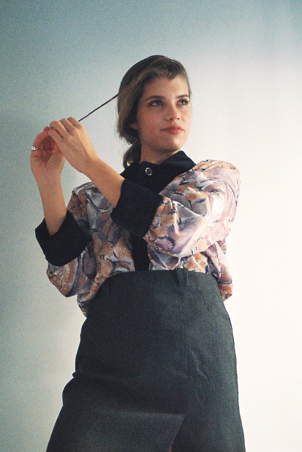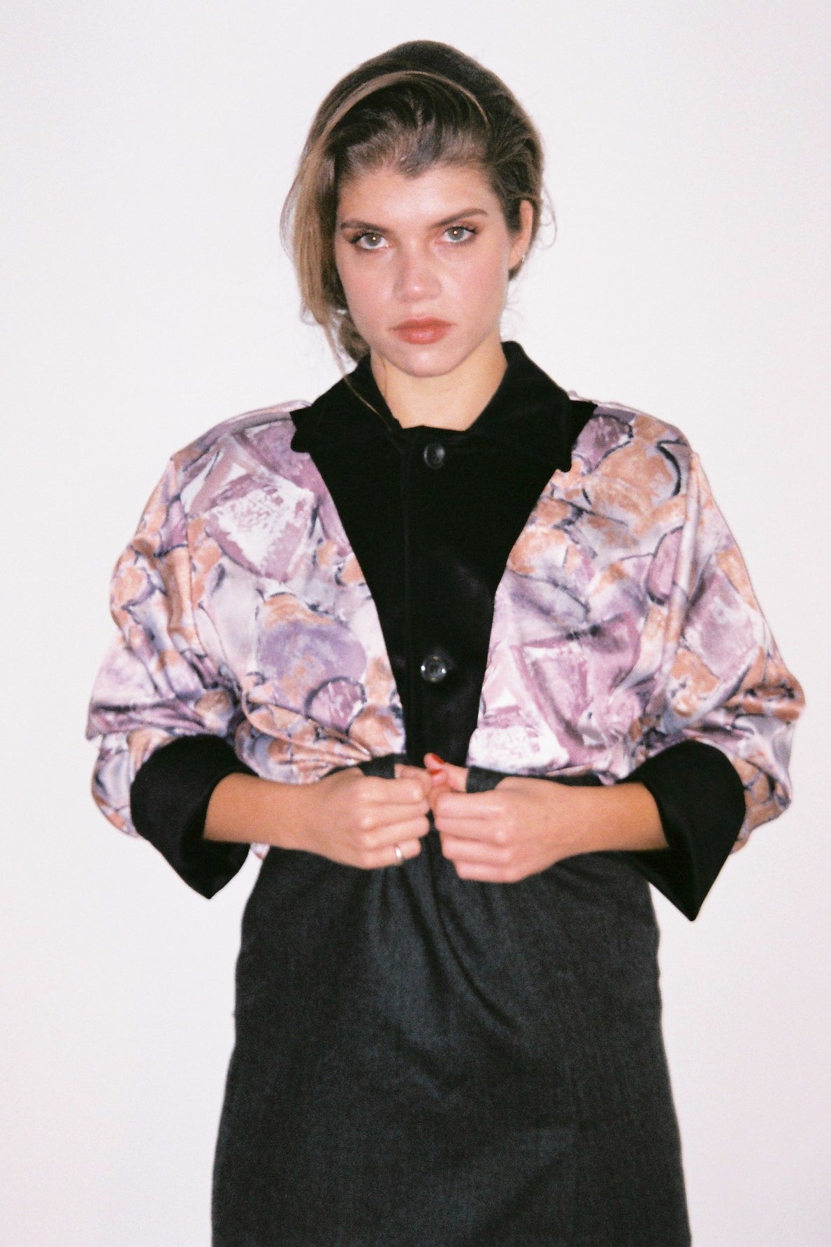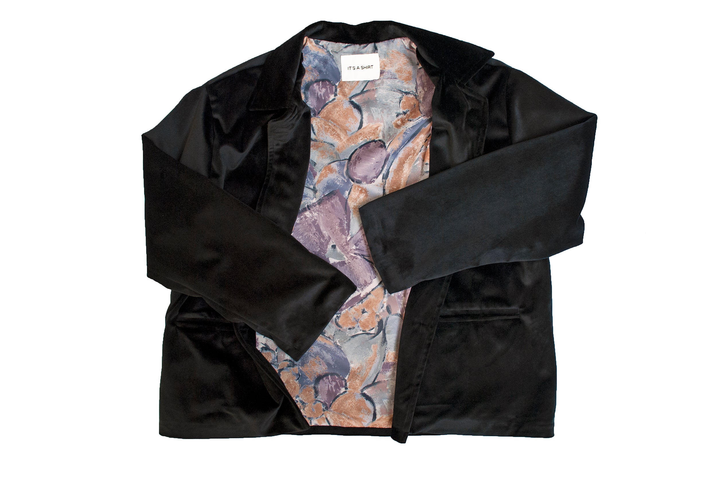 Cloudy day is velvet blazer shirt in raven colour. The inner part of it is a special shinny viscose lining with an abstract grey colourway print. The outer part is made from raven velvet finished with bone buttons and two pockets on the front. Rare and limited, only two garments per style.