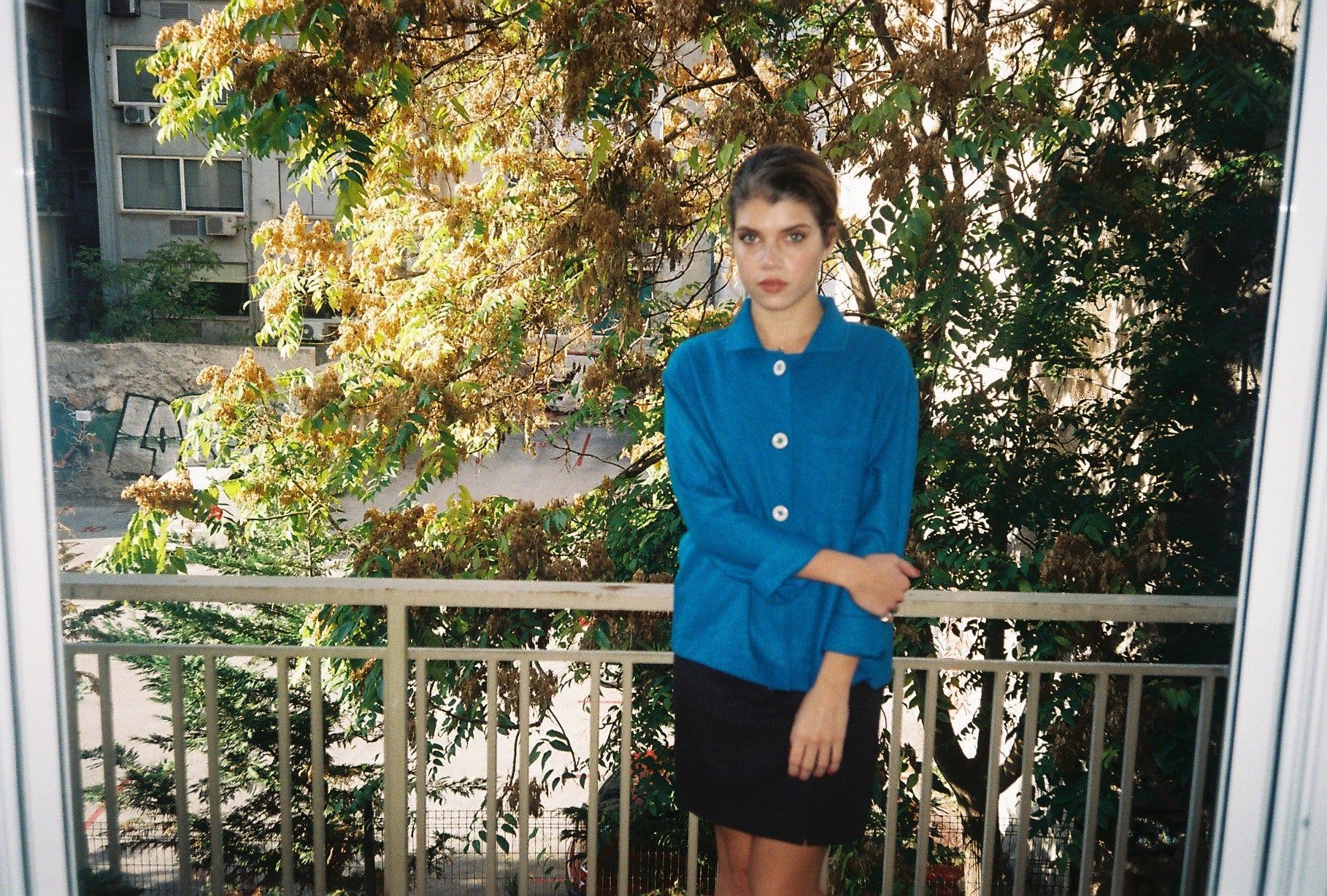 Saturday is a unisex, one size shirt, it has a squared-edges collar, is finished with bone large sized buttons and dark petrol seams. Just to mention it is made from fluffy petrol blue wool from Greece.