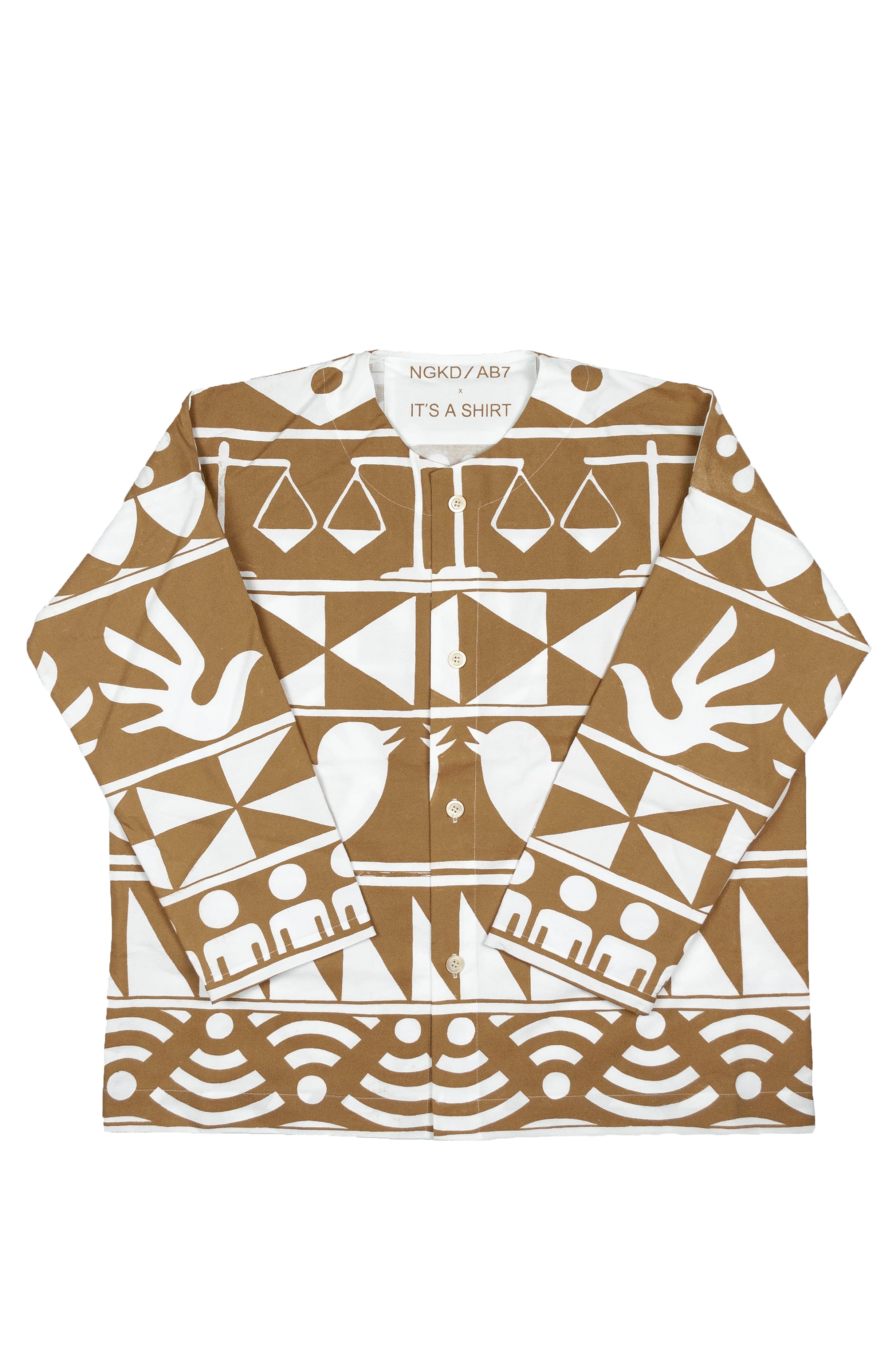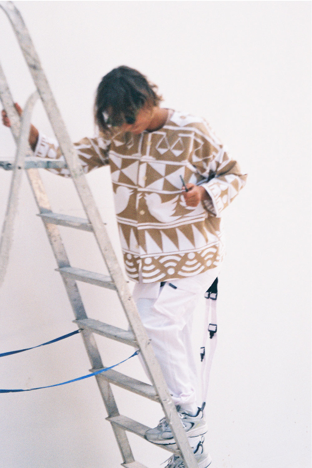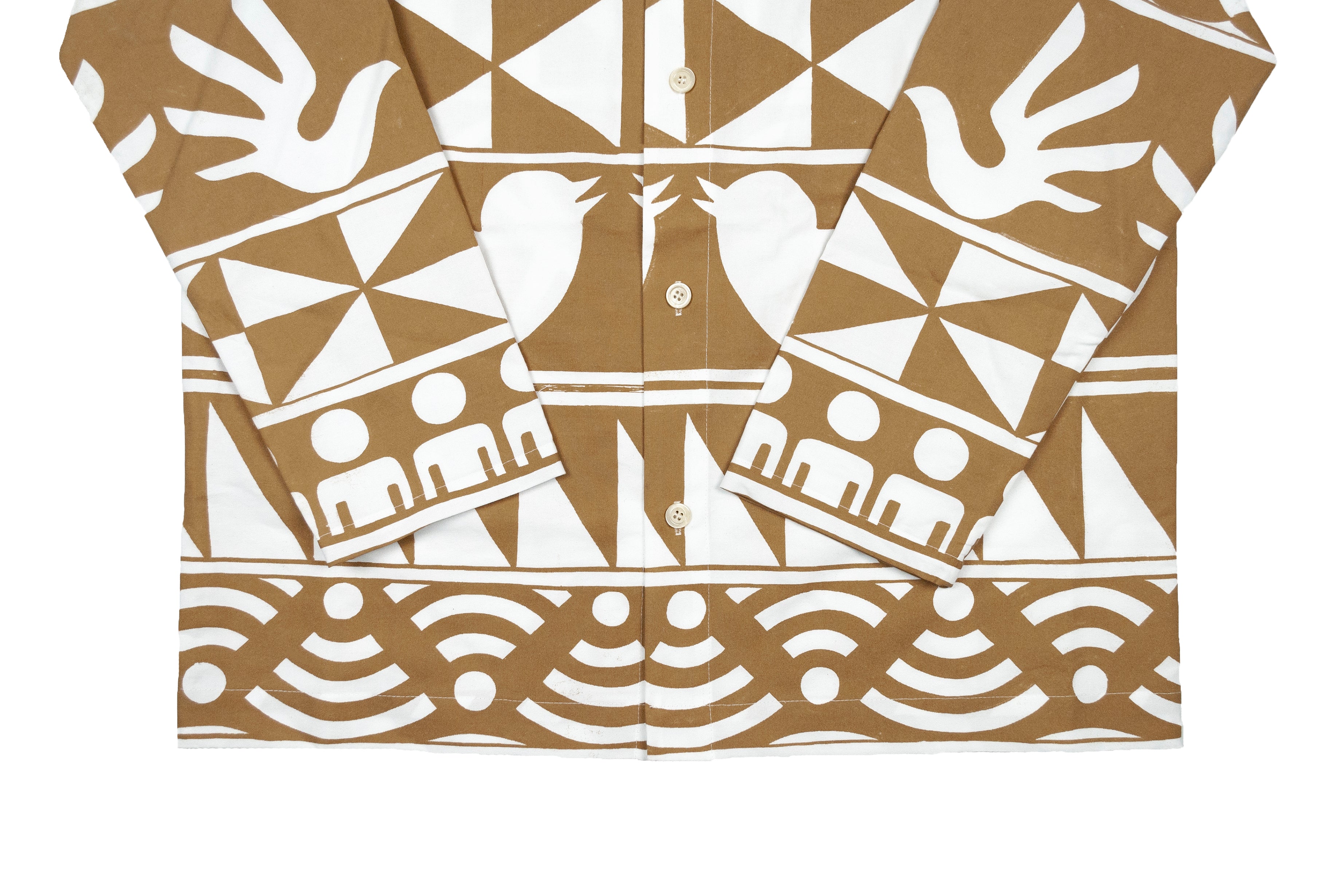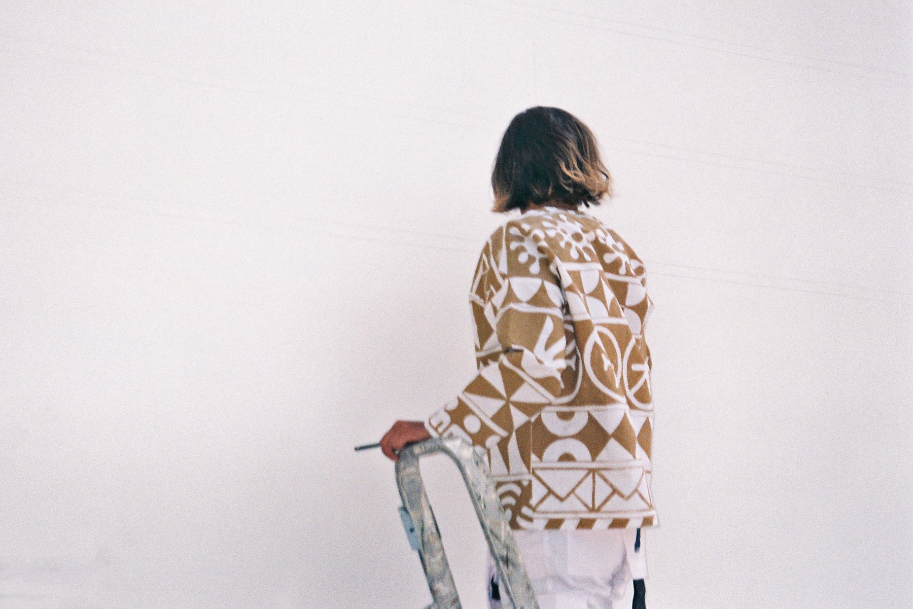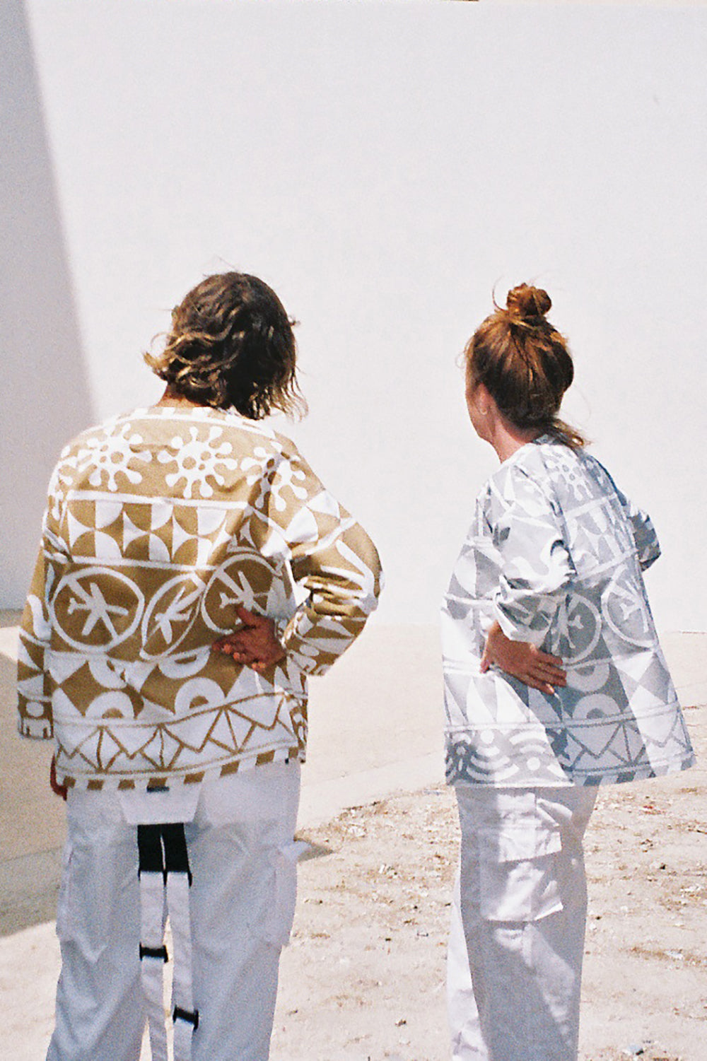 Khan-Dossos and her team will be wearing specially designed shirts creating a direct link between the mural and the act of labour creating it. This painting performance begins on the 6th of September and will be visible in the Santaroza Square of central Athens until the opening weekend of the Bienniale on the 24th of September. The garment has been designed exclusively for us by the artist, is an integral part of the wider project of ‘Ta Nea Xysta’ and is a limited edition wearable artwork. Available in the alchemically symbolic tones of moon silver and sun gold - the colours of the shirts relate directly to the theme of this year's Athens Biennial ‘Eclipse’. The designs have been locally hand screen-printed from the painted designs created by Khan-Dossos for these performance costumes.