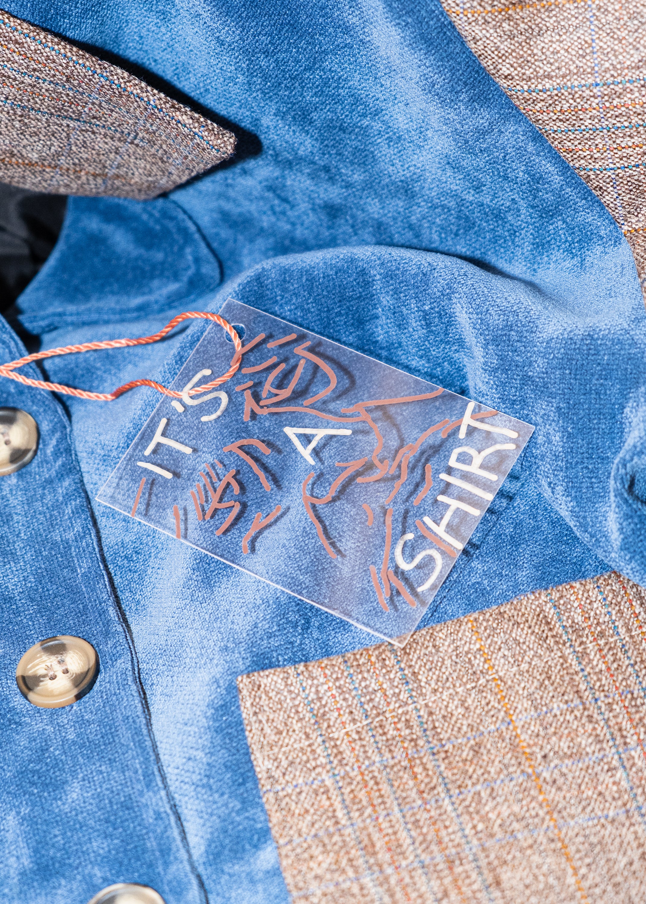 Yale blue is a short jacket made from our coats' fabric scraps. Its body is fabricated from a furniture french velour whereas the sleeves, the pockets and the collar are made from Scottish striped wool. This garment is one-off and is lined inside with black viscose. Having this item means that you will also get your personalised transparent label drawn by Athens based artist Stephanie Orati.