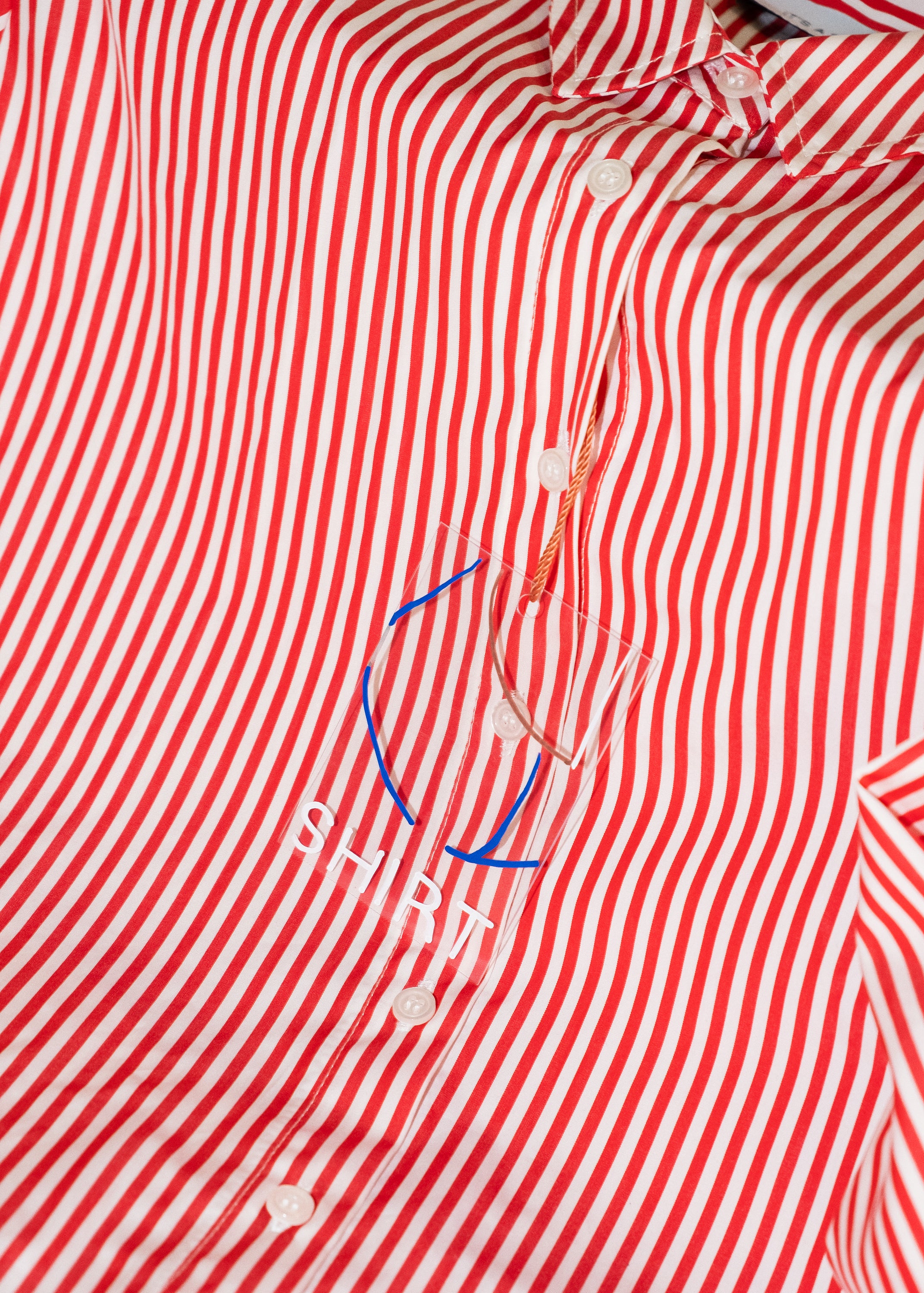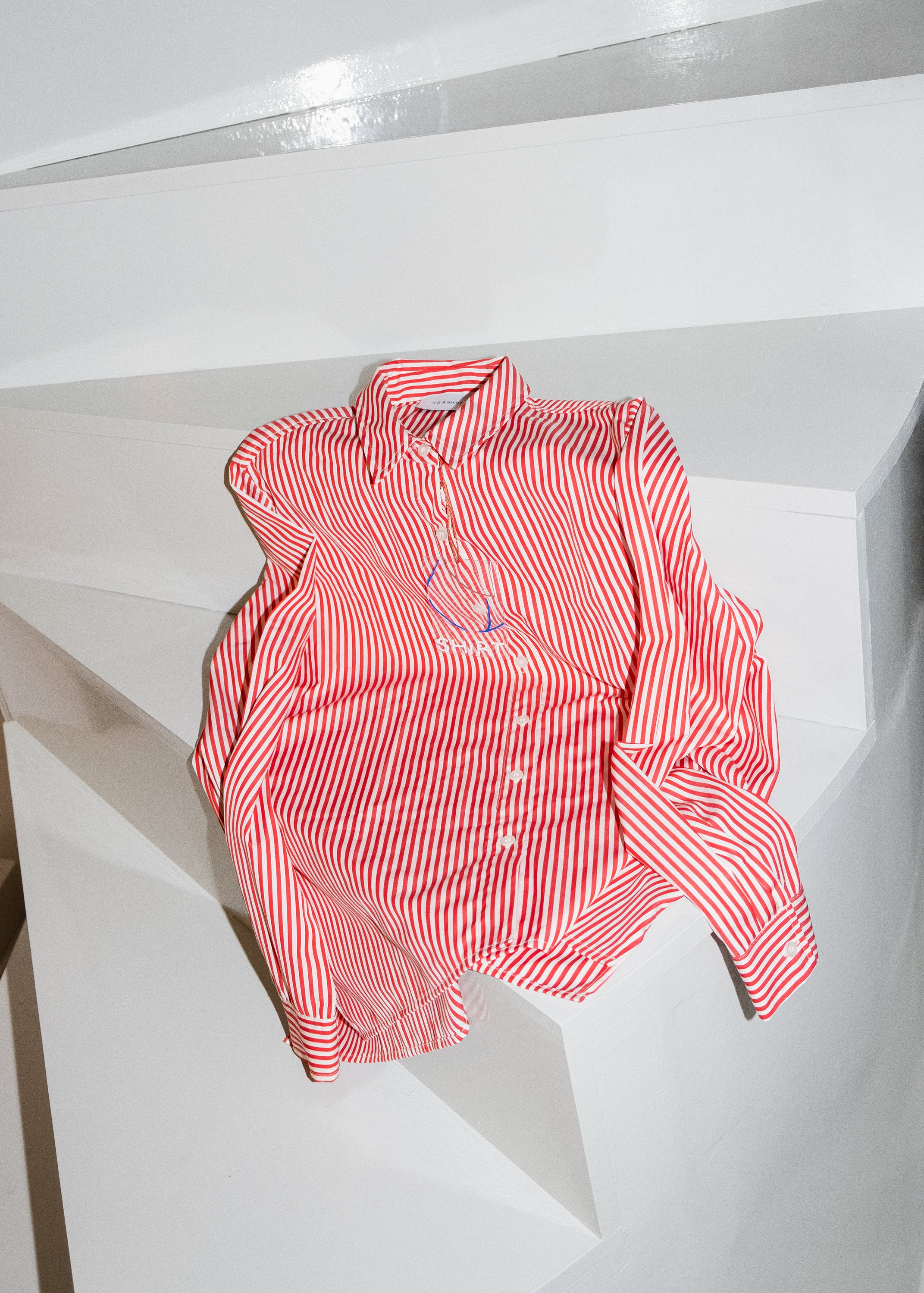 Spritz is a unisex shirt made from leftover striped Italian poplin in red and white colour. It has a slim classic collar, shirt cuffs with horizontal stripes and is finished with small-sized buttons. Having this item means that you will also receive your personalised transparent label drawn by Athens based artist Stephanie Orati.