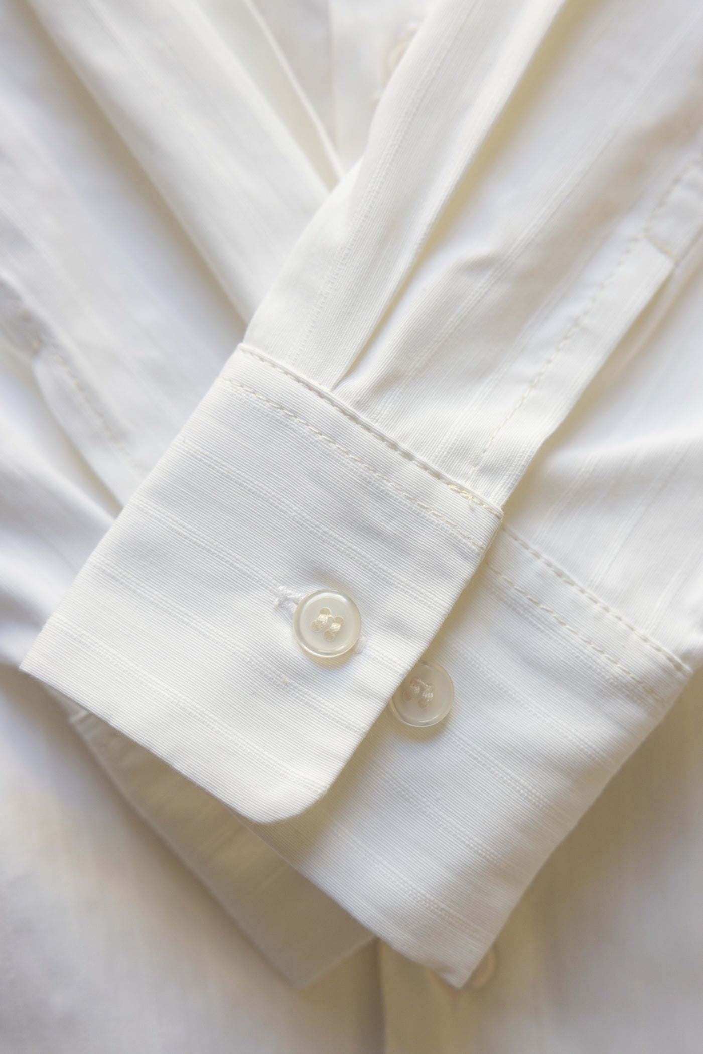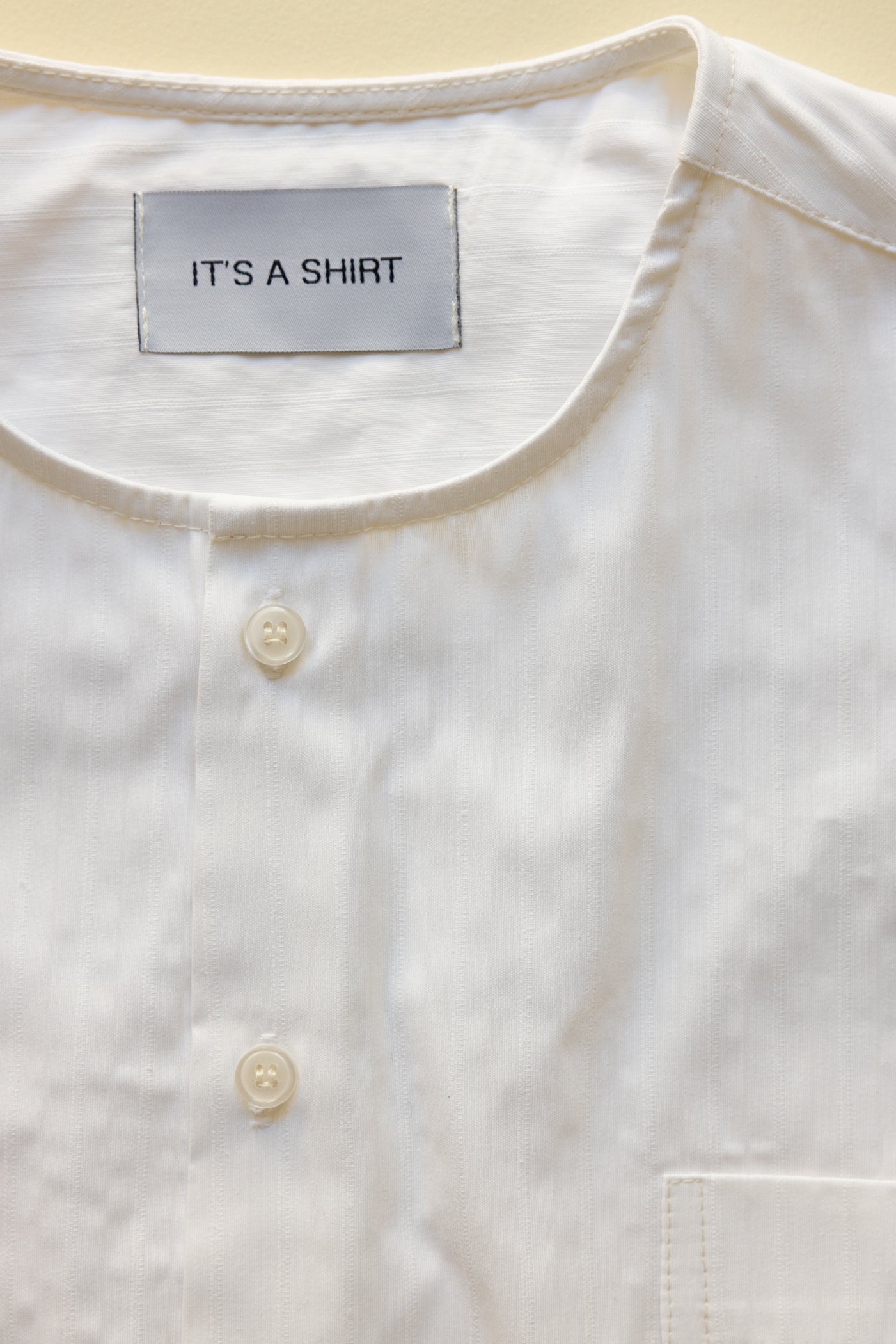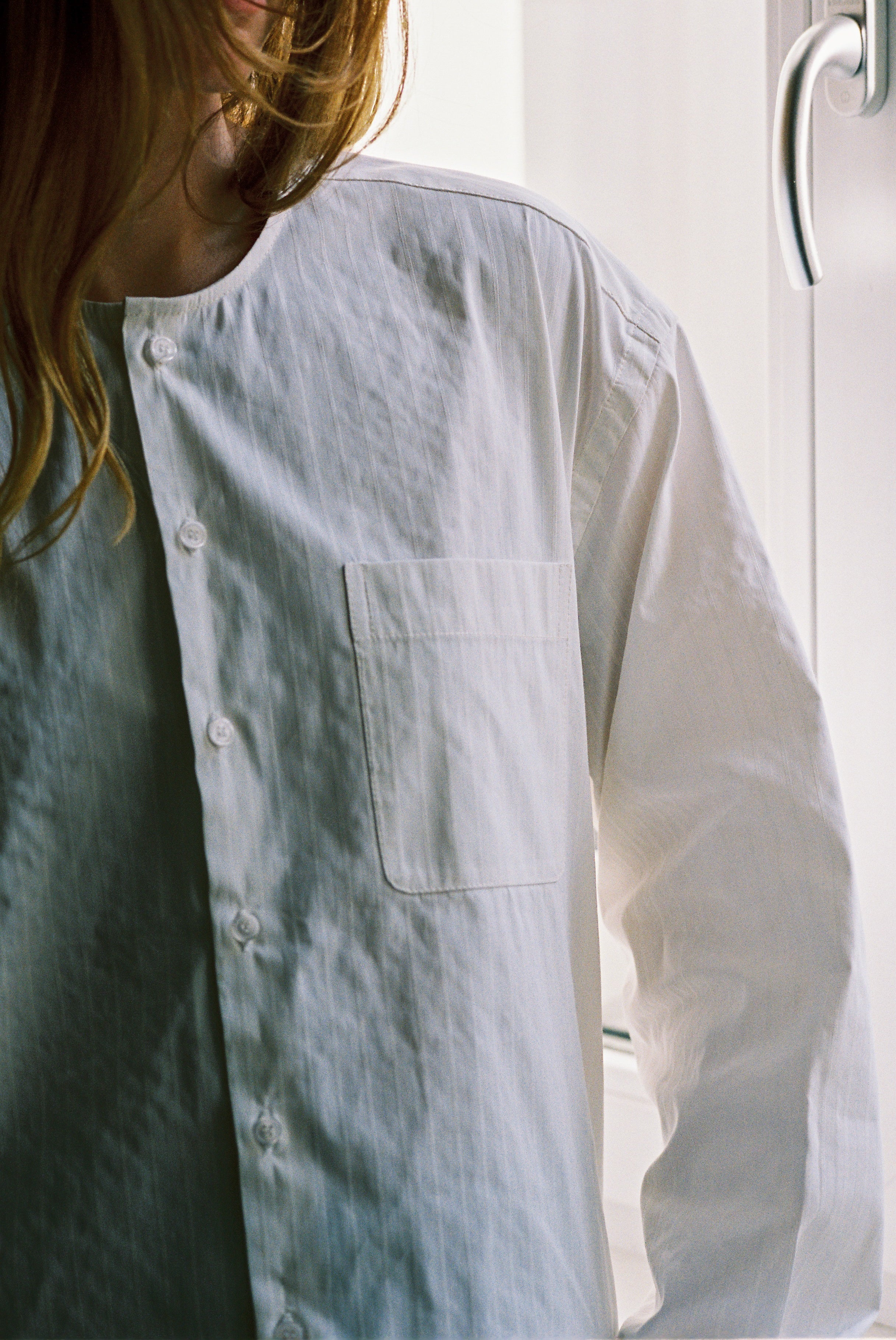 We firstly created this cut in 2022, and this is the elevated version of the initial design. It offers a relaxed fit, not too oversized, and features a rounded neckline in place of a collar, making it easy to be worn as an over-shirt as well. Crafted from a very crispy 'paper-feel' striped dead-stock cotton, BAKING POWDER is minimal and delicate on its own but it can be layered, too. The back features a pleated detail shaping a nice flow. There is a patched pocket on the left side and small openings on the sides. Perfect for spring or summer time, Baking Powder is elegant yet casual to accompany your outfit on a daily basis.