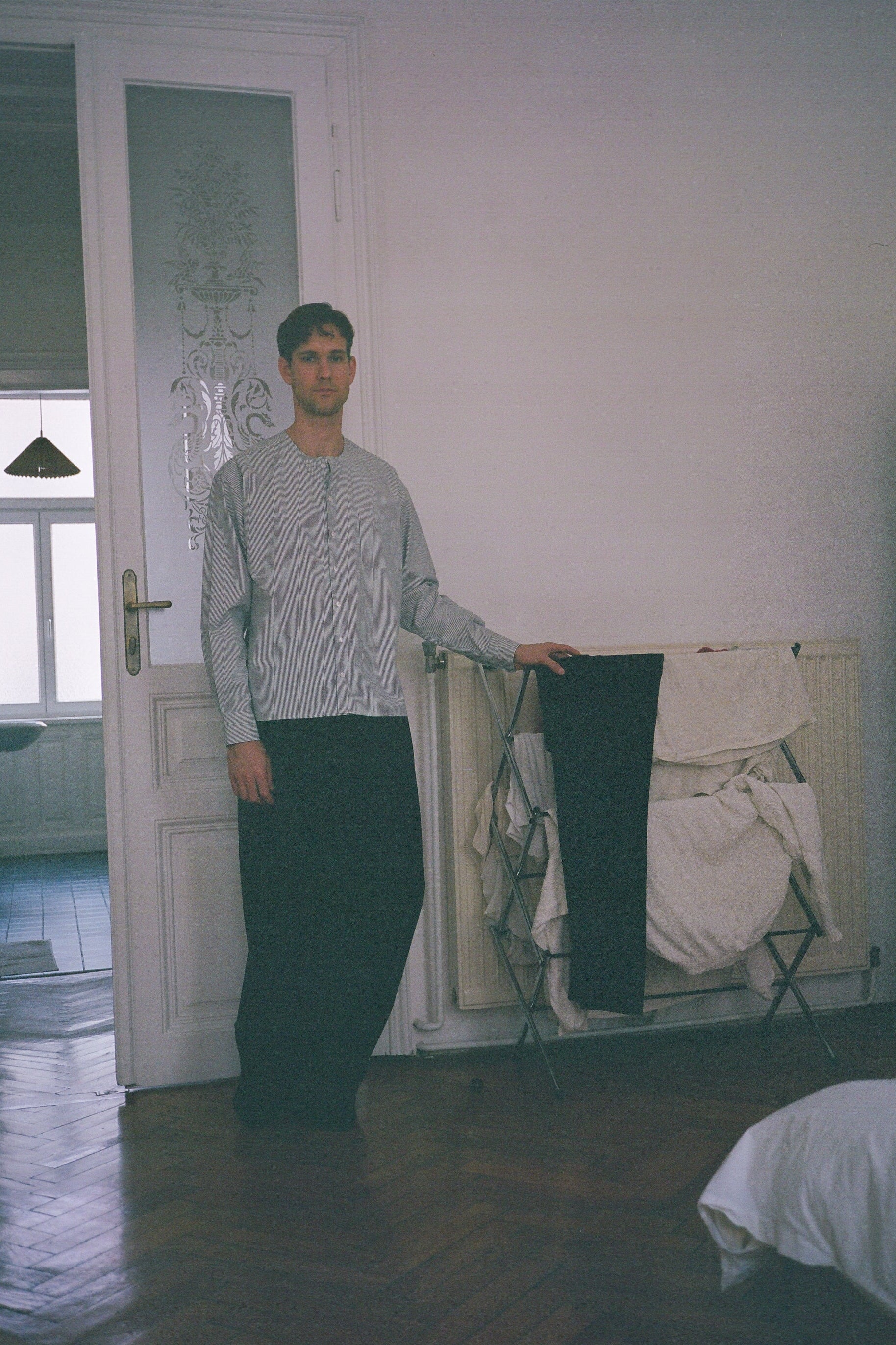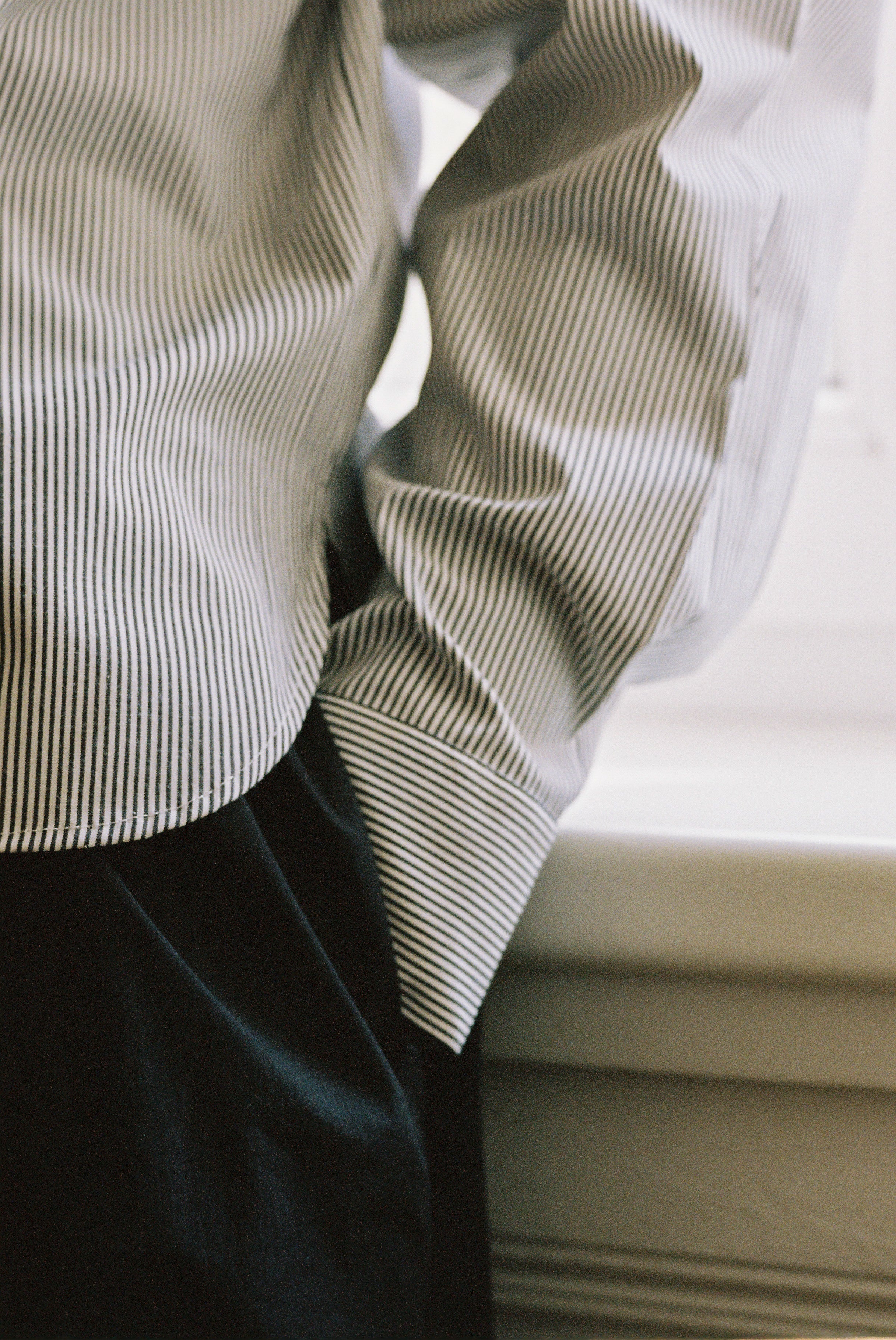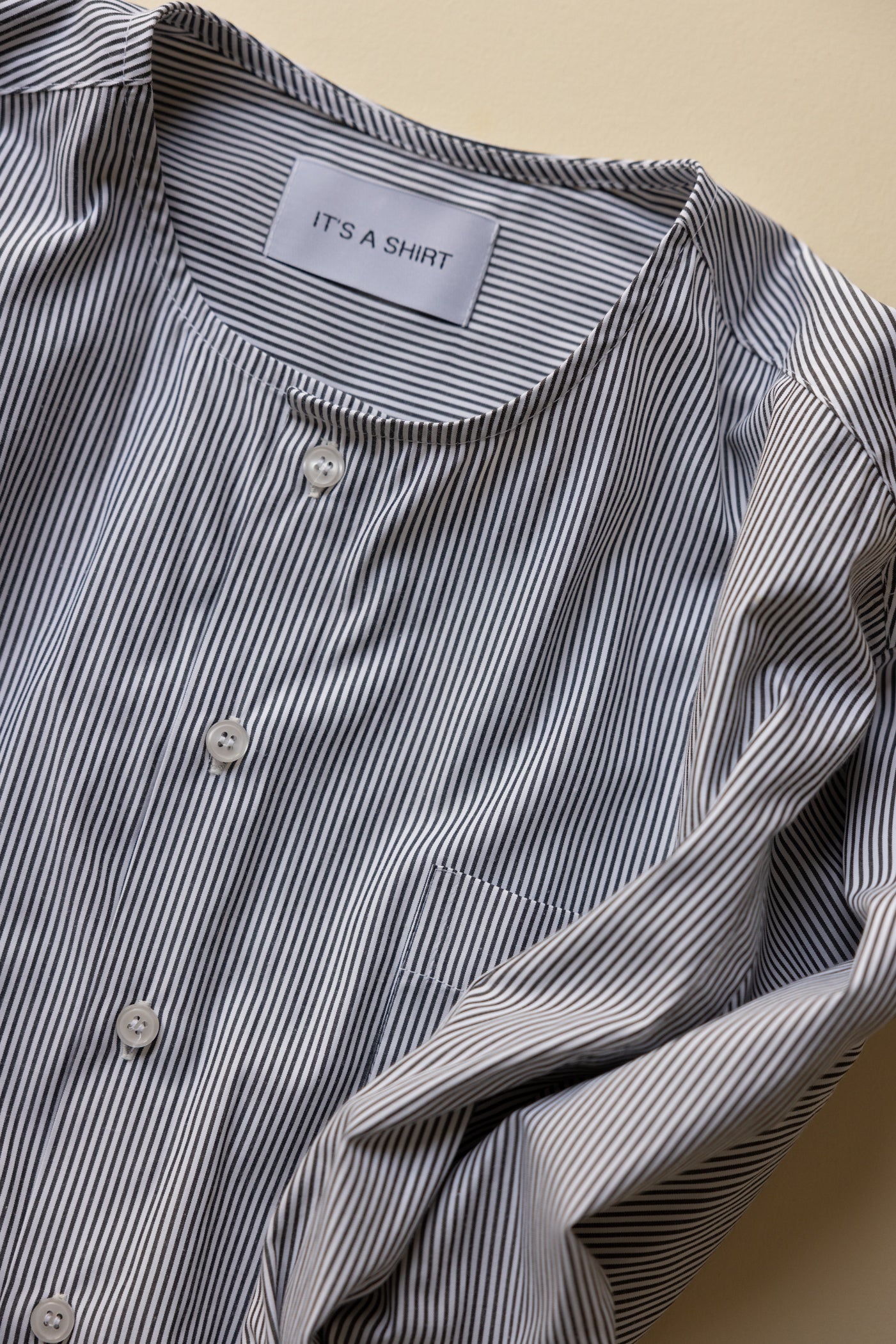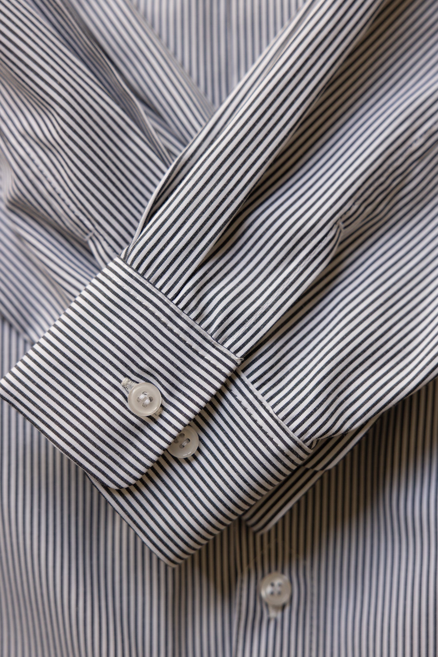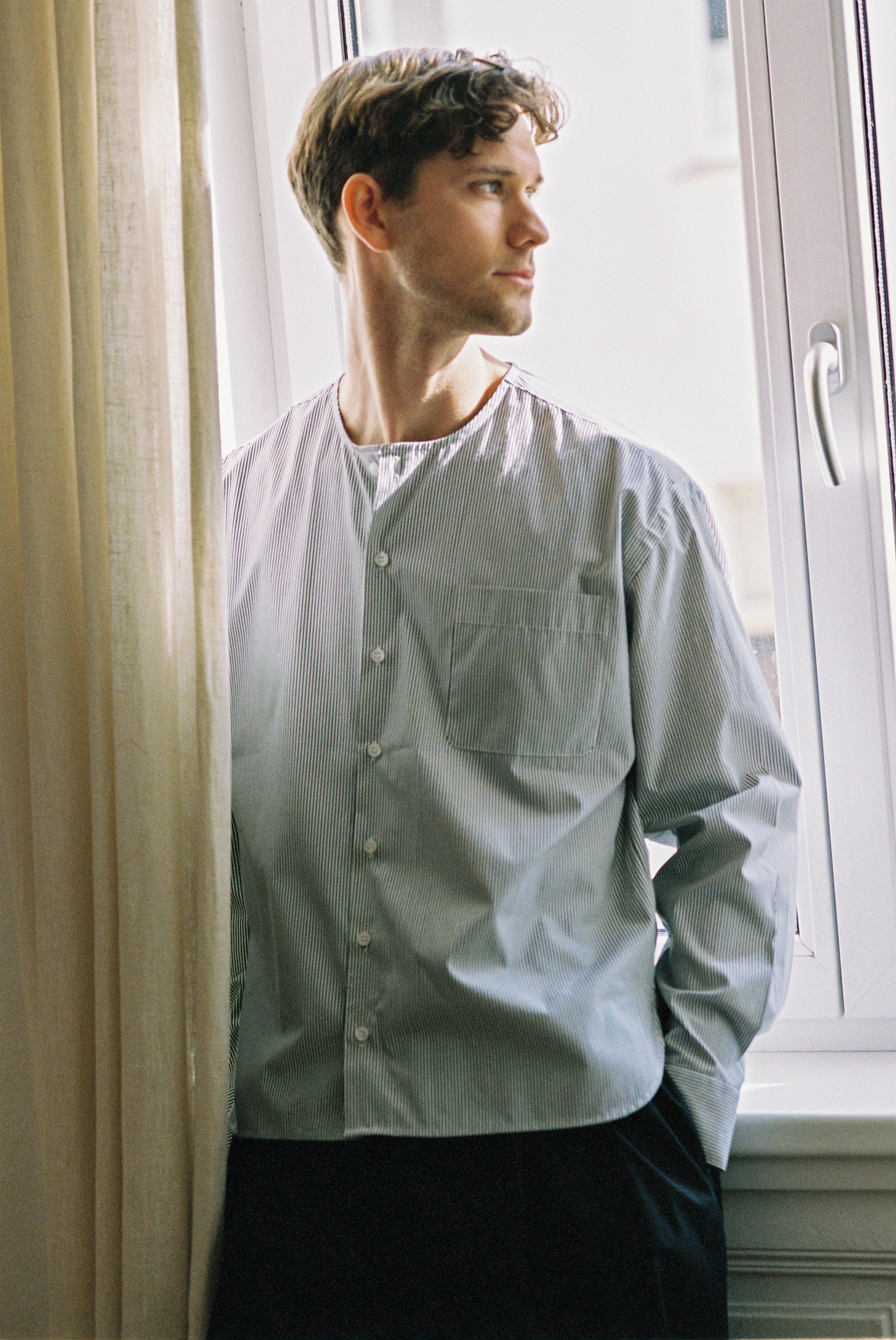 We firstly created this cut in 2022, and this is the elevated version of the initial design. It offers a relaxed fit, not too oversized, and features a rounded neckline in place of a collar, making it easy to be worn as an over-shirt as well. Crafted from a soft yet crispy striped thin poplin from north Italy, FAMILY is minimal and delicate on its own but it can be layered, too. The back features a pleated detail shaping a nice flow. There is a patched pocket on the left side and small openings on the sides. Perfect for spring or summer time, Family is also a shirt that can be worn during the whole year.