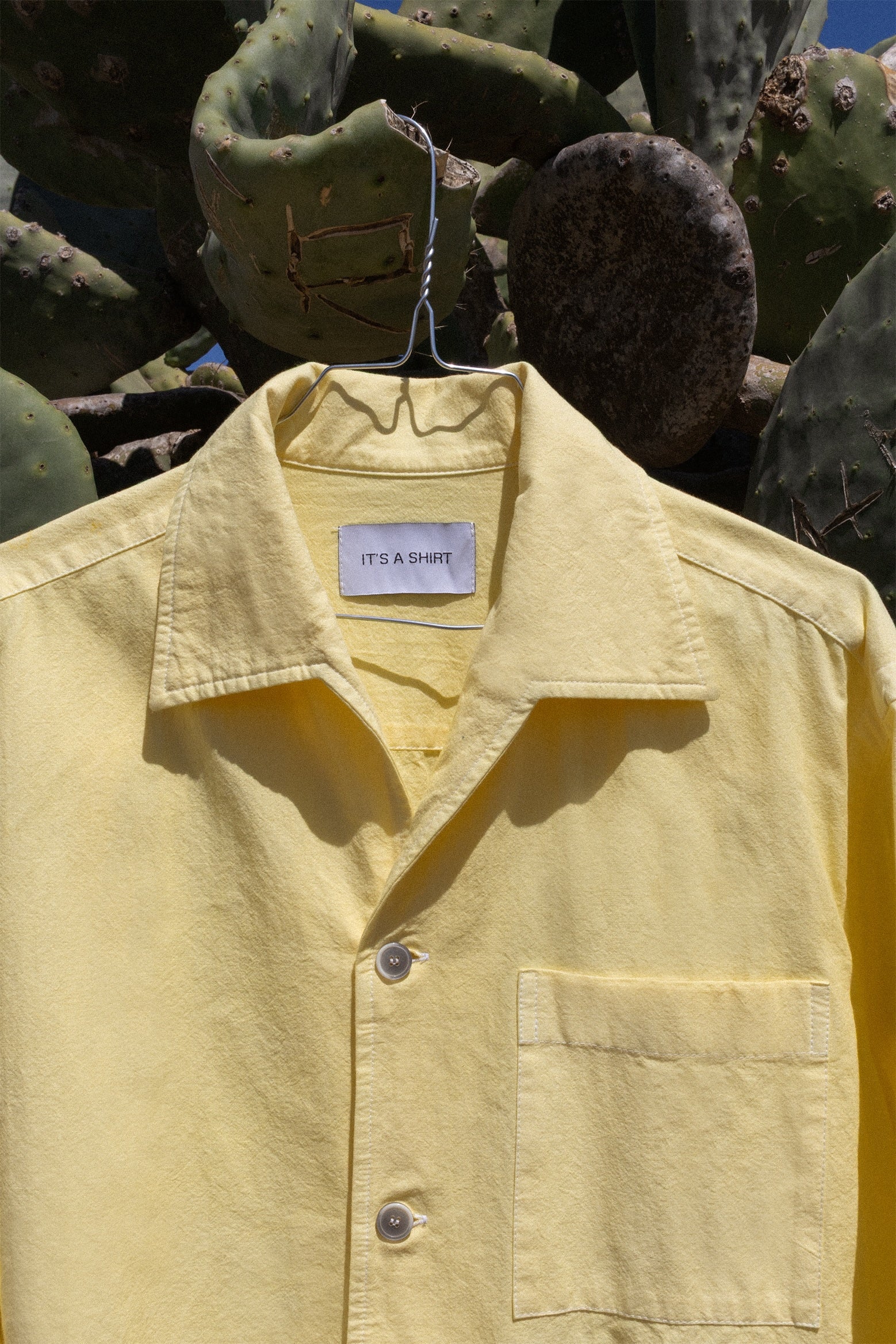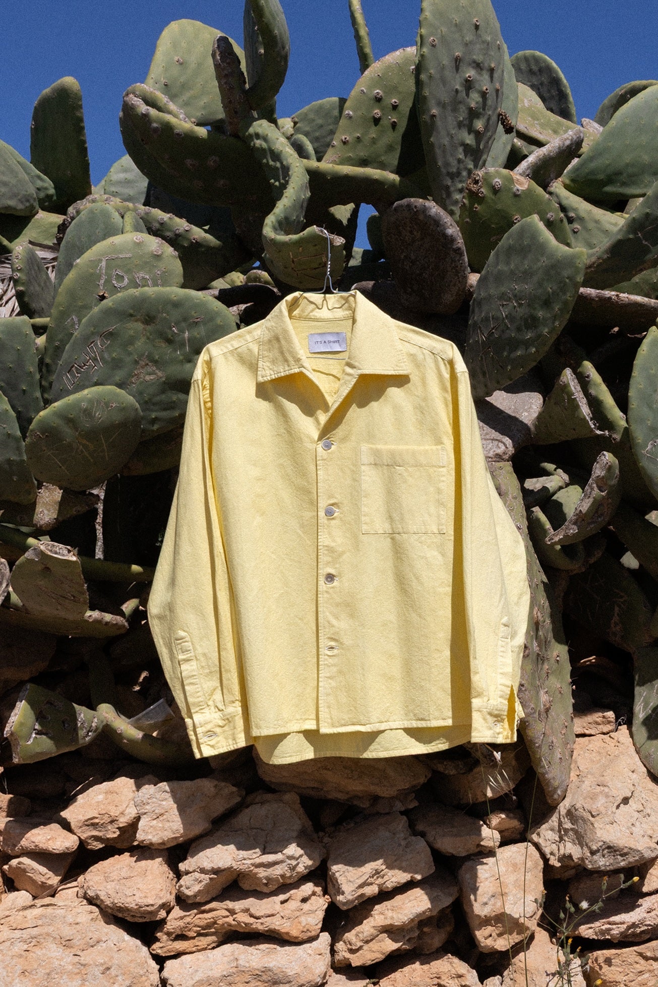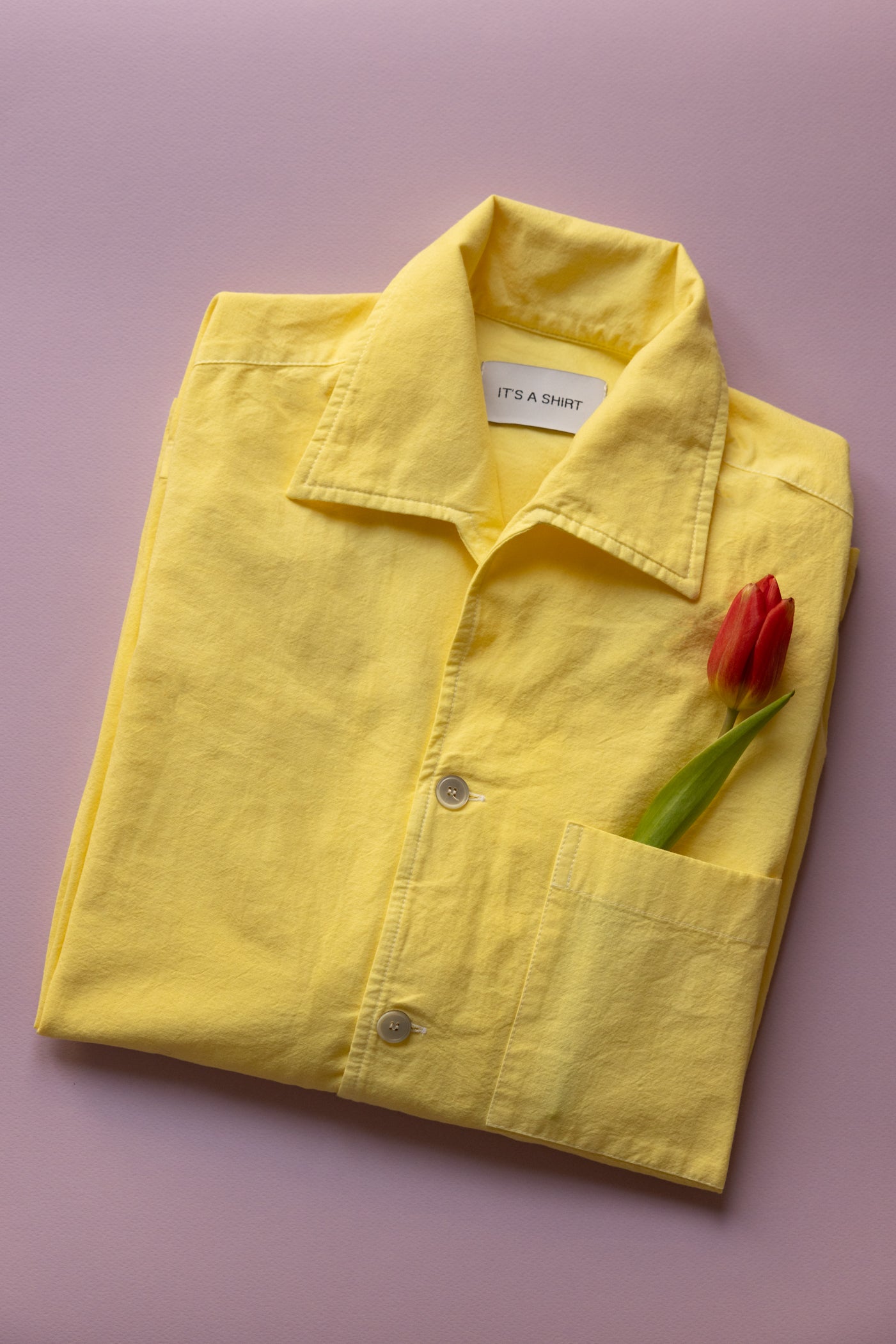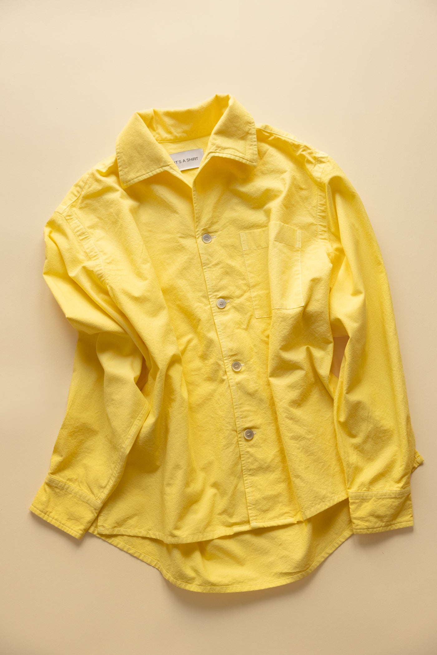 SUNNY is our unisex over shirt with a spread collar that seamlessly continues from the body, rather than being a separate piece. Crafted from heavyweight soft Greek cotton we dyed in vibrant yellow, the garment is finished with medium sized iridescent pearl buttons and contrast white stitching. The fabric has a soft texture that feels familiar and comfortable on the skin. SUNNY features a patch pocket and two generous square cuffs. The shirt is ideal for the spring and summer days but can also be worn all year-round!
