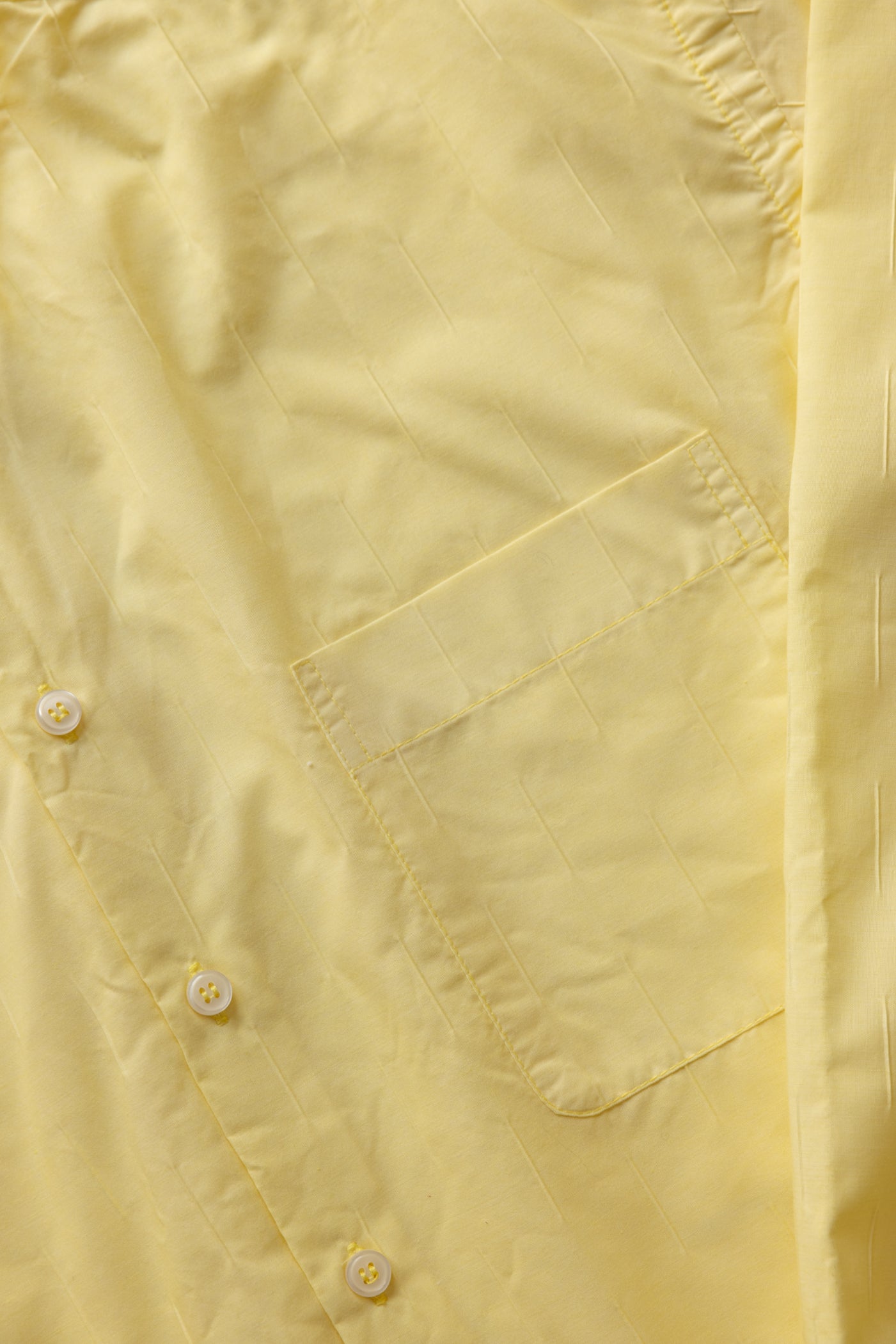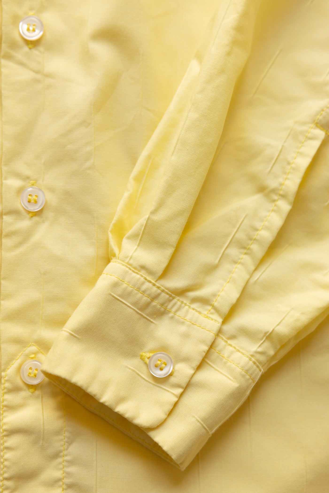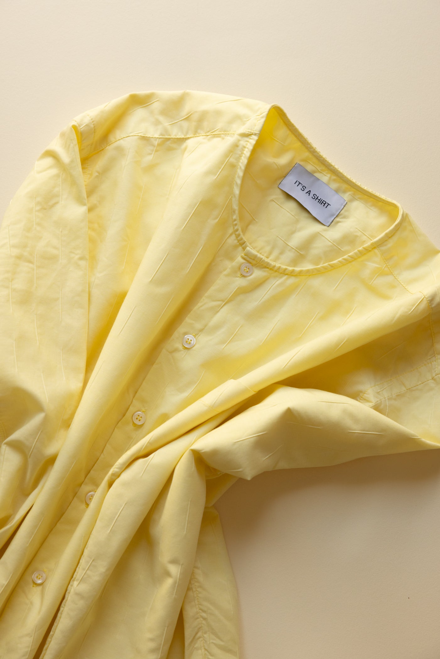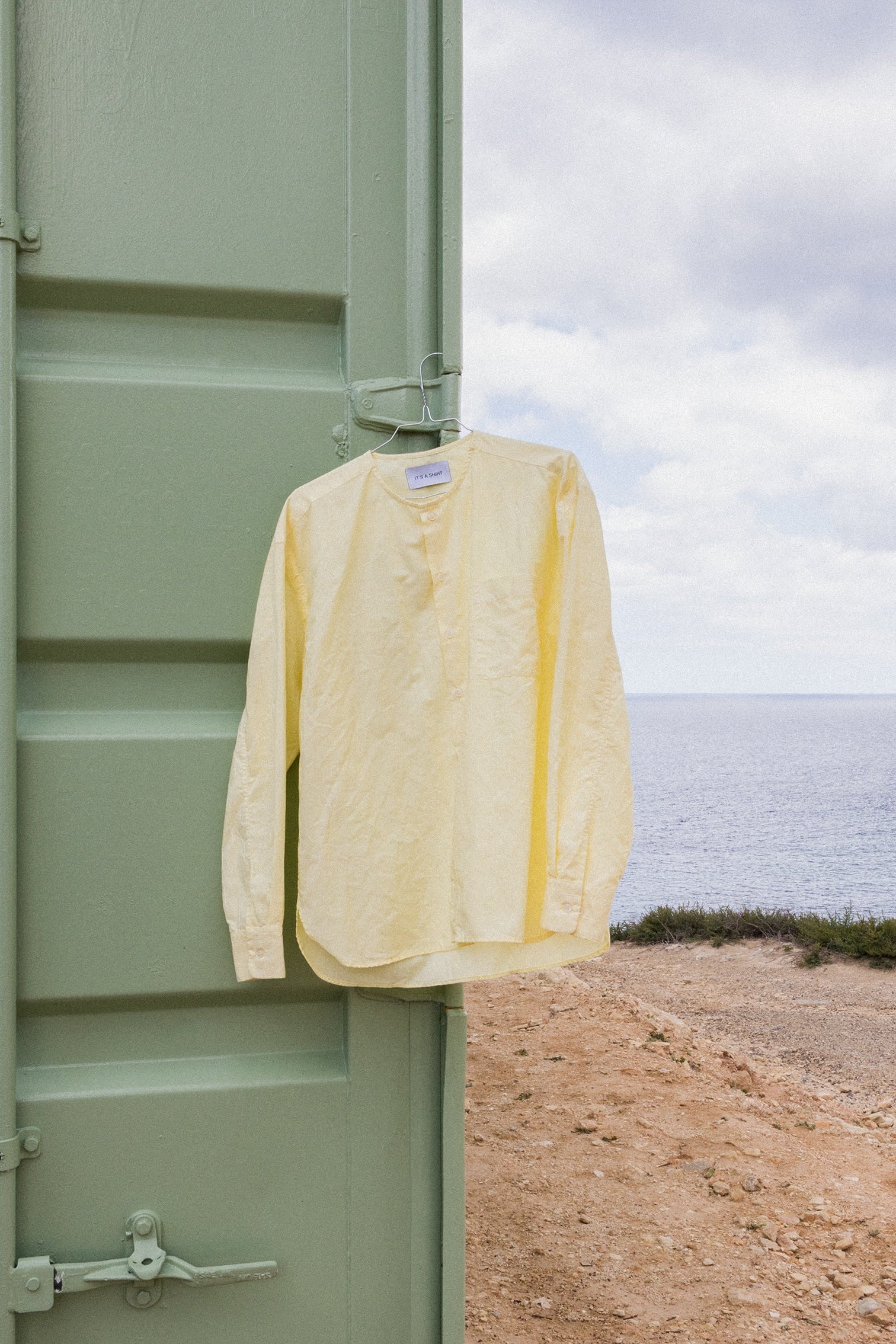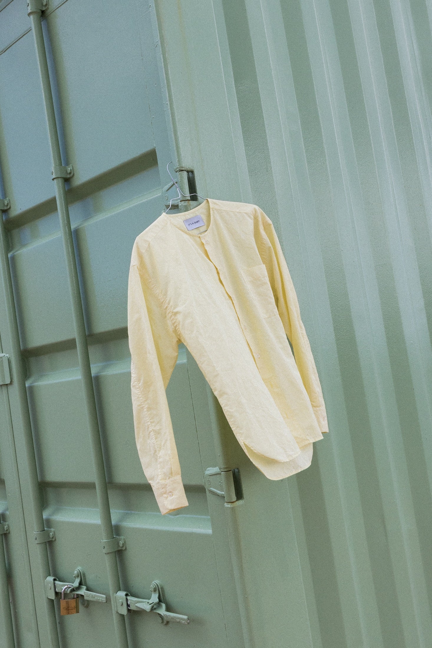 We firstly created this cut in 2022, and this is the elevated version of the initial design. It offers a relaxed fit, not oversized, and features a rounded neckline in place of a collar, making it easy to be worn as an over-shirt as well. Crafted from a soft and pleated Italian cotton we dyed in pastel yellow, SUNNY is minimal and delicate ideal for spring/summer outfits. The back features a pleated detail shaping a nice flow. There is a patched pocket on the left side and small openings on the sides. Sunny is elegant yet casual to accompany you on a daily basis. Dead-stock fabric, one-off.
