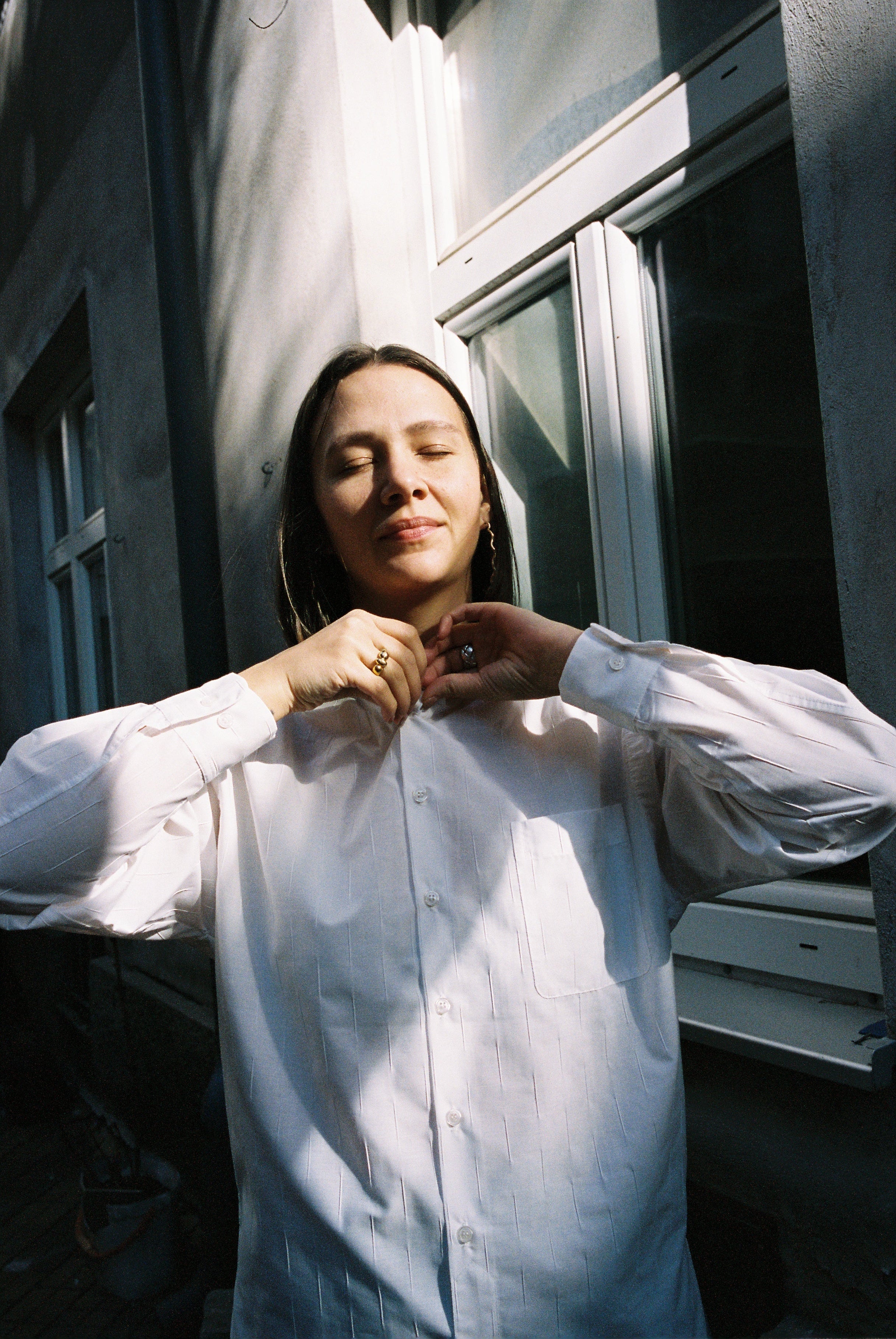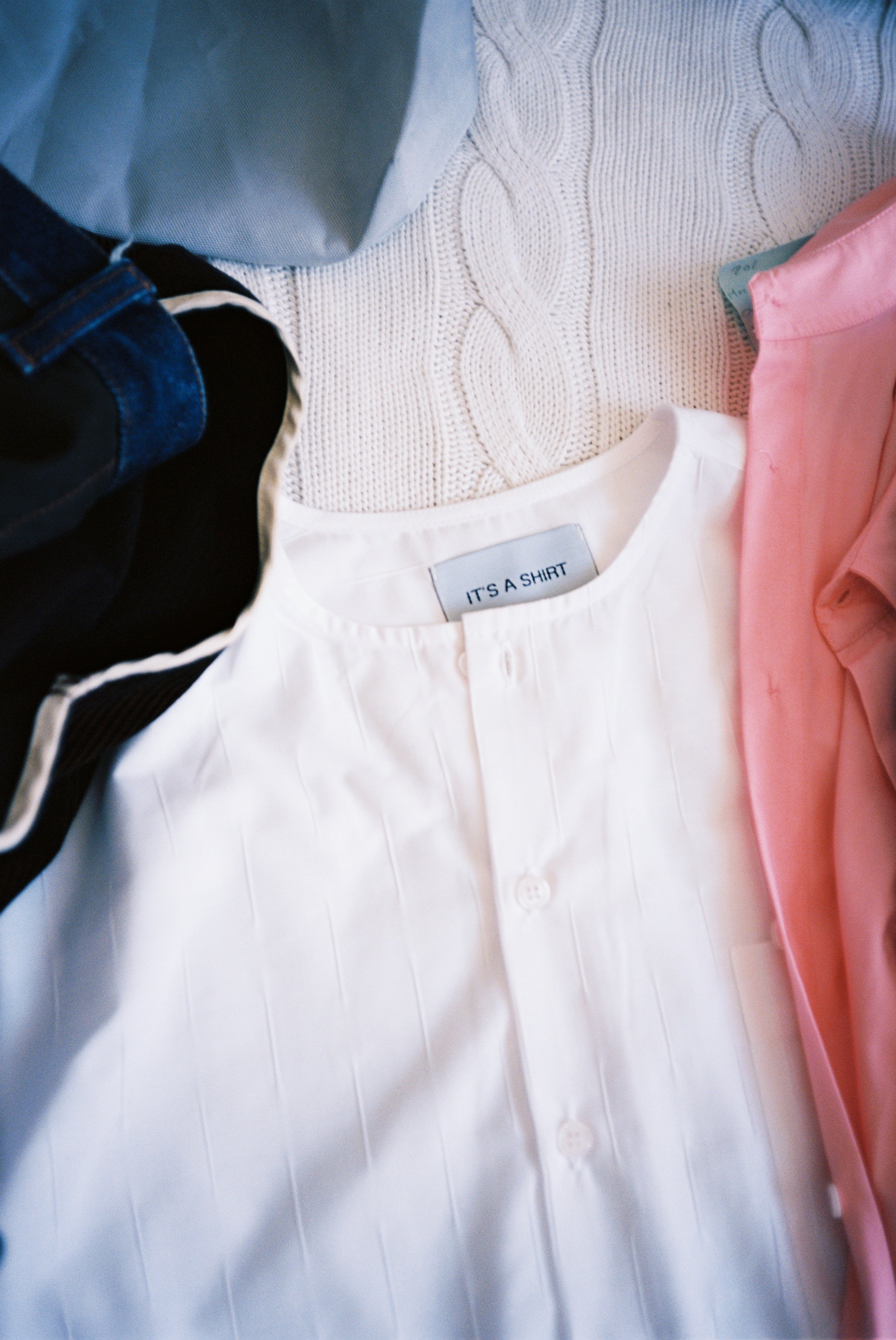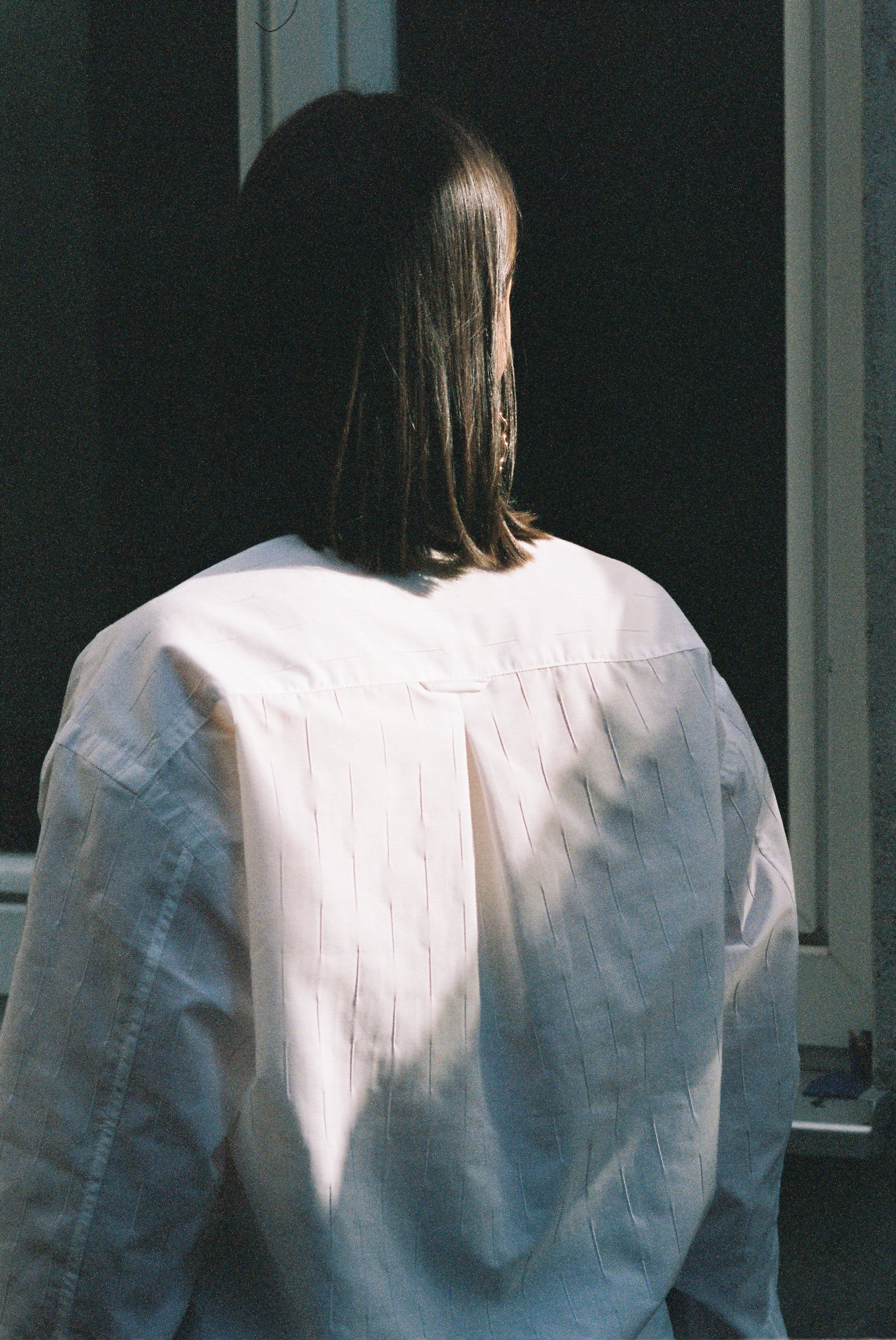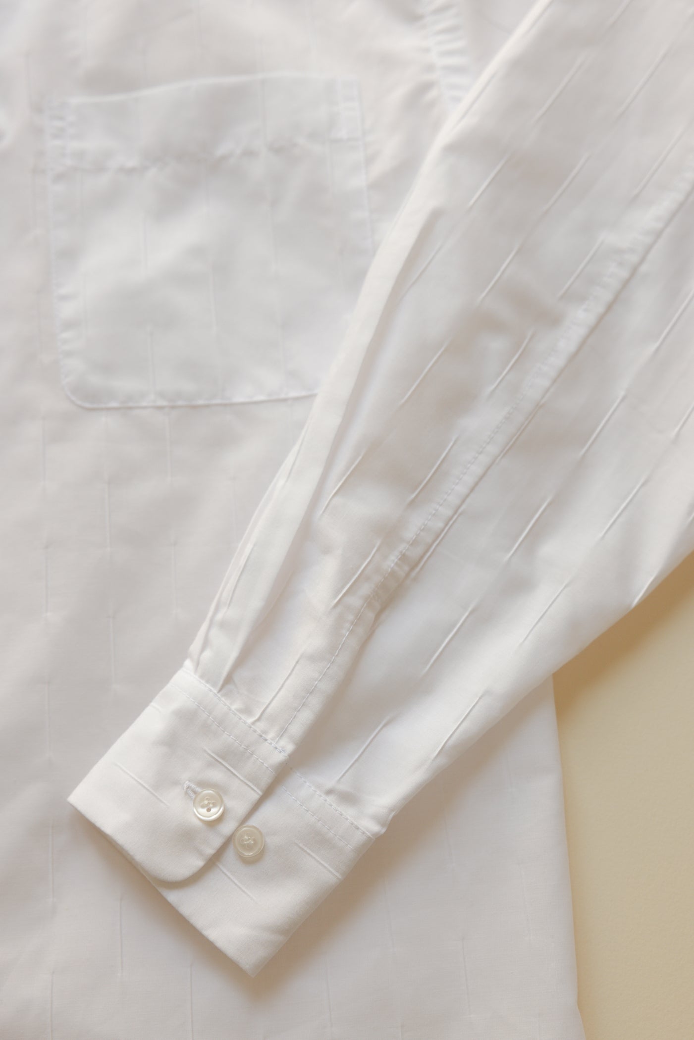 We firstly created this cut in 2022, and this is the elevated version of the initial design. It offers a relaxed fit, not too oversized, and features a rounded neckline in place of a collar, making it easy to be worn as an over-shirt as well. Crafted from a soft and pleated Italian cotton, WHITE NOISE is minimal and delicate on its own but it can be layered, too. The back features a pleated detail shaping a nice flow. There is a patched pocket on the left side and small openings on the sides. Perfect for spring or summer time, White Noise is elegant yet casual to accompany your outfit on a daily basis. Dead-stock fabric, one-off.