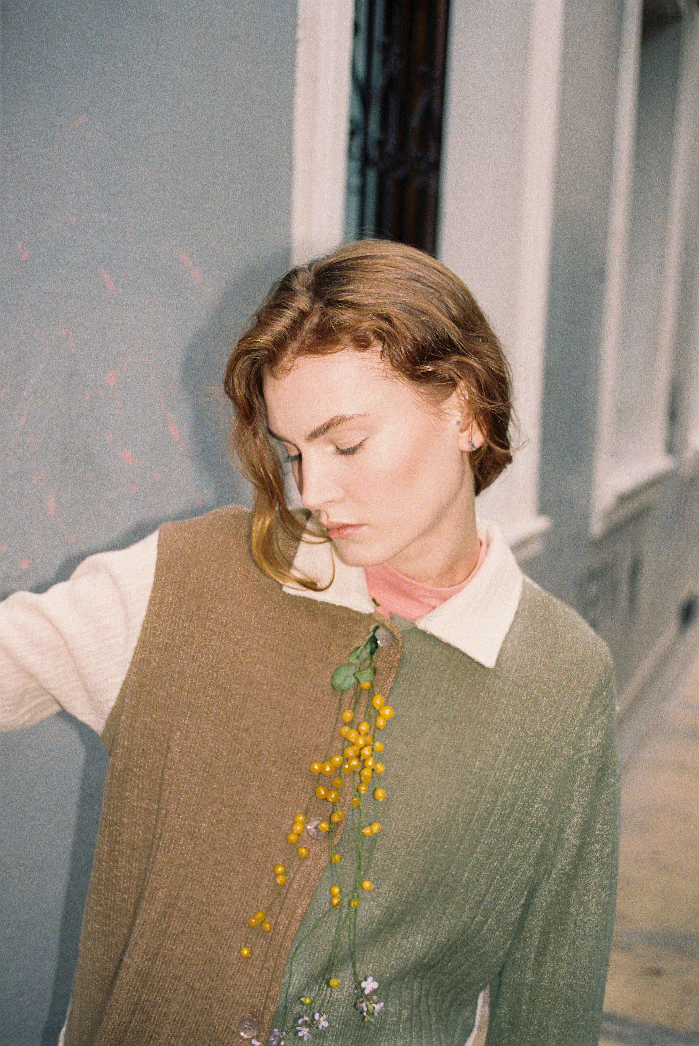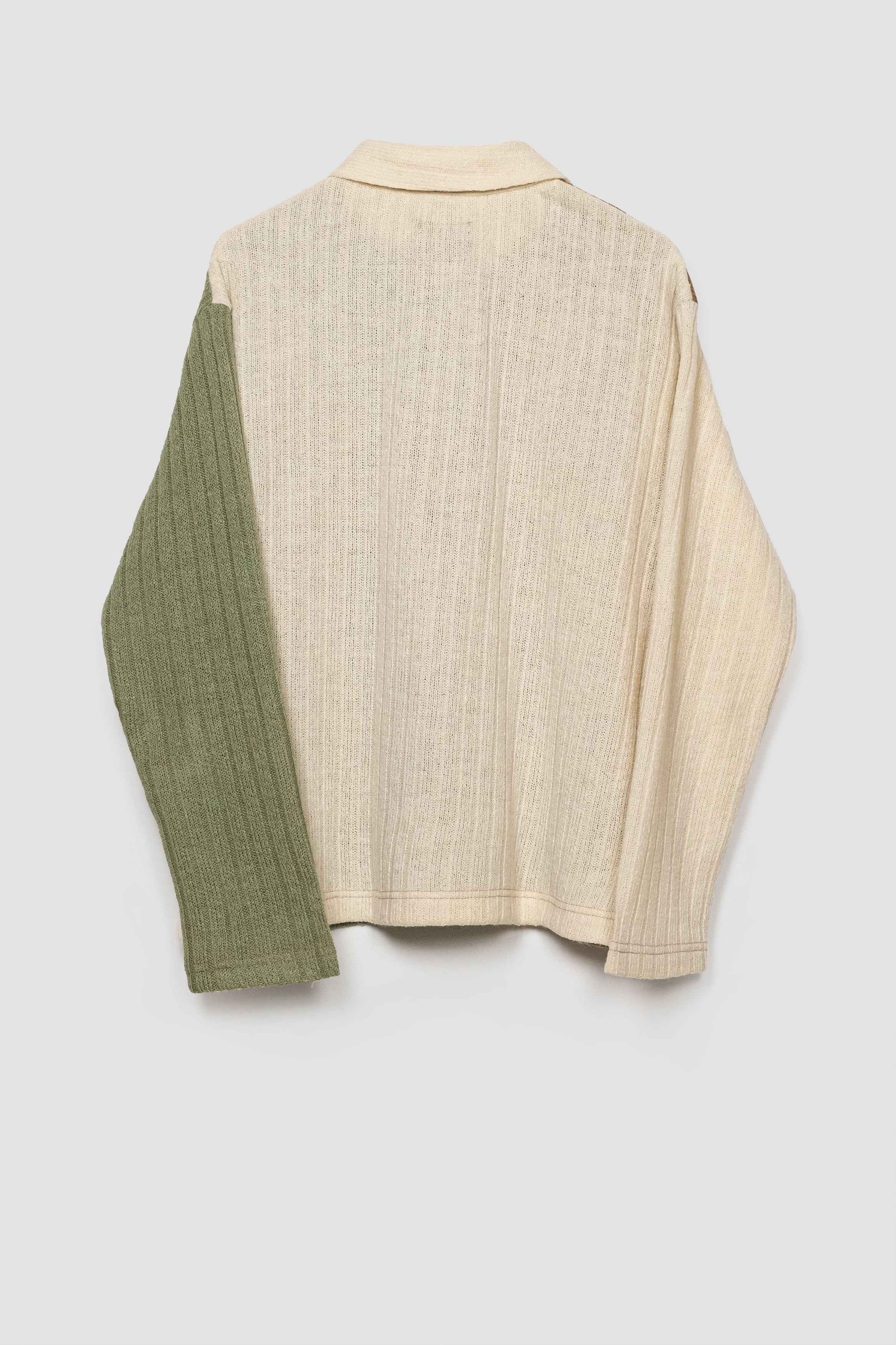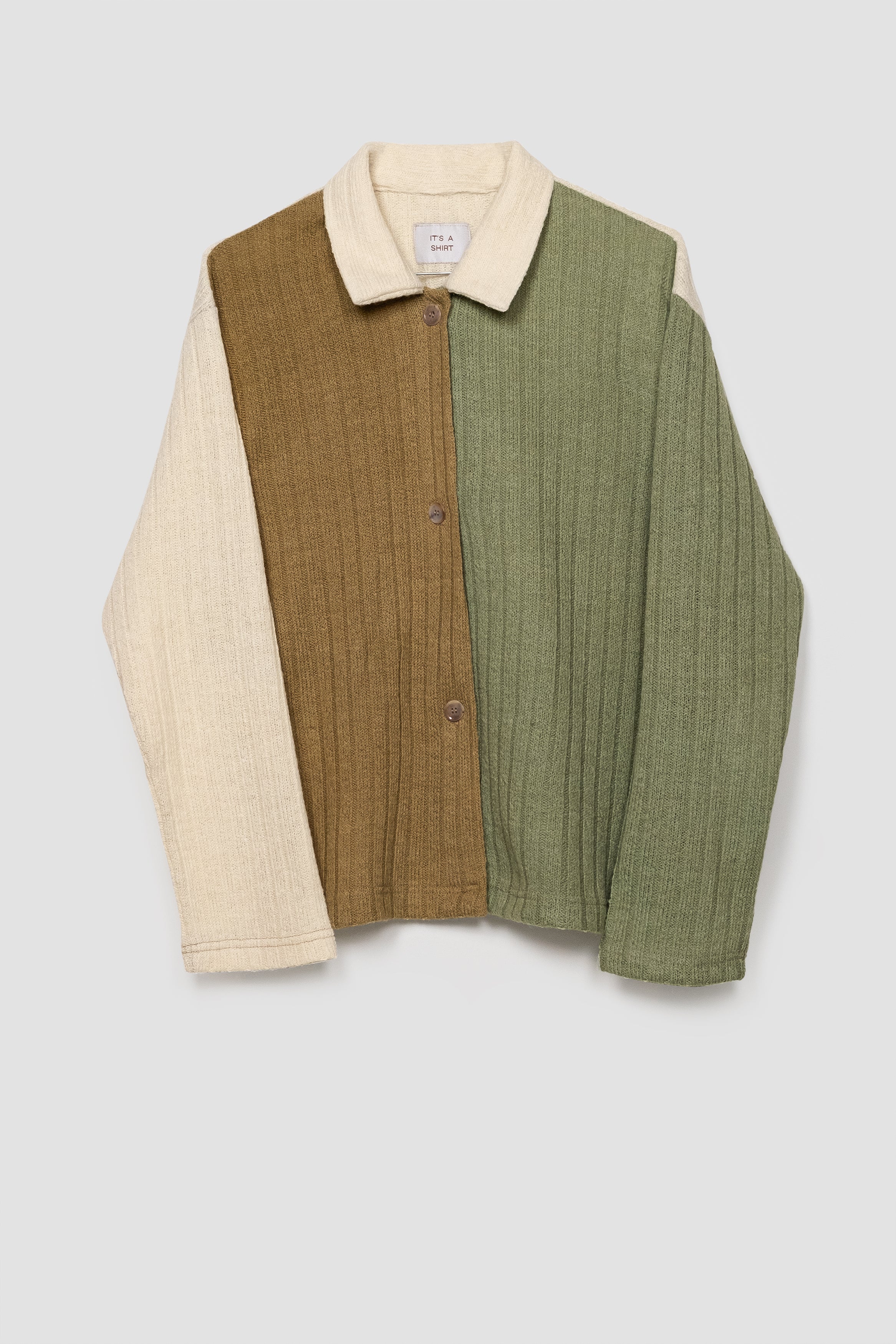 Moist: a long sleeve unisex jacket-shirt. It has a spread collar, square fit and three bone buttons on the front. The garment is made of dead-stock wool in three different colours: cream, mint and mocha. Limited garments, one size.