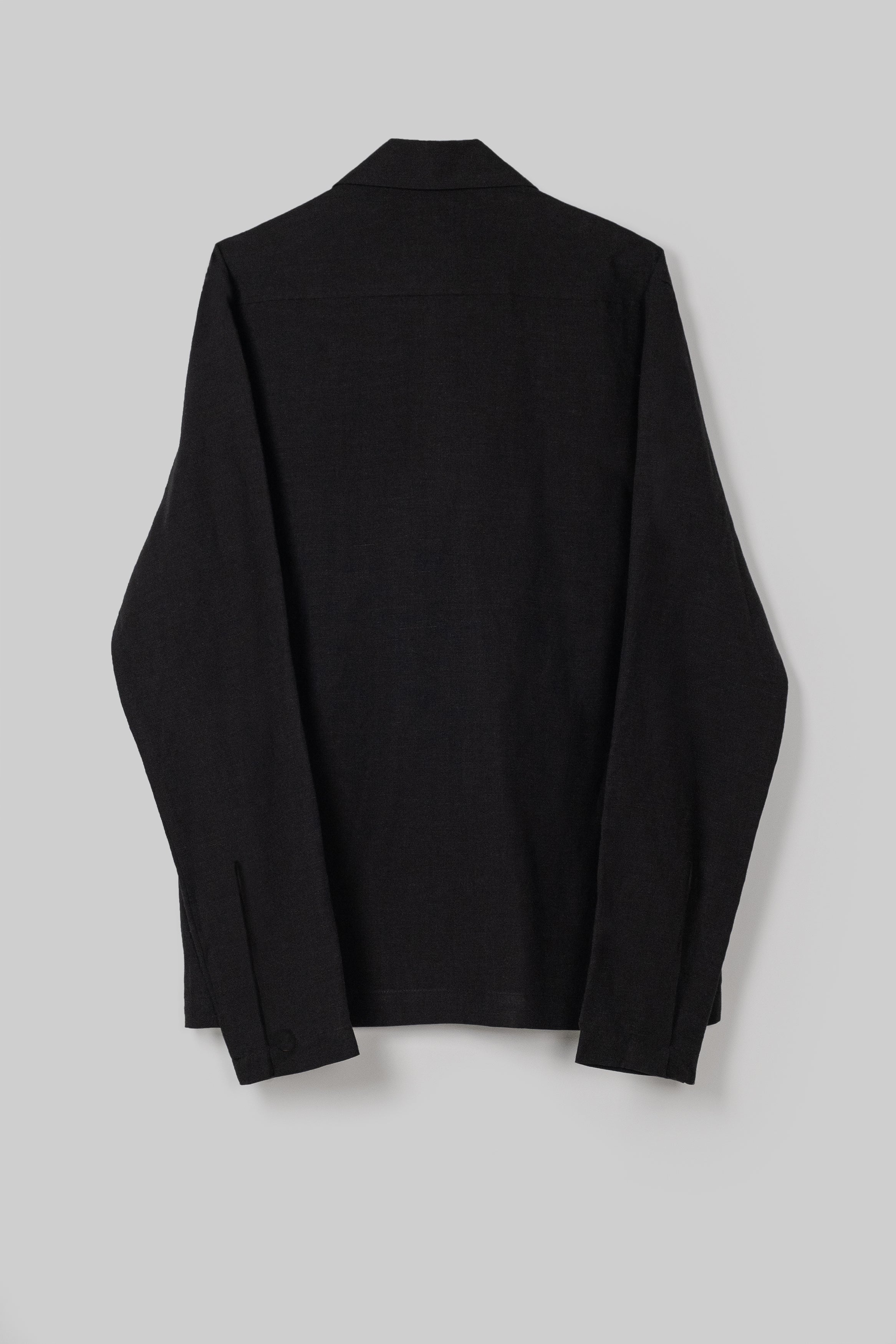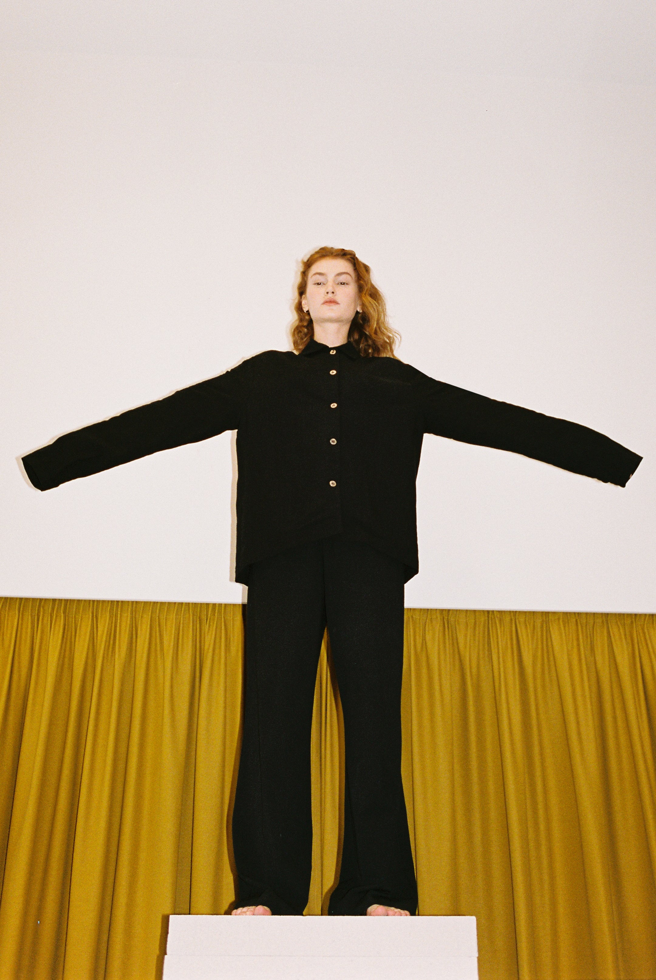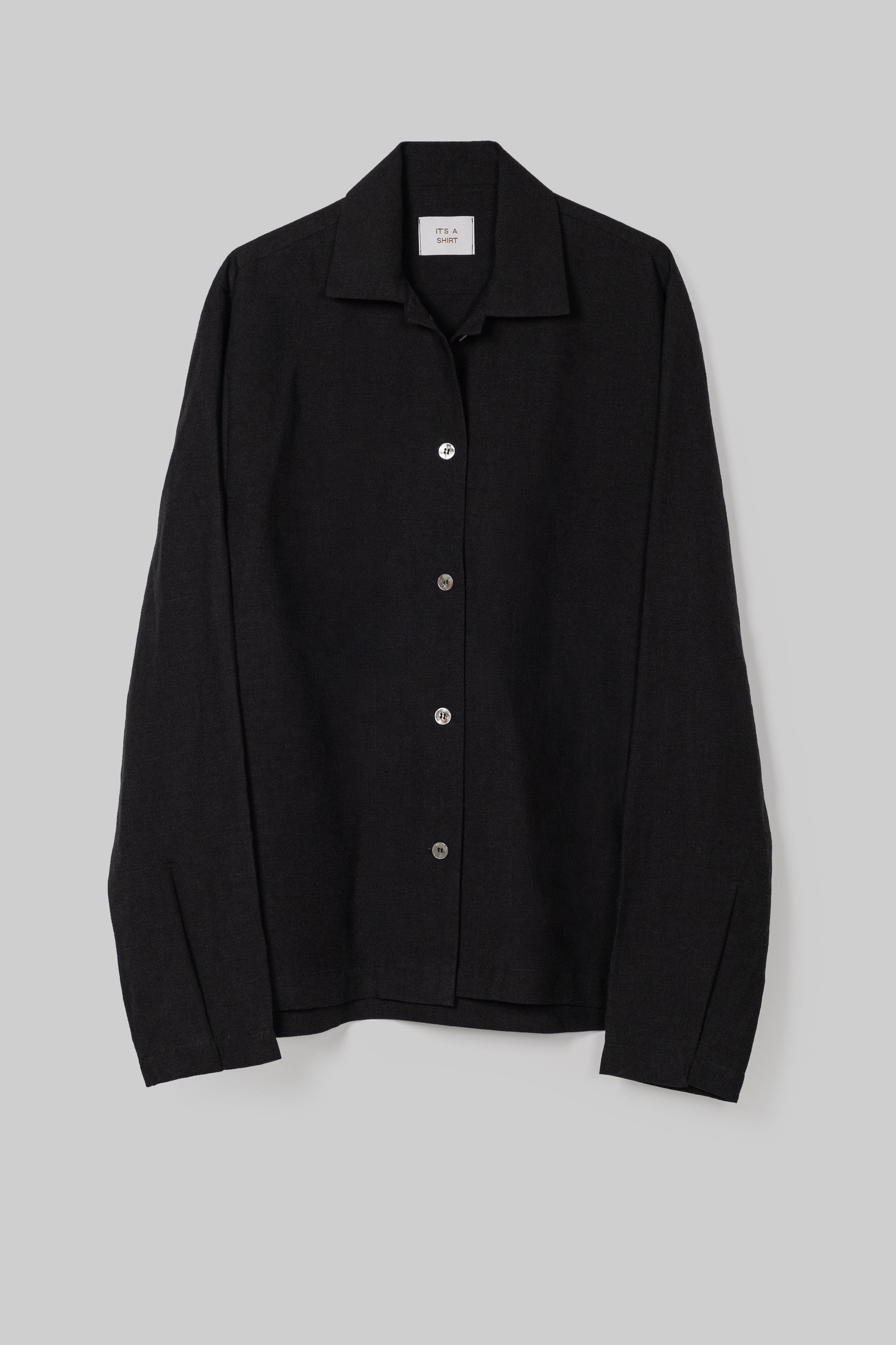 Roots: a long sleeve unisex shirt with straight and relaxed fit. It has a spread, semi-squared collar and sleeves with a pleated finishing. The garment is made of semi-weight black linen produced in Greece. Alongside the shirt there are five middle sized mother of pearl buttons. Limited garments, available in two sizes. Made in our production, Athens, Greece.