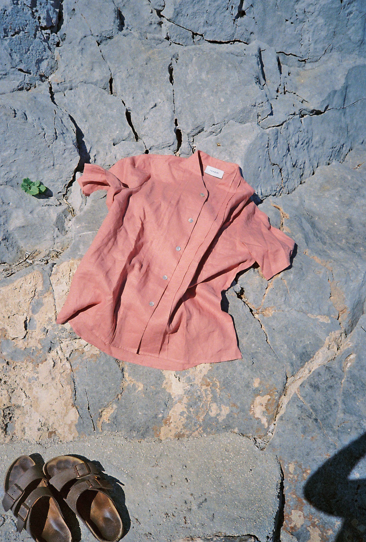 Apple Juice is a short sleeve shirt with a v-neck collar, embellished with pleats on its back and front. Our inspiration here derives from a garment Mastroianni wears in a known film directed by Fellini. The shirt is finished with mother of pearl buttons as well as with an opening on the side. This garment is easy-to-wear on a daily basis but also on special occasions. It is crafted in pink greek linen available in a limited quantity. Each and every shirt is produced in our small-family-production space.