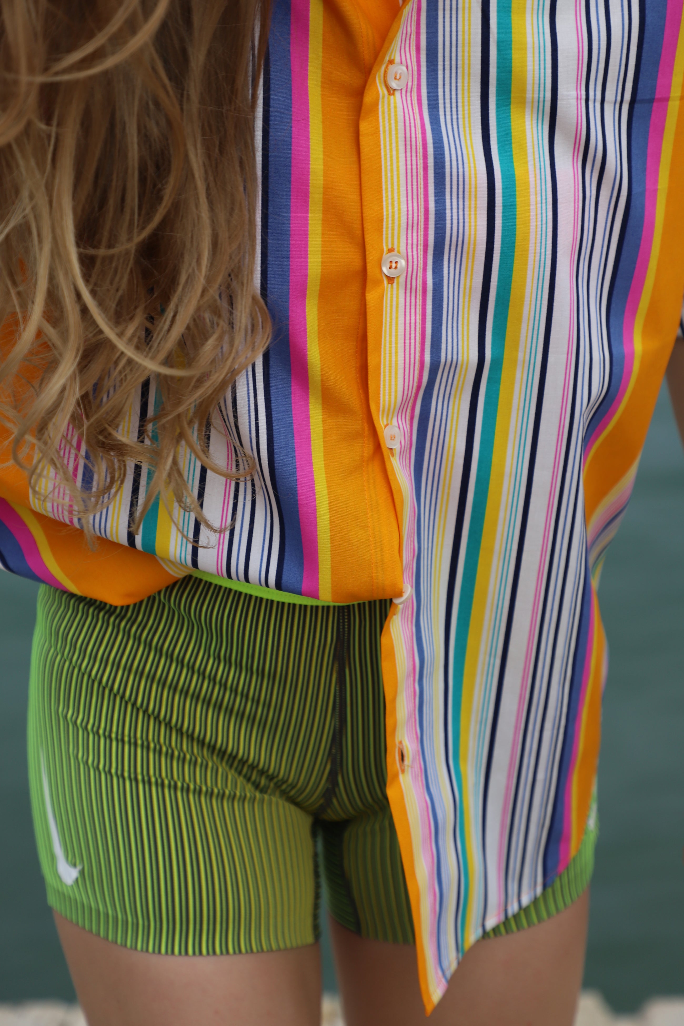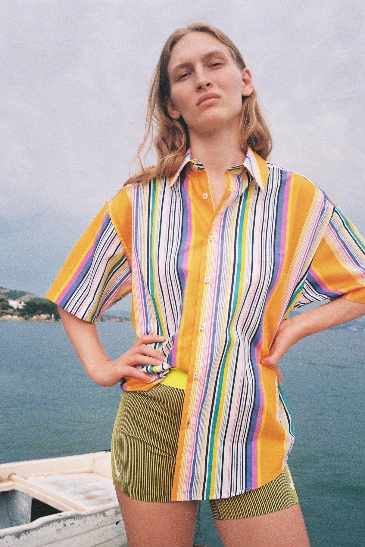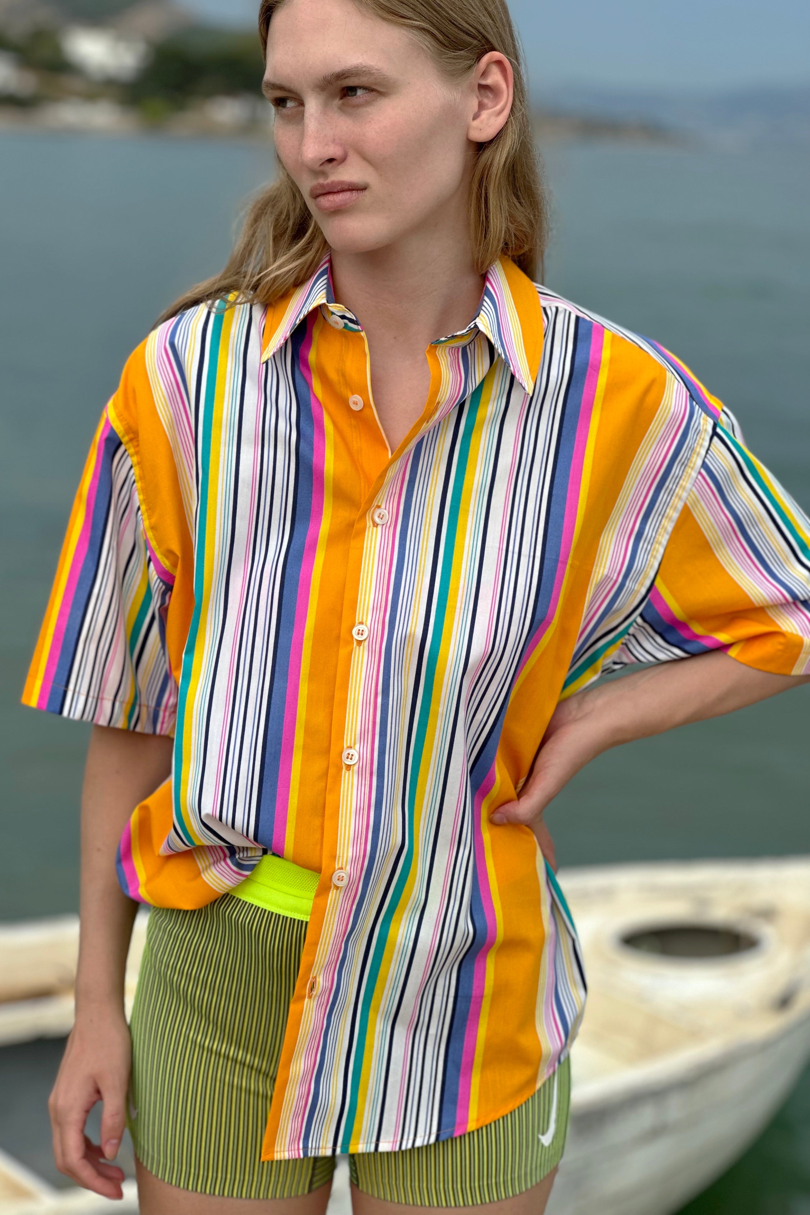 Miami Beach is a short sleeve shirt shaped in our classic timeless cut. The fit is relaxed and airy, appropriate to accompany you during the whole summer. The garment is crafted in a dead stock printed cotton full of colourful stripes. This garment is available in 3 pieces. Each and every shirt is produced in our family production space located in Athens.