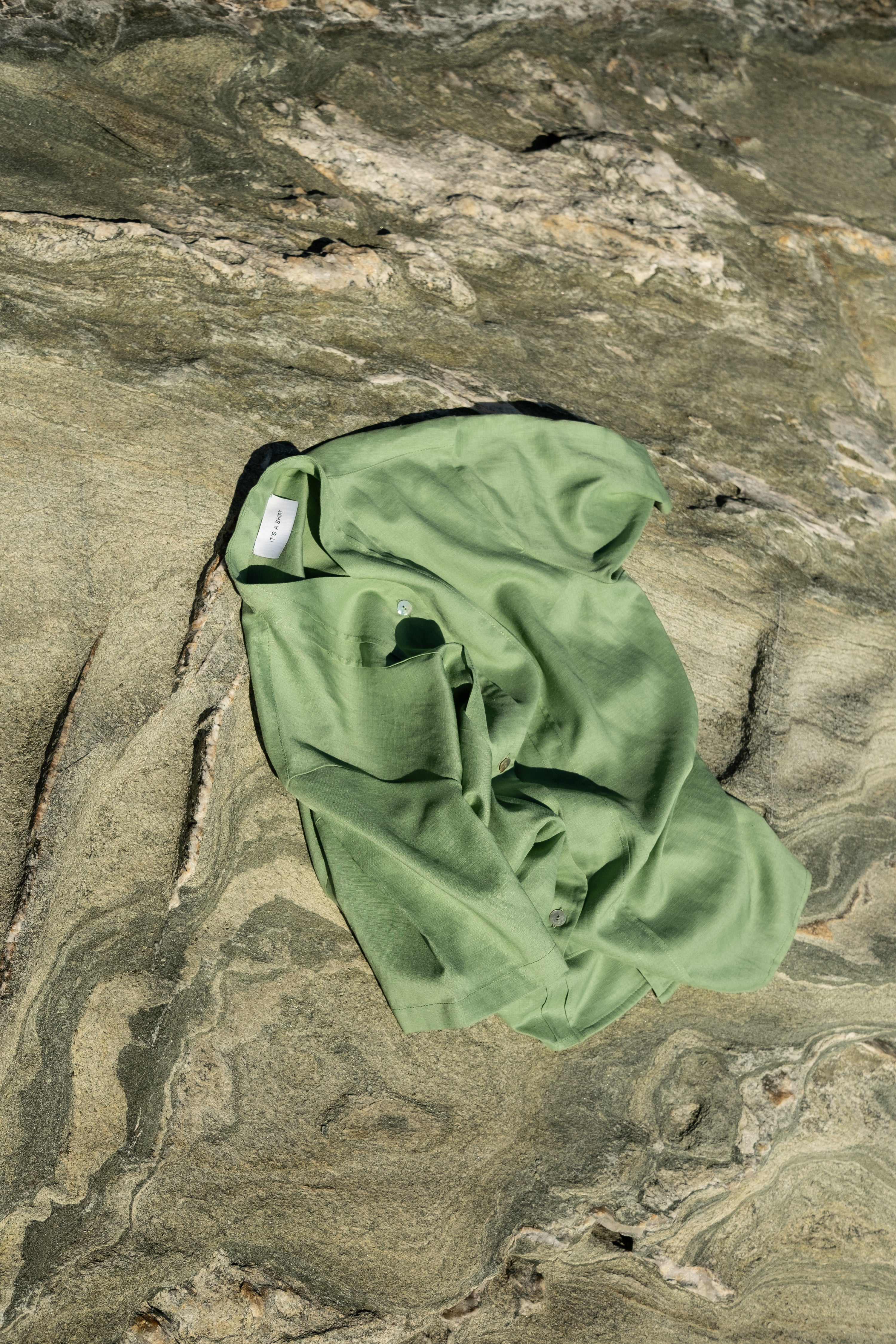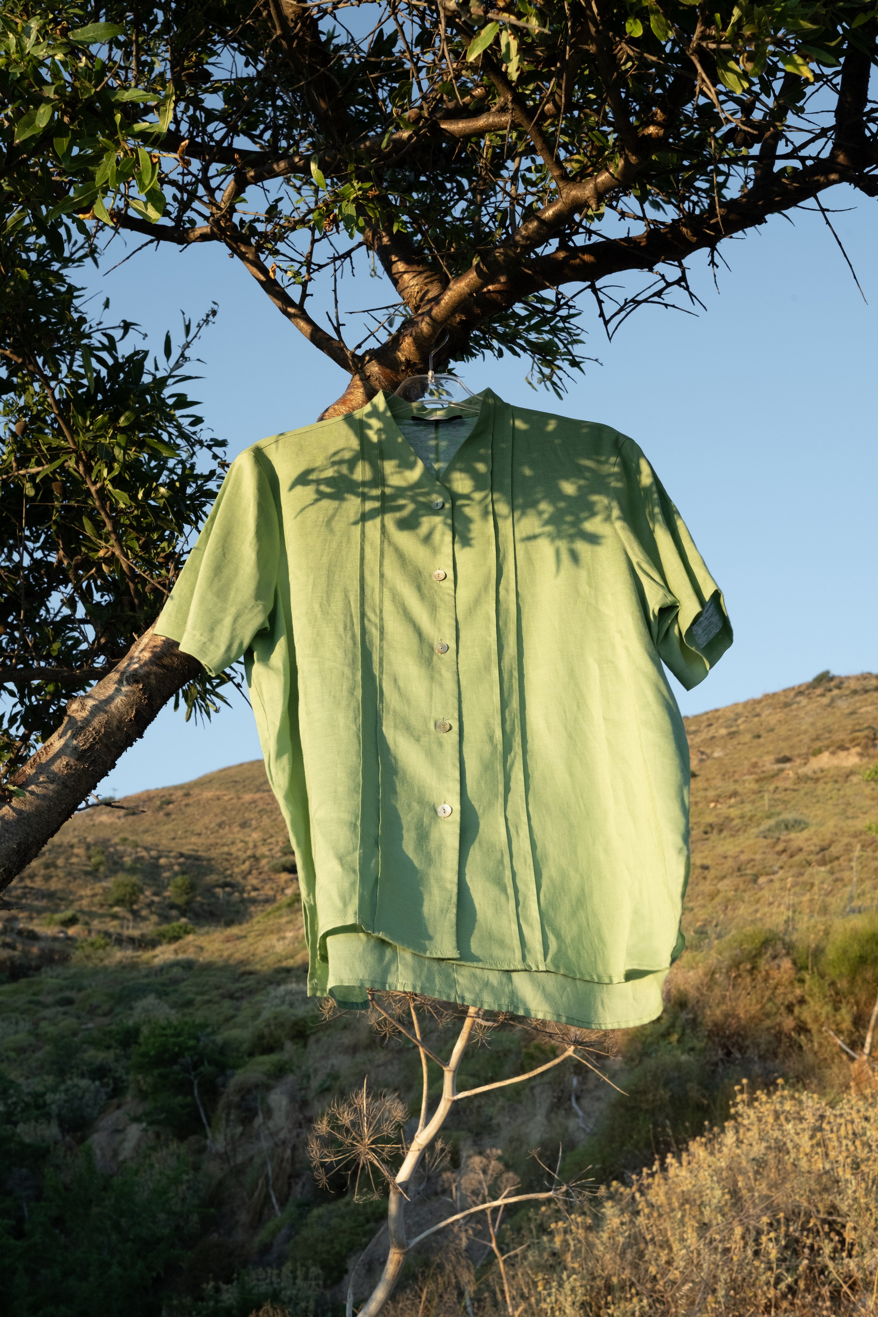 Pistachio of Aegina  is a short sleeve shirt with a v-neck collar, embellished with pleats on its back and front. Our inspiration here derives from a garment Mastroianni wears in a known film directed by Fellini. The shirt is finished with mother of pearl buttons as well as with an opening on the side. This garment is easy-to-wear on a daily basis but also on special occasions.  It is crafted in a green linen/viscose fabric available in a limited quantity. Each and every shirt is produced in our small-family-production space.