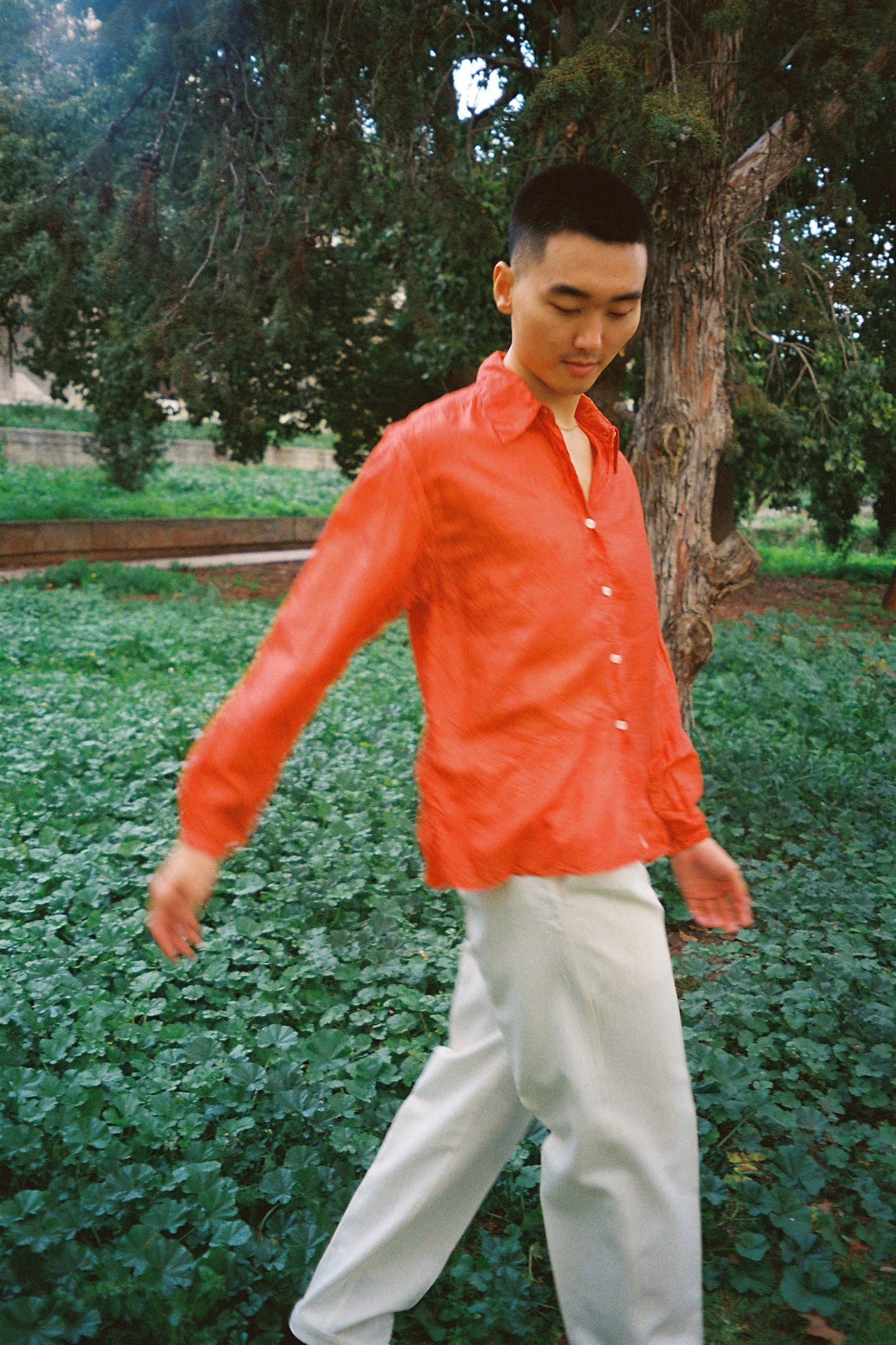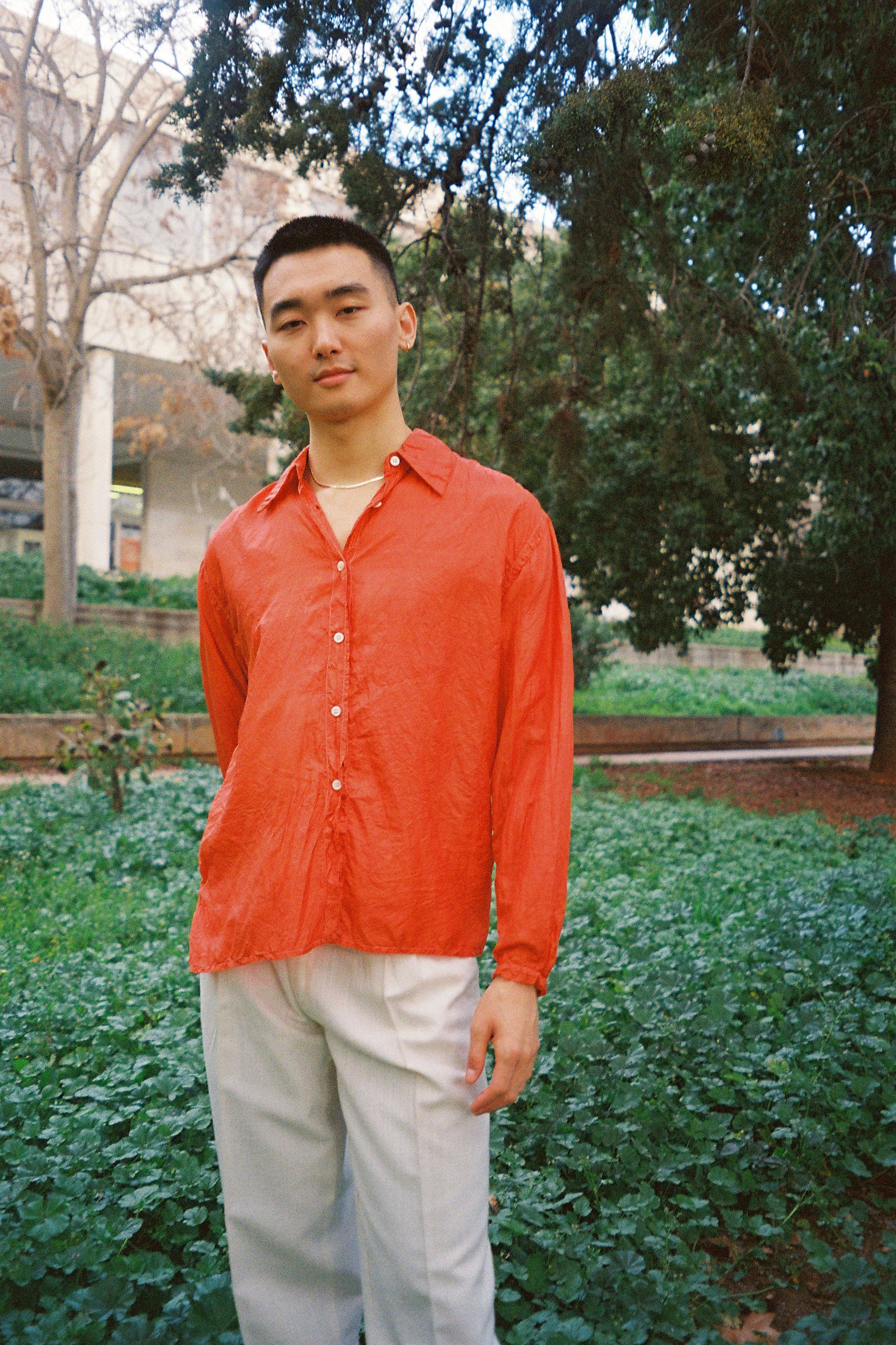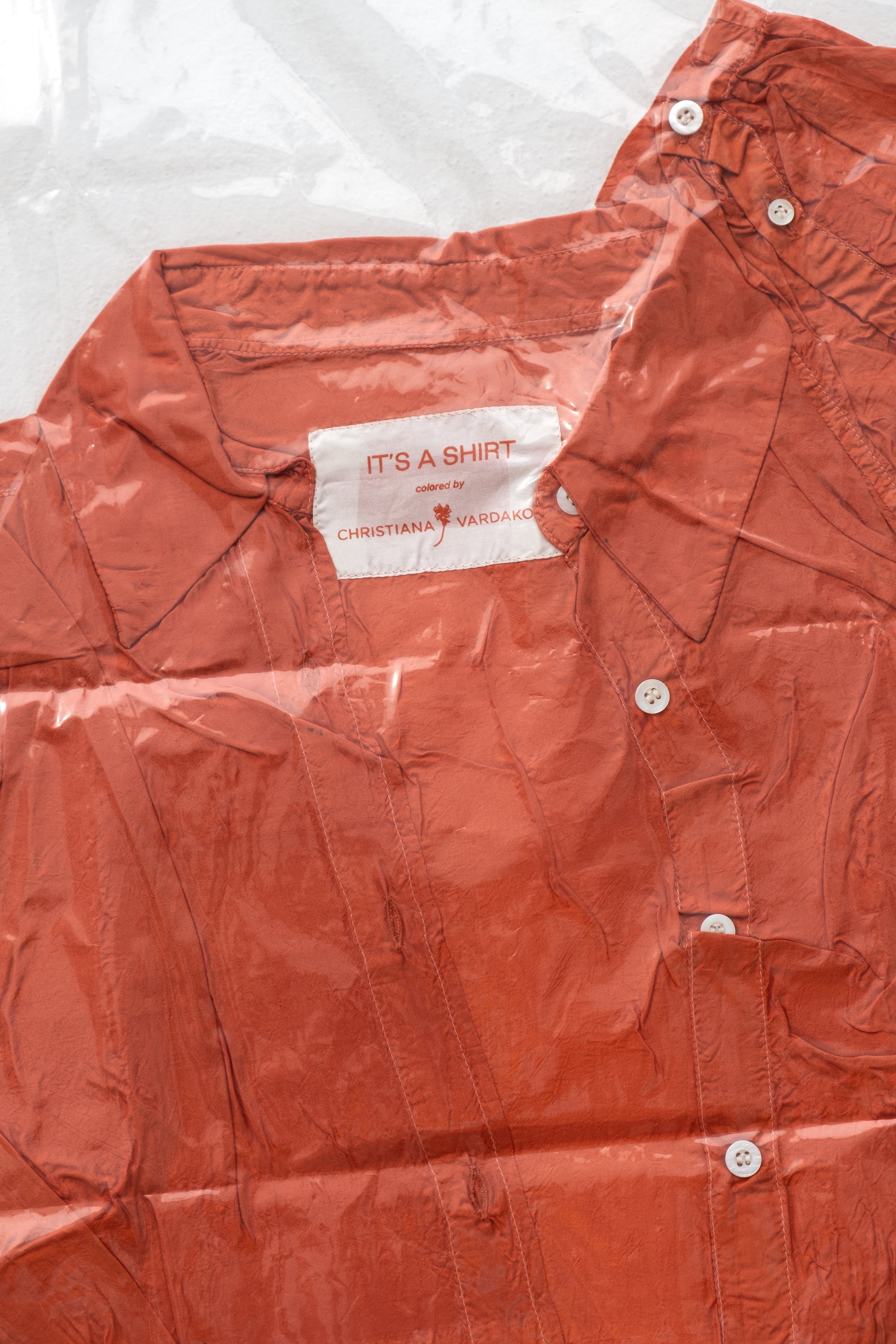 RUBIA is 1 out of the 5 silk shirts that have been naturally dyed by Christiana Vardakou using rubia tinctorum roots. Each and every shirt is unique and different from the other. Its label is created from the fabric off-cuts and has been screen printed exclusively for this collaboration. The silk shirt is finished with beautiful off-white mother of pearl buttons.
