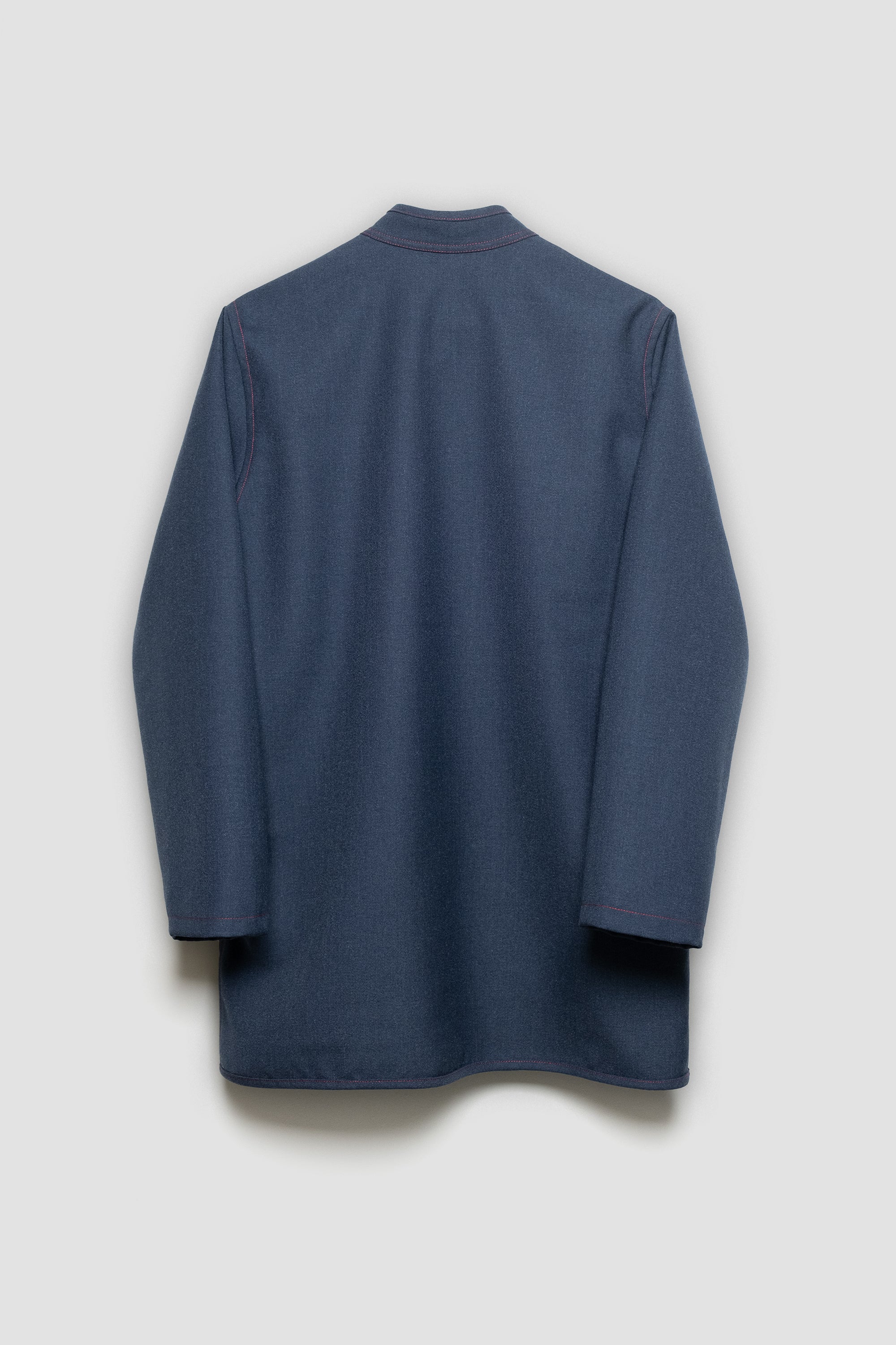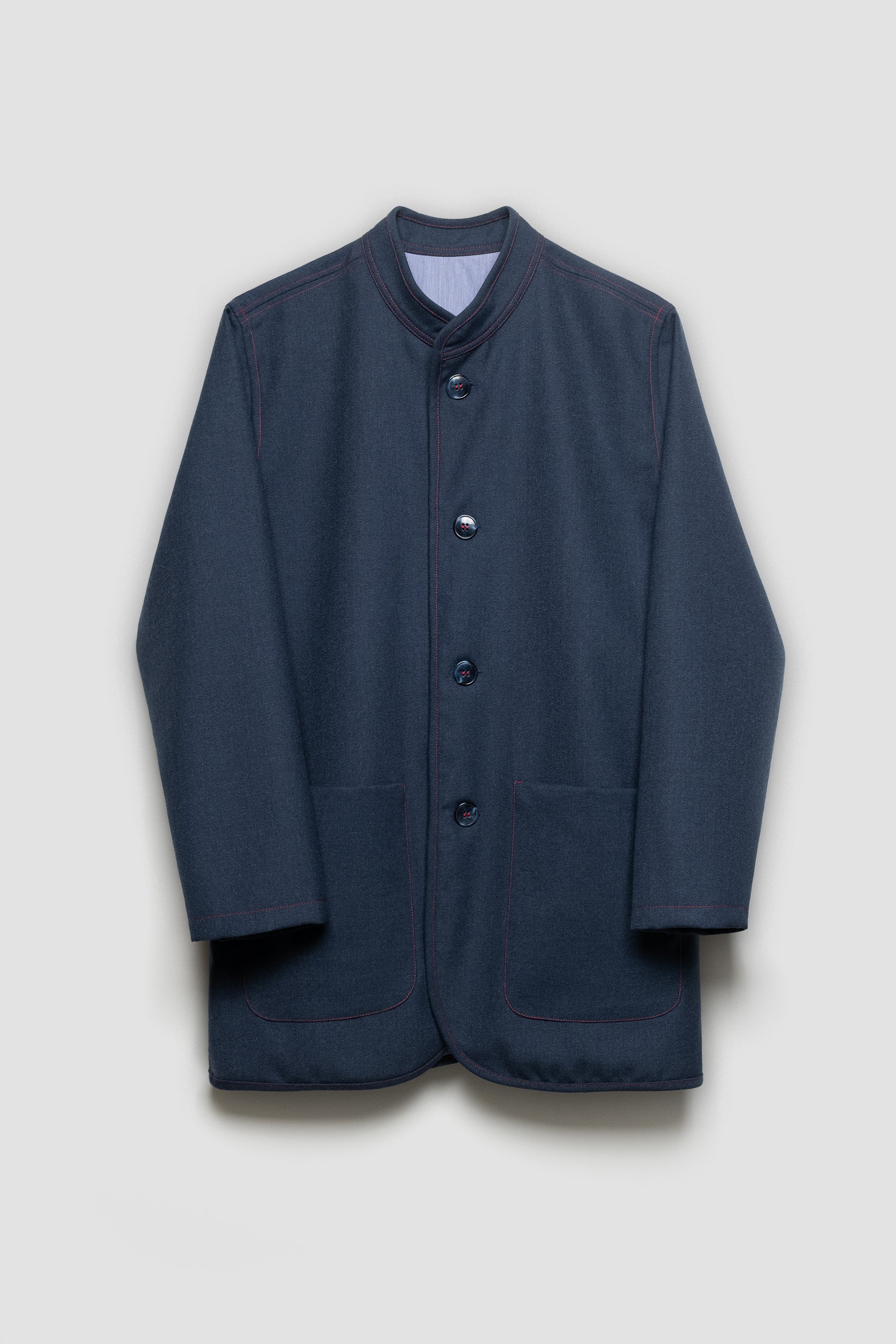 Using greek wool fabric which was produced for the national air force uniforms during 90's, we tailored this refined jacket. It owns a unisex fit with an asian twist, a mandarin standing collar, two generous pockets on the front as well as two inner pockets. The garment is finished with a soft cotton lining and red contrast stitching.