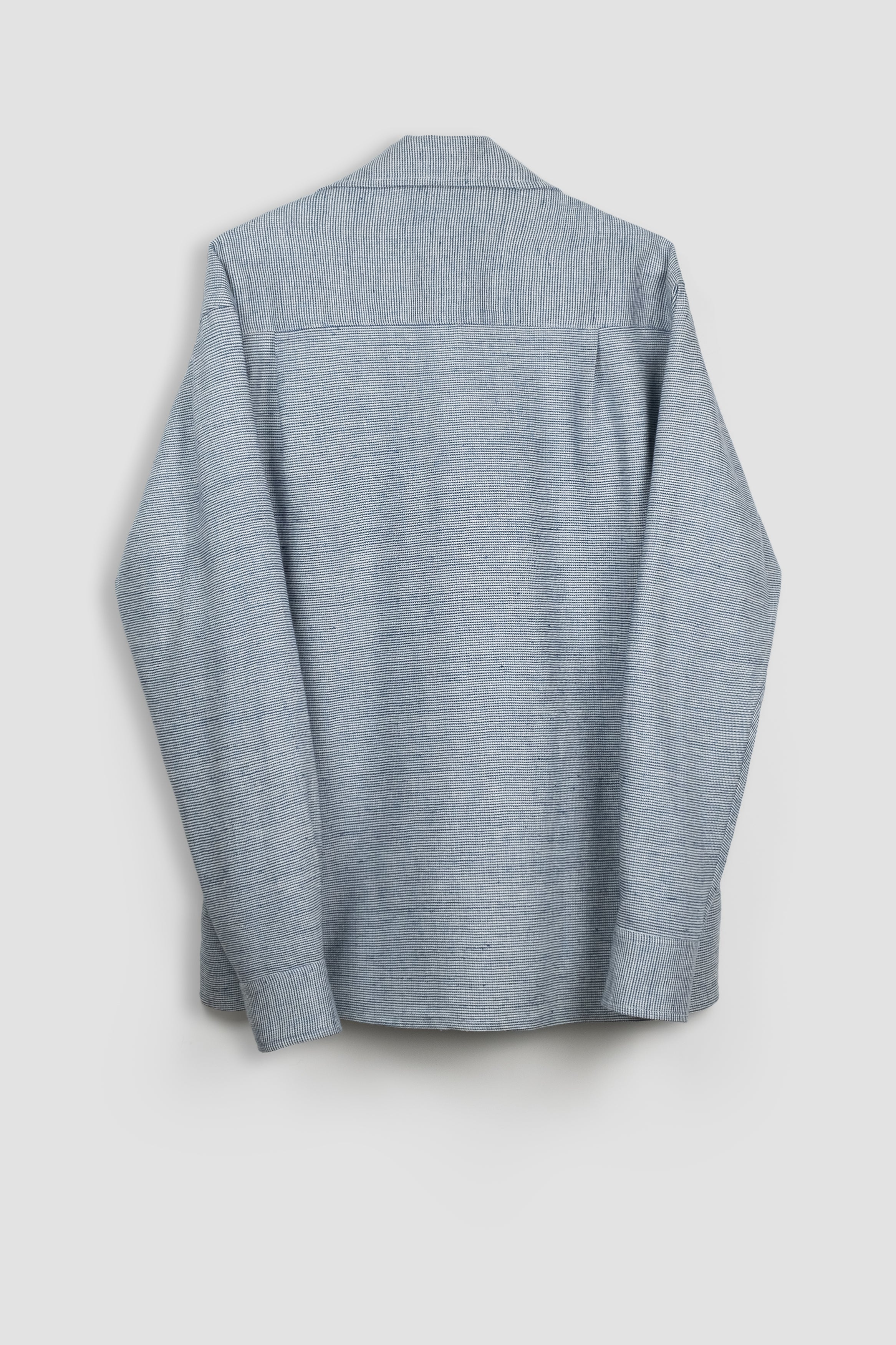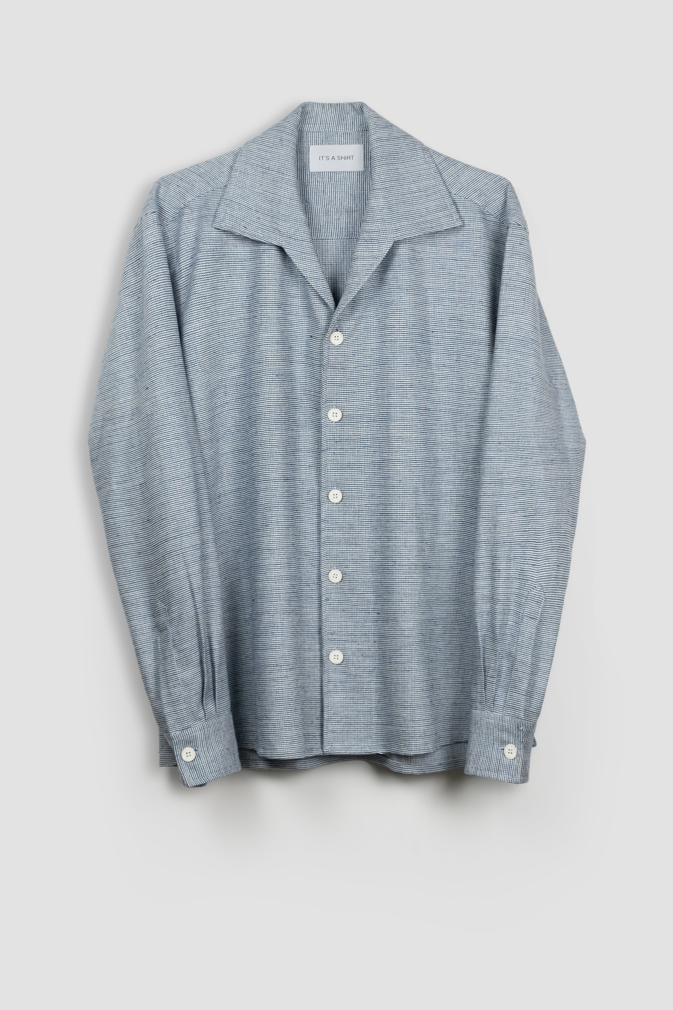 The nightshift wool a long sleeve unisex shirt with a boxy generous fit. It has a spread collar which is a continuation of the body and not a separate part of the shirt. The garment is made of a rare dead-stock wool produced in Italy. Alongside the shirt there are five middle sized white bone buttons.