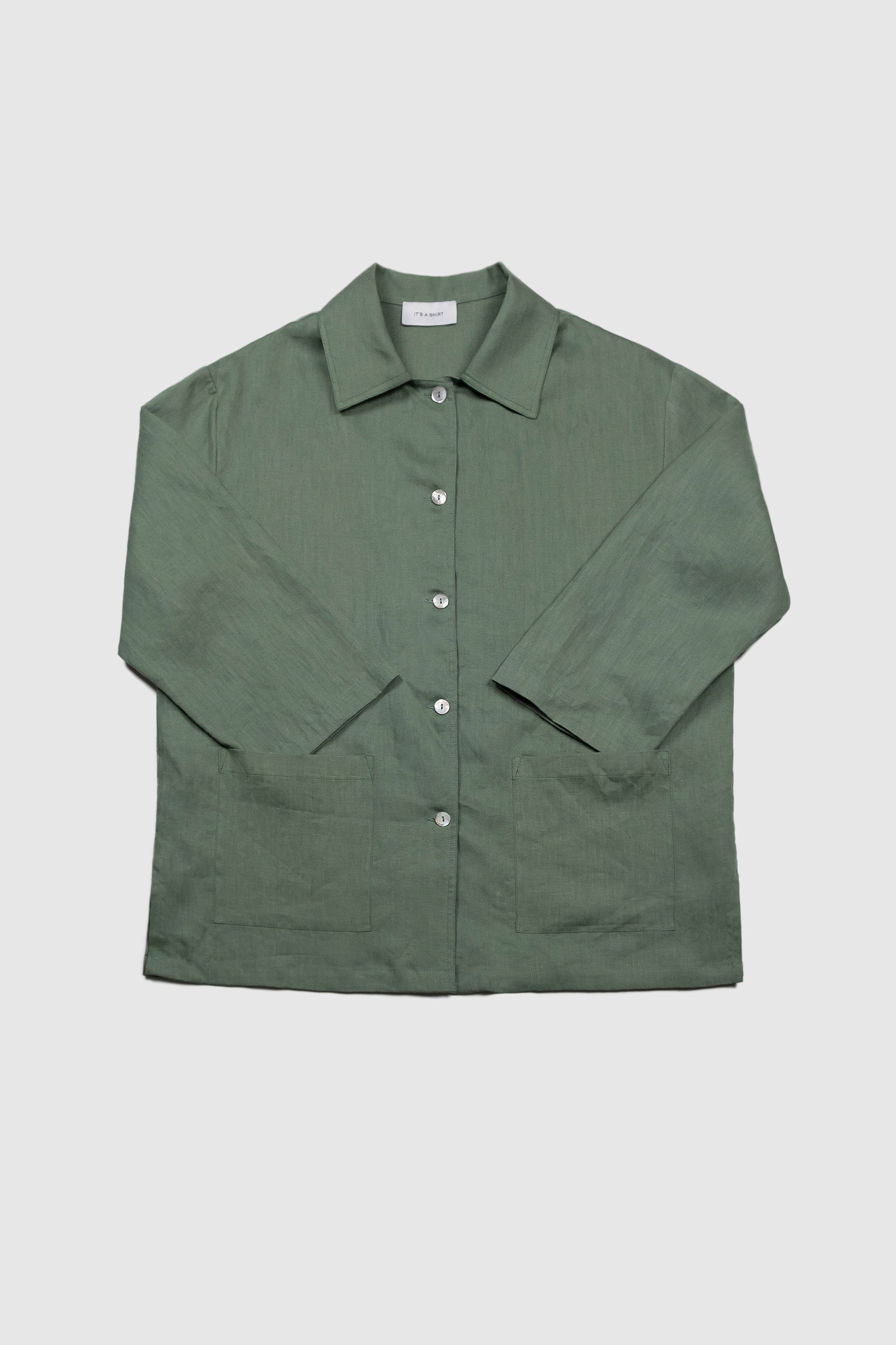 Eucalyptus is a unisex 3/4 sleeve shirt made from 100% greek linen in olive green colour. The garment has a wide collar, two big front patch pockets and is finished with medium-sized mother of pearl buttons. Its shape makes it a timeless shirt to be worn with layering or not.